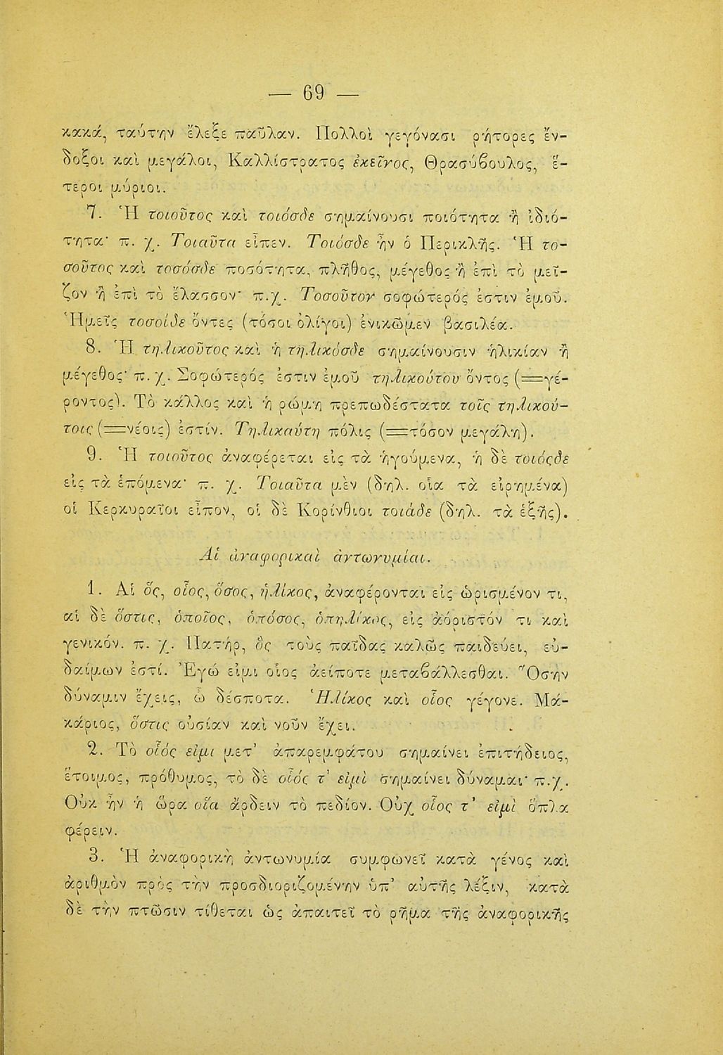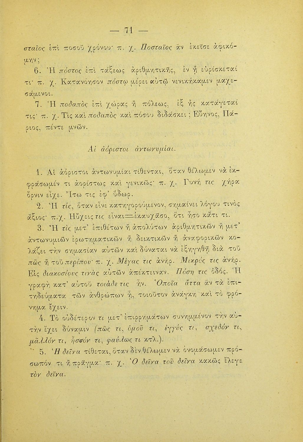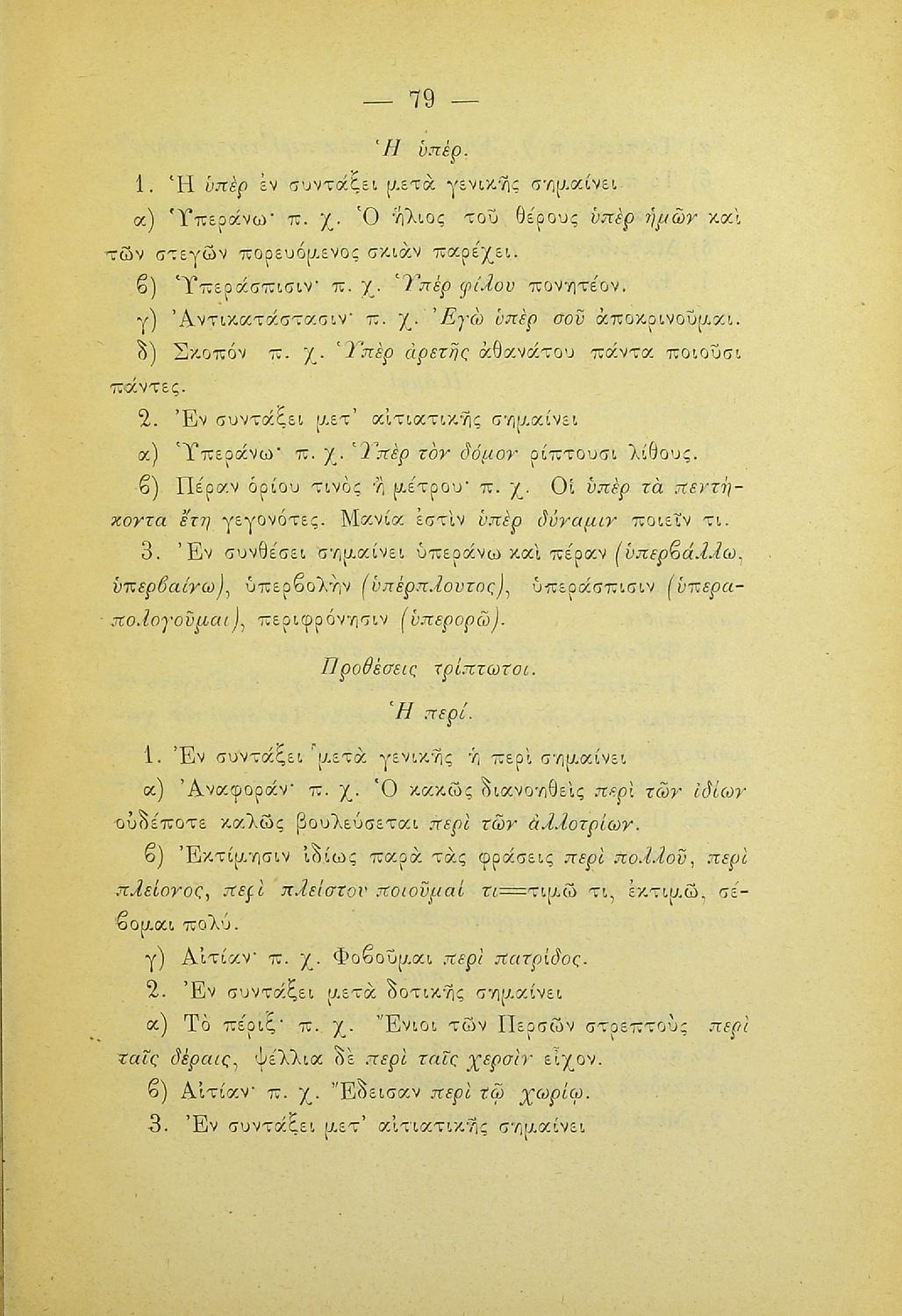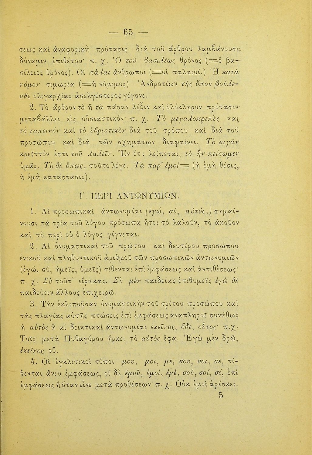 Σχολικό εγχειρίδιο Αρχαίων Ελληνικών για τα Ελληνικά Σχολεία και Παρθεναγωγεία που περιλαμβάνει κανόνες της γραμματικής της αρχαίας ελληνικής και είναι χωρισμένη στο φθογγολογικό και στο τυπολογικό μέρος.