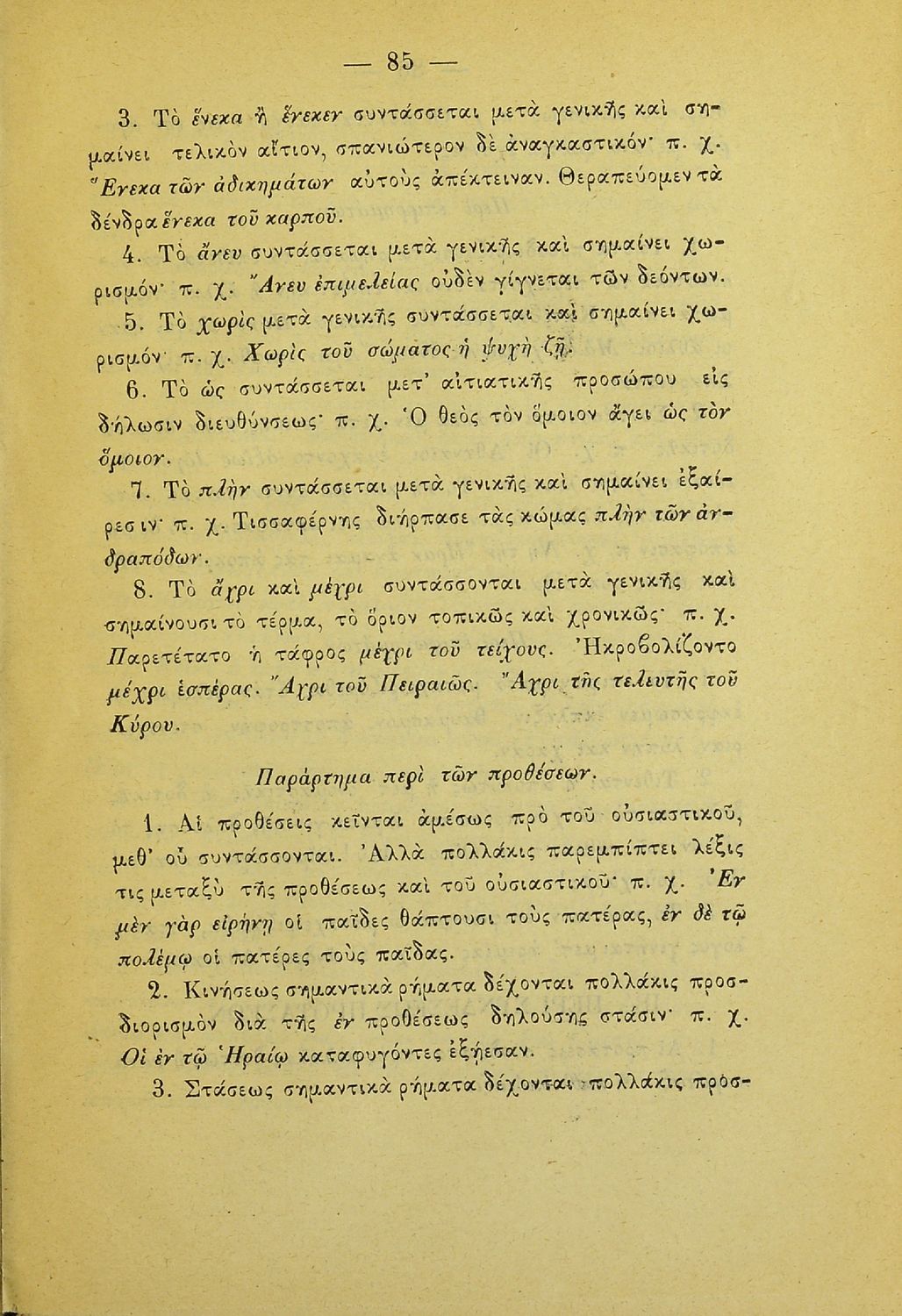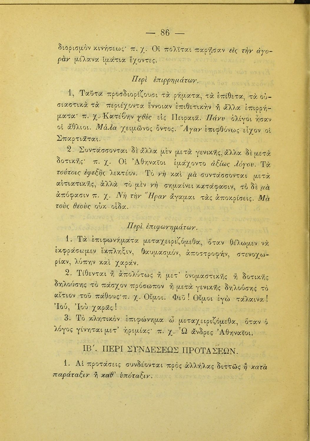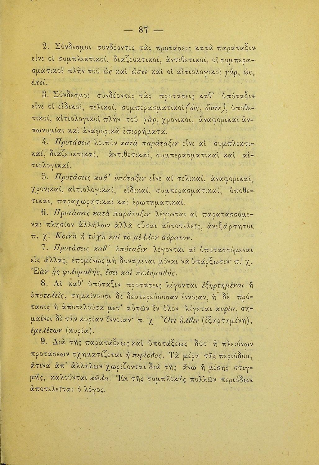 Σχολικό εγχειρίδιο Αρχαίων Ελληνικών για τους μαθητές των Ελληνικών Σχολείων και Παρθεναγωγείων που εξετάζει τα μέρη του λόγου και την σύνταξή τους.