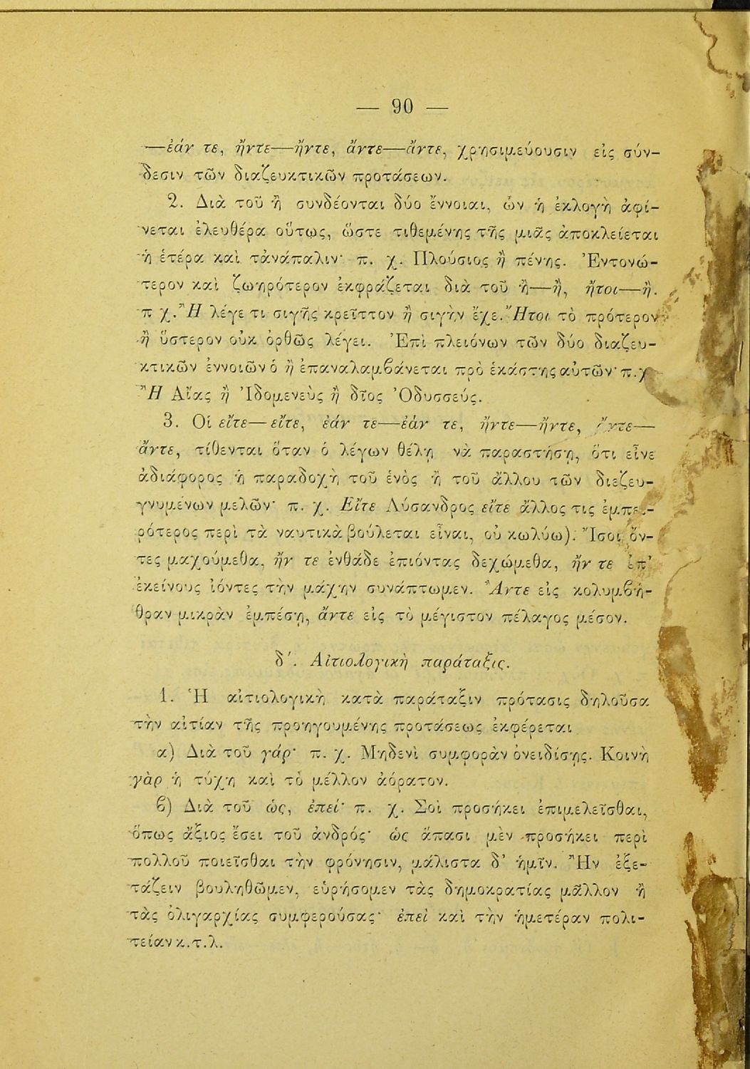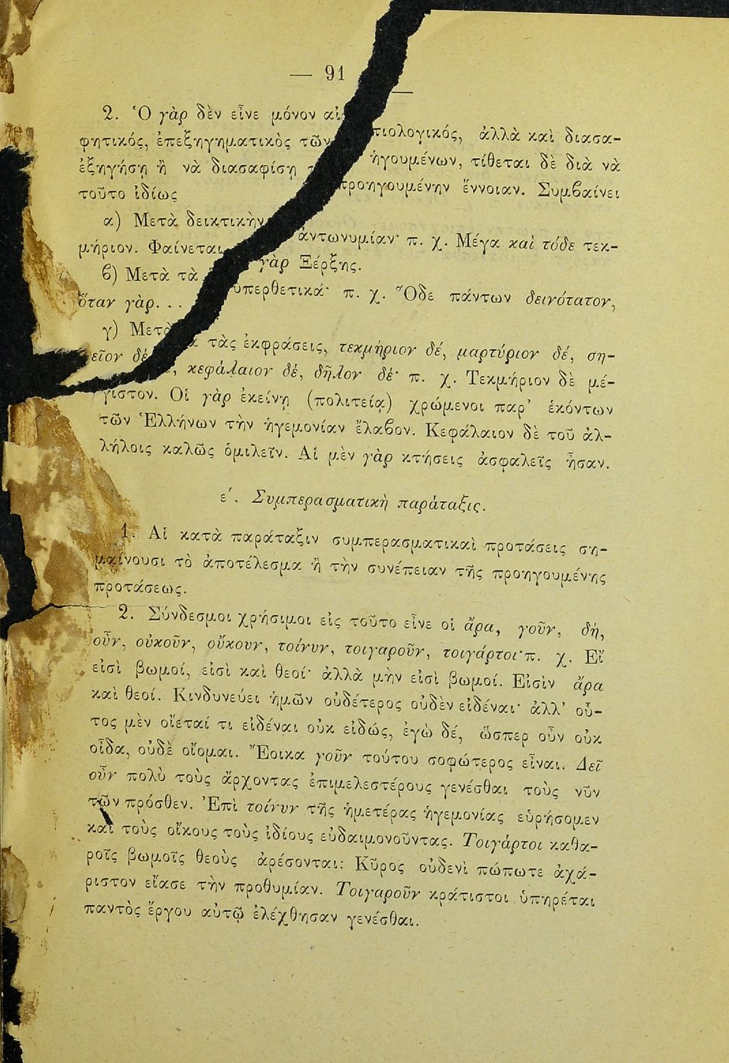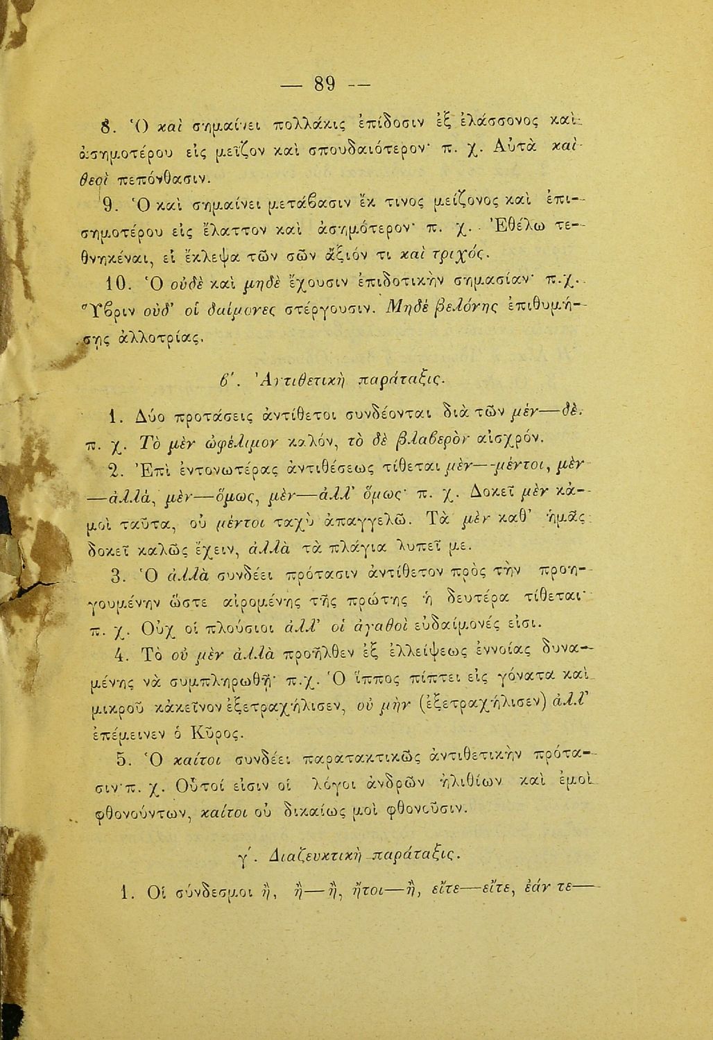 Σχολικό εγχειρίδιο Αρχαίων Ελληνικών για τους μαθητές των Ελληνικών Σχολείων και Παρθεναγωγείων που εξετάζει τα μέρη του λόγου και την σύνταξή τους.