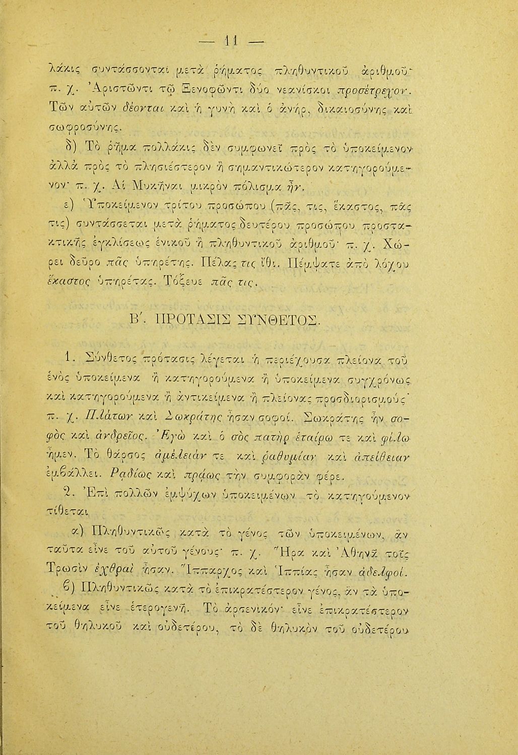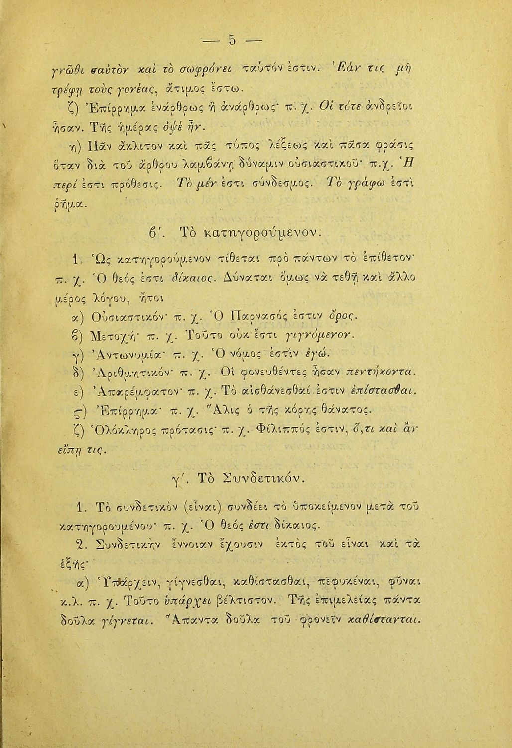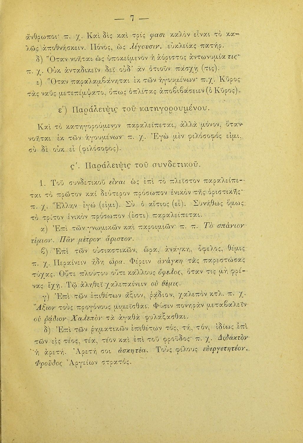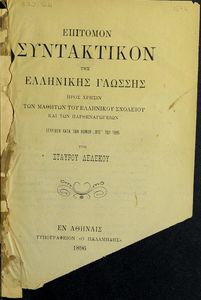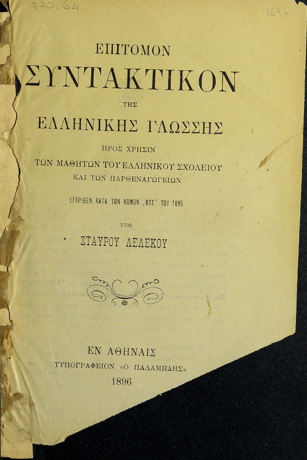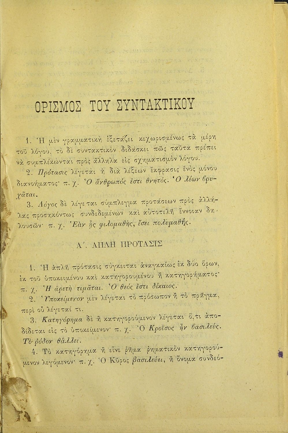 Σχολικό εγχειρίδιο Αρχαίων Ελληνικών για τους μαθητές των Ελληνικών Σχολείων και Παρθεναγωγείων που εξετάζει τα μέρη του λόγου και την σύνταξή τους.