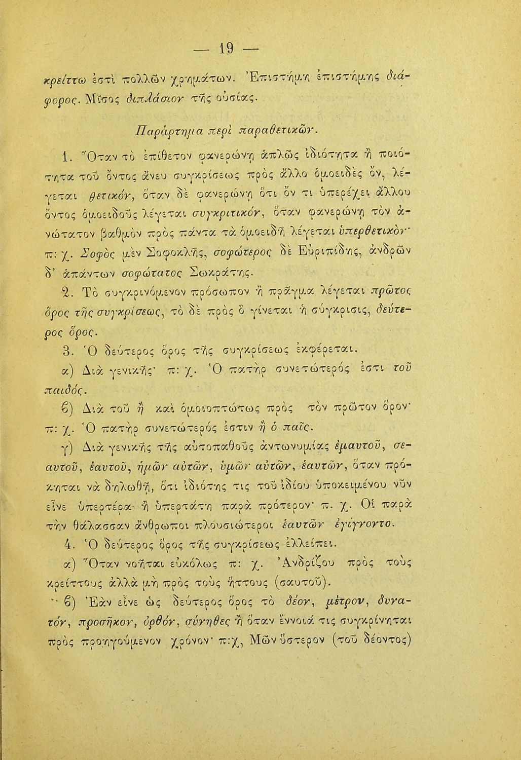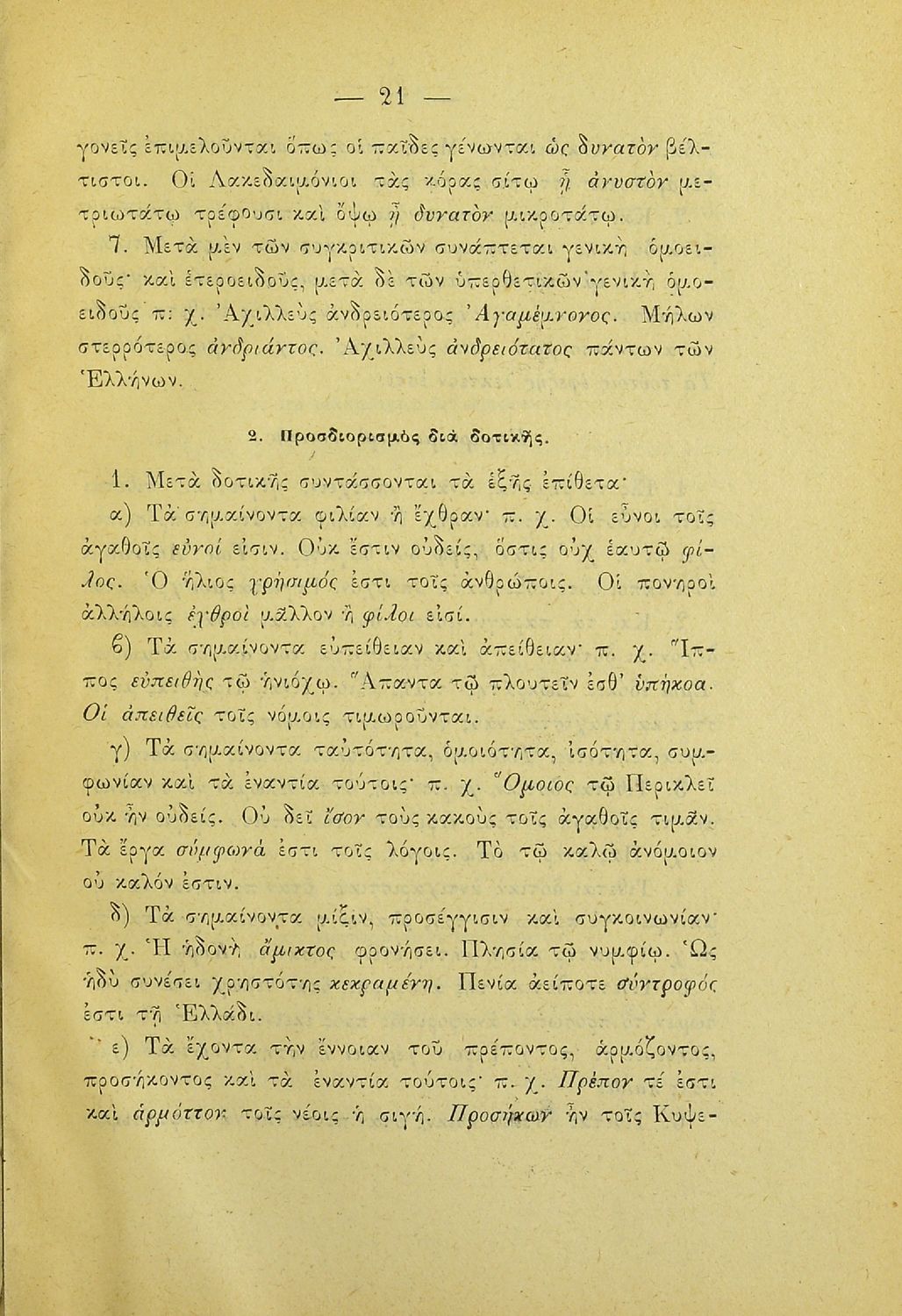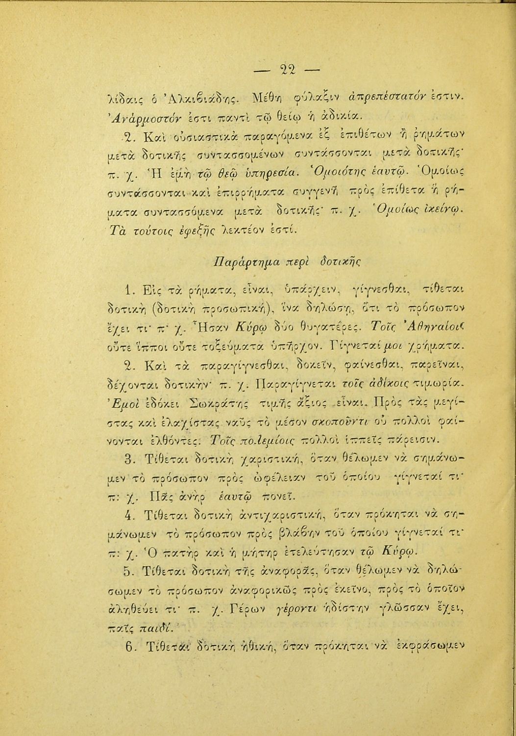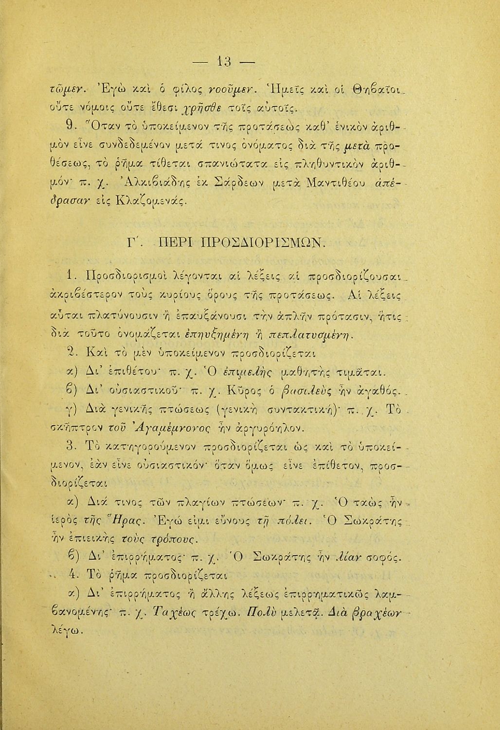 Σχολικό εγχειρίδιο Αρχαίων Ελληνικών για τους μαθητές των Ελληνικών Σχολείων και Παρθεναγωγείων που εξετάζει τα μέρη του λόγου και την σύνταξή τους.