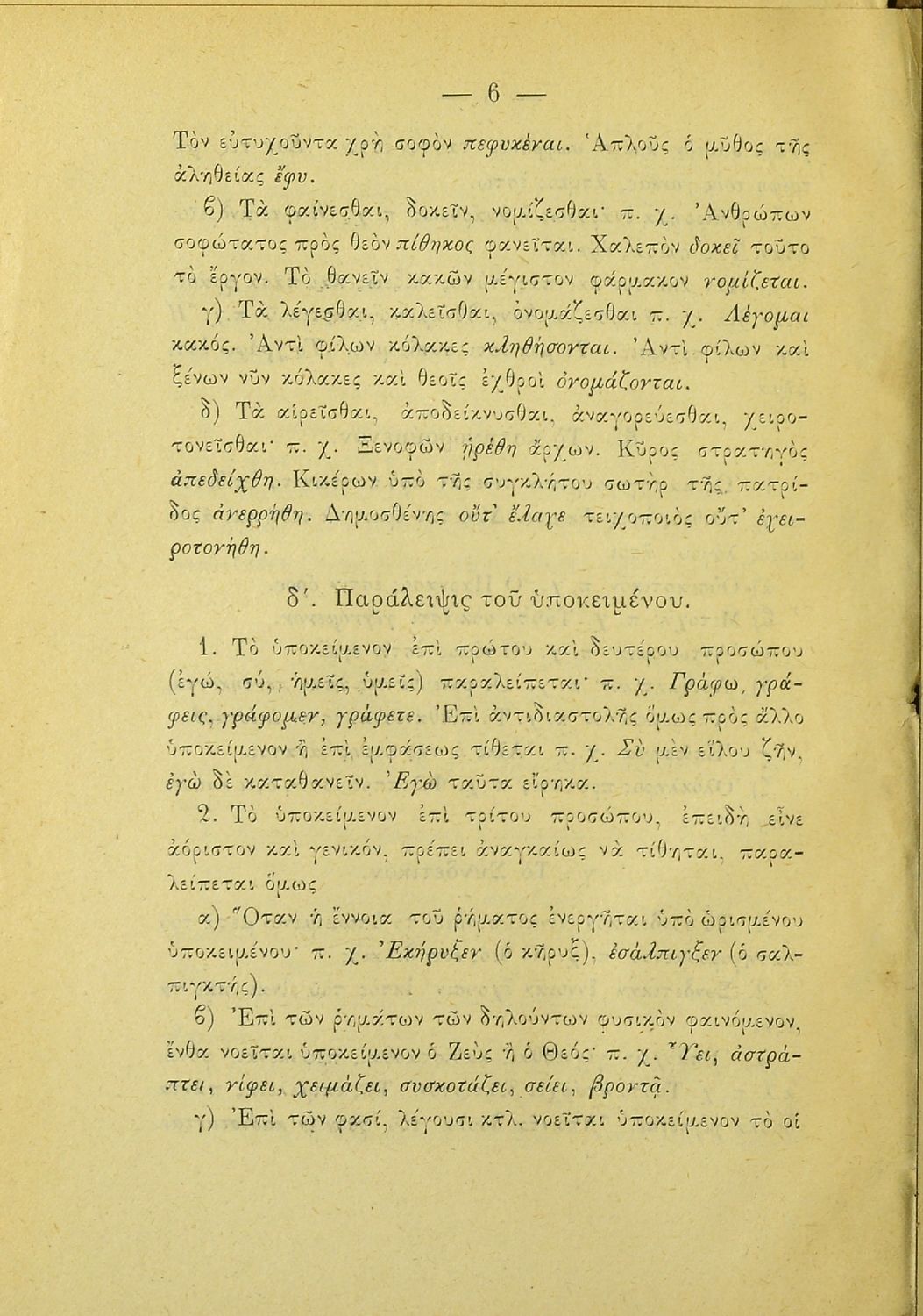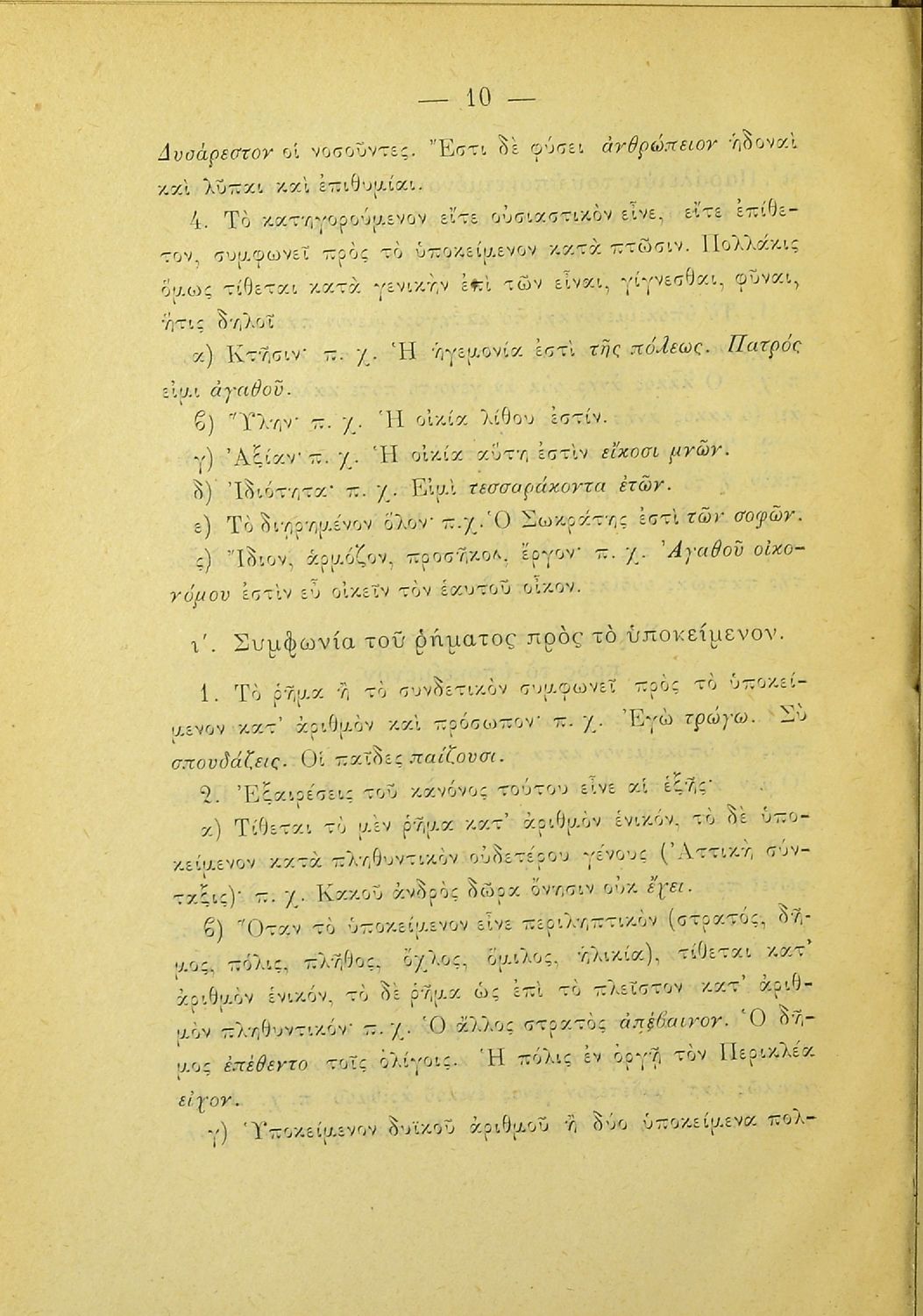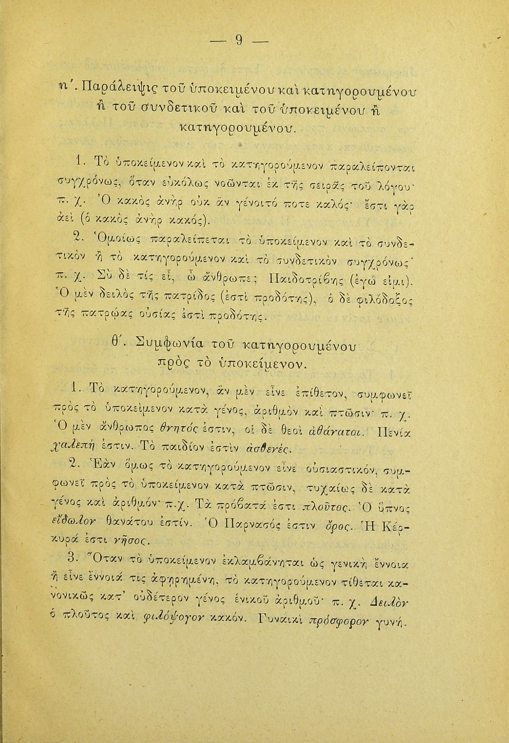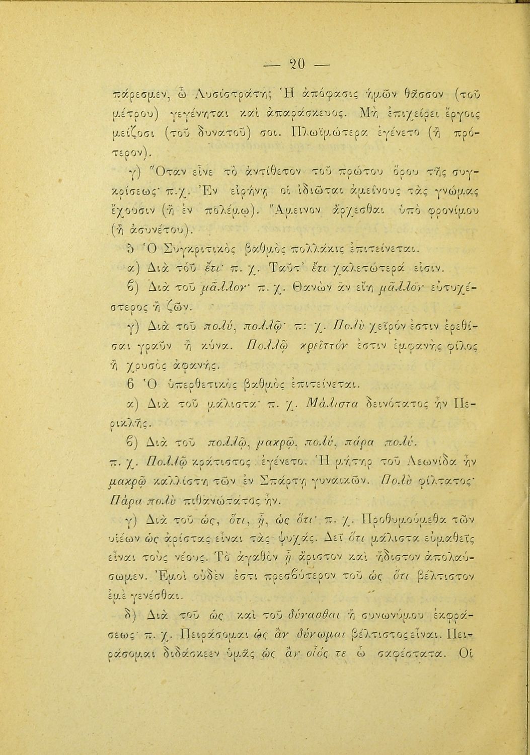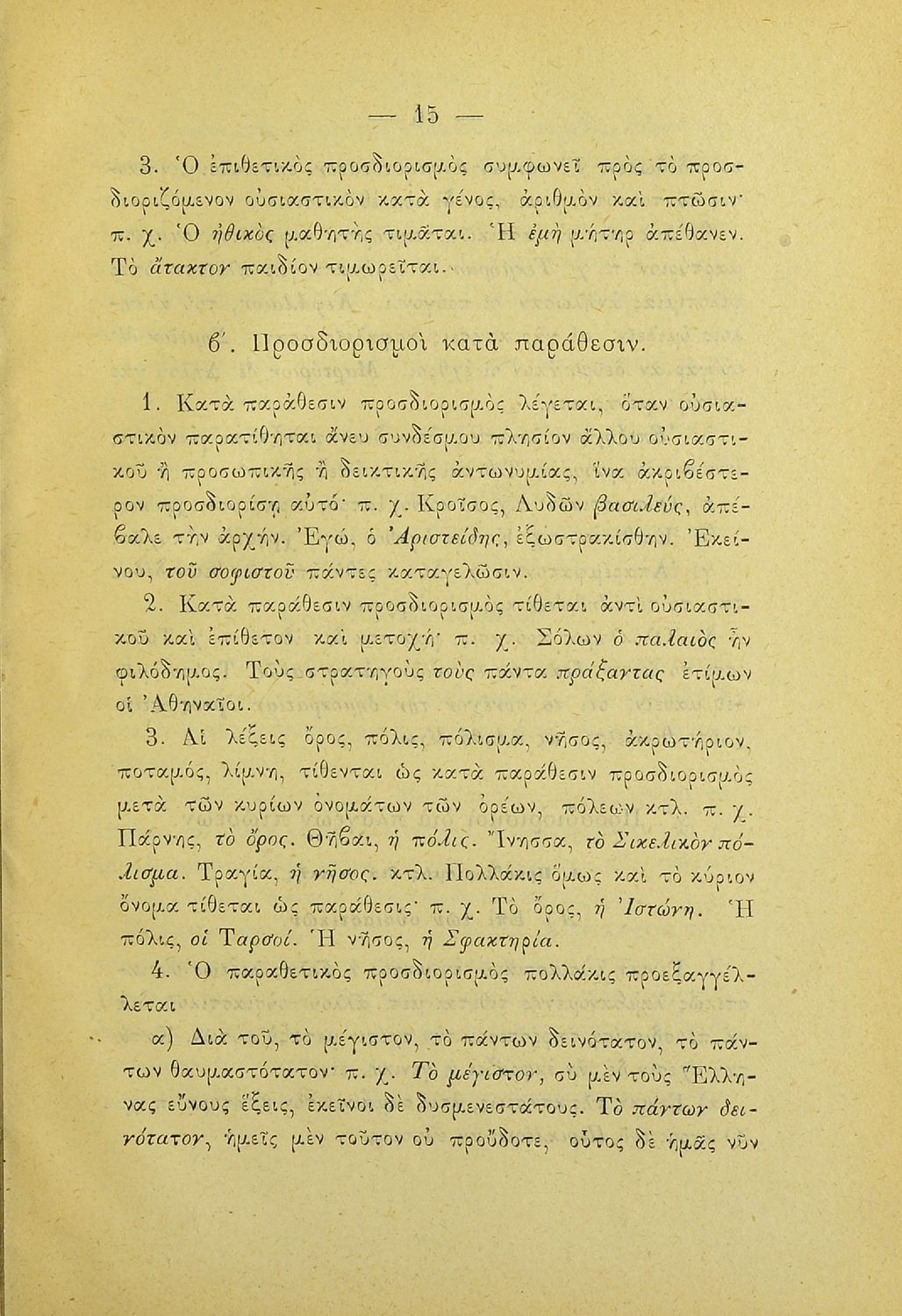 Σχολικό εγχειρίδιο Αρχαίων Ελληνικών για τους μαθητές των Ελληνικών Σχολείων και Παρθεναγωγείων που εξετάζει τα μέρη του λόγου και την σύνταξή τους.