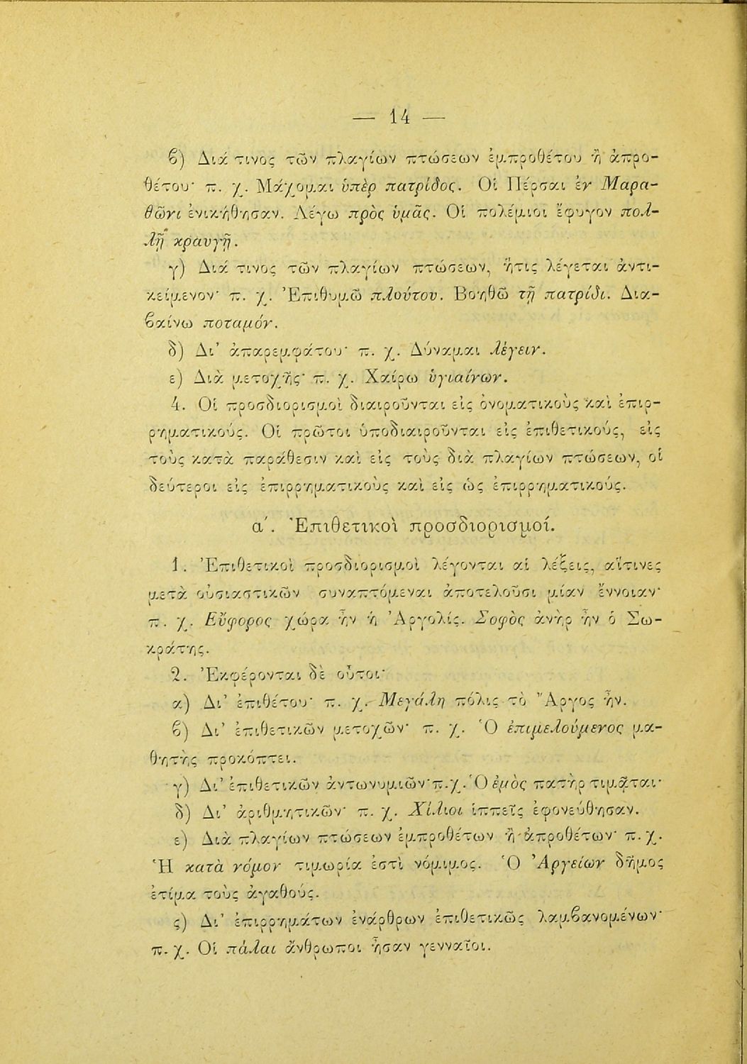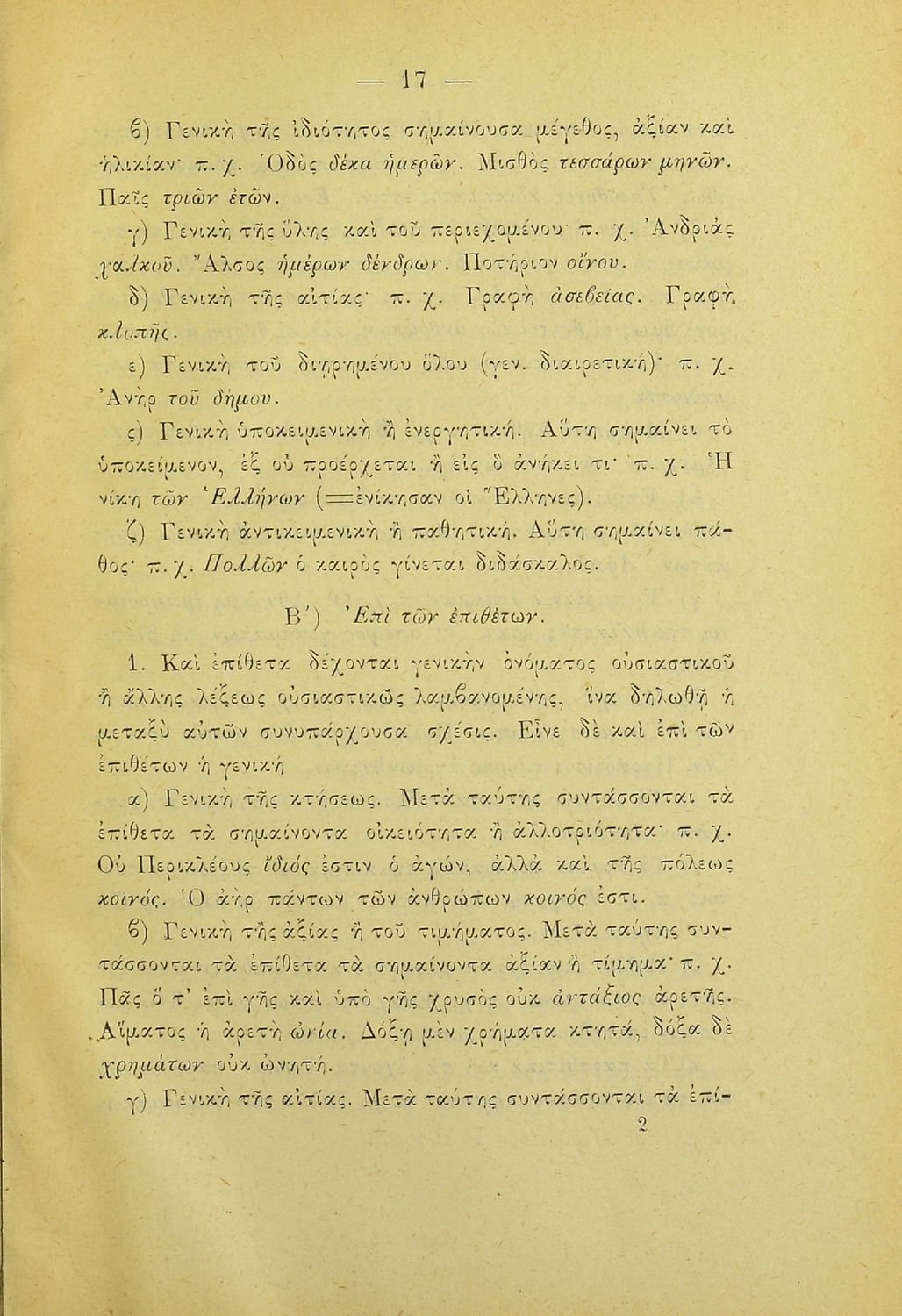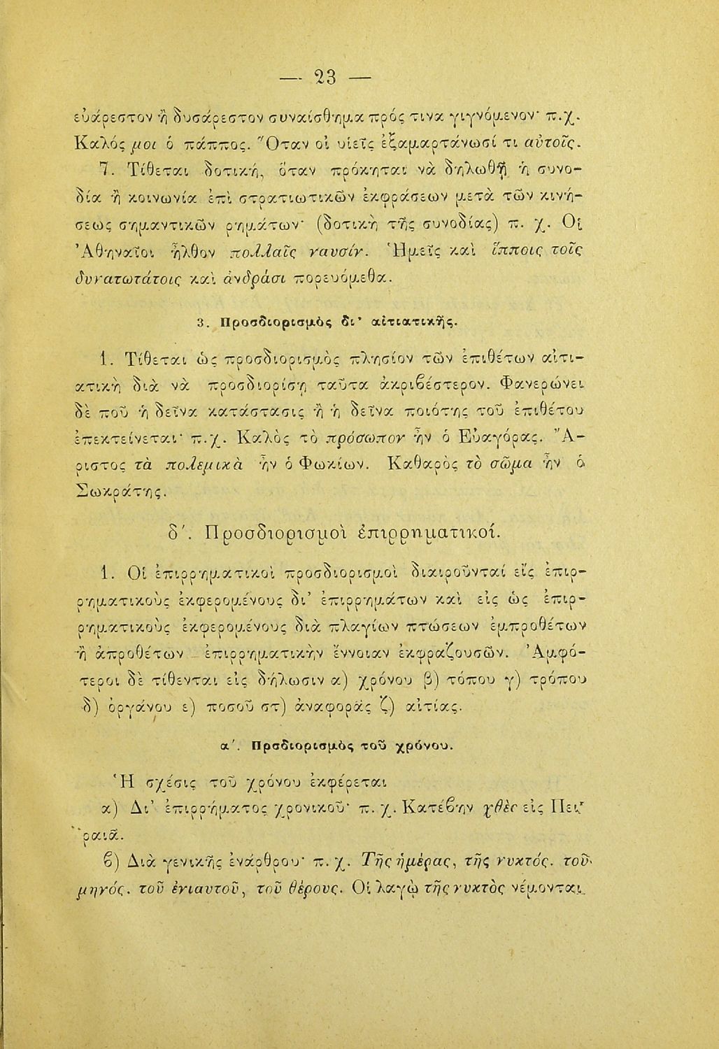 Βαθμίδα εκπαίδευσης: Δευτεροβάθμια Τάξη: Ελληνικό Σχολείο / Παρθεναγωγείο Μάθημα: Αρχαία Ελληνικά Γλώσσα: Καθαρεύουσα Παρουσίαση περιεχομένου: Σχολικό εγχειρίδιο Αρχαίων Ελληνικών για τους μαθητές των Ελληνικών Σχολείων και Παρθεναγωγείων που εξετάζει τα μέρη του λόγου και την σύνταξή τους. |