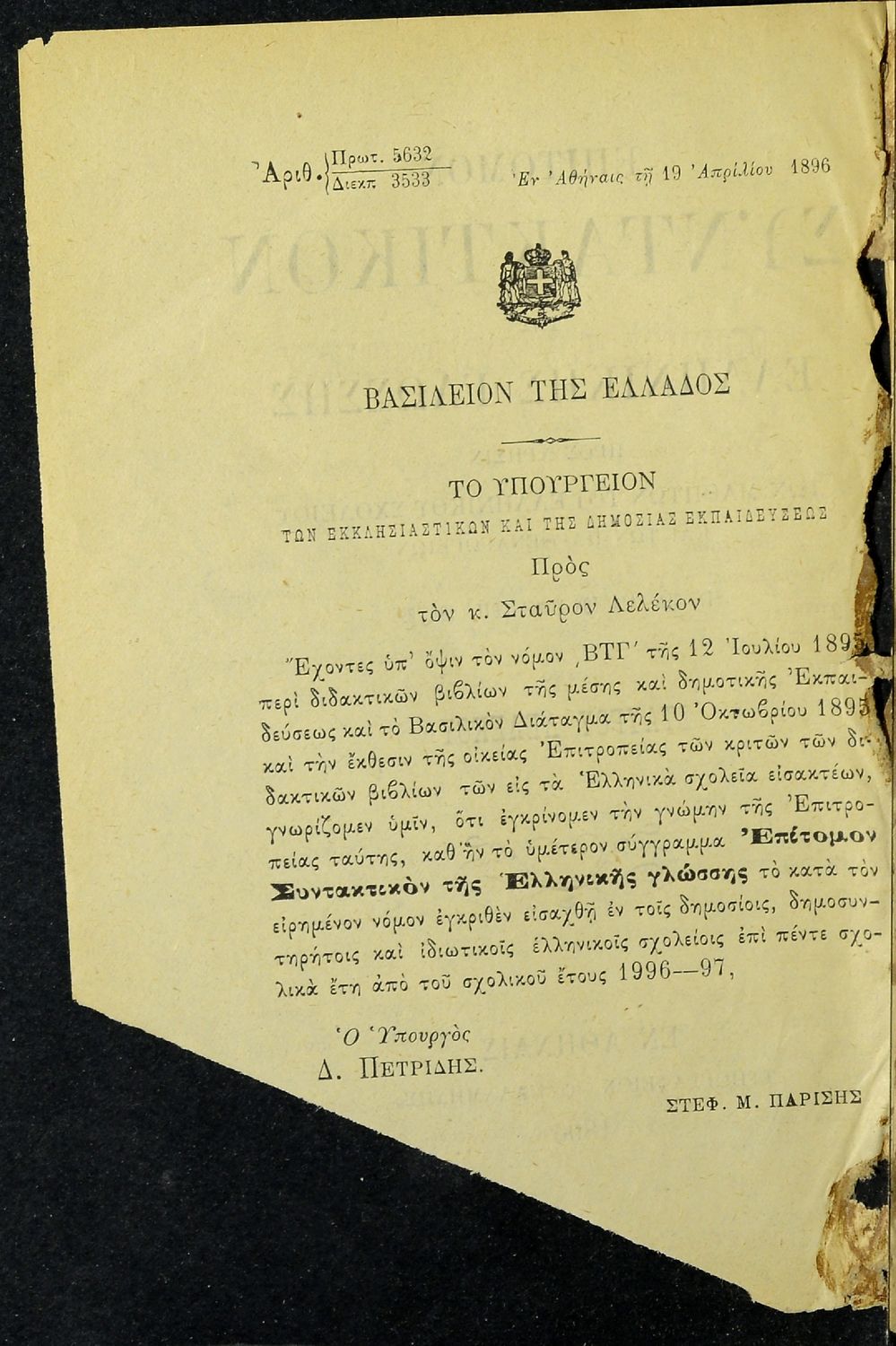Εκδότης: Τυπογραφείο Ο Παλαμήδης Έτος έκδοσης: 1896 Τόπος έκδοσης: Αθήνα Υπουργική απόφαση / Σύμβαση: 5632/19-4-1896 Έτος έγκρισης: 1896 |
