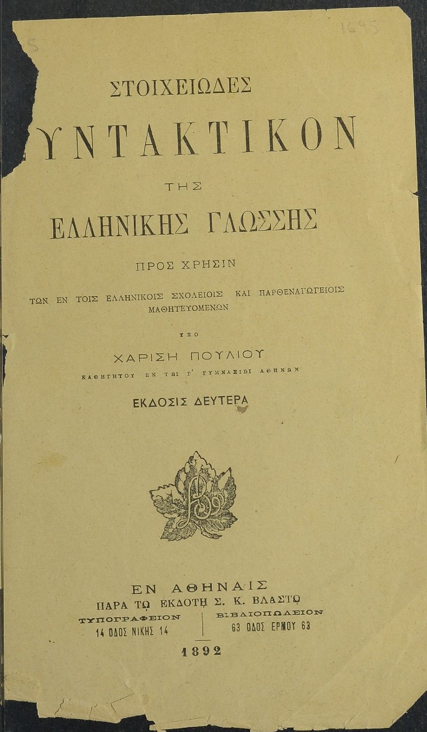 Τίτλος: Συντακτικόν της ελληνικής γλώσσης προς χρήσιν των εν τοις Ελληνικοίς Σχολείοις και Παρθεναγωγείοις μαθητευομένων