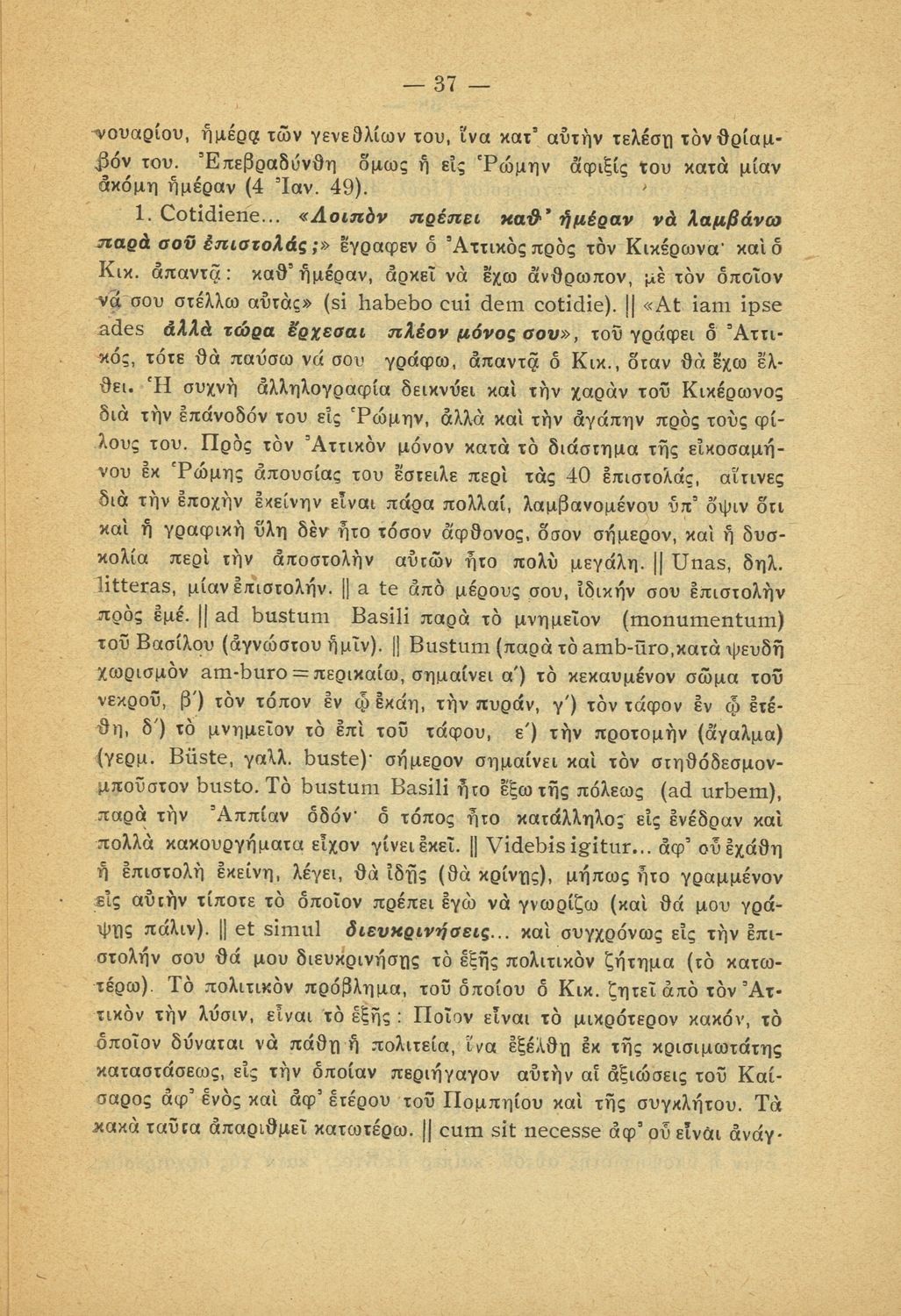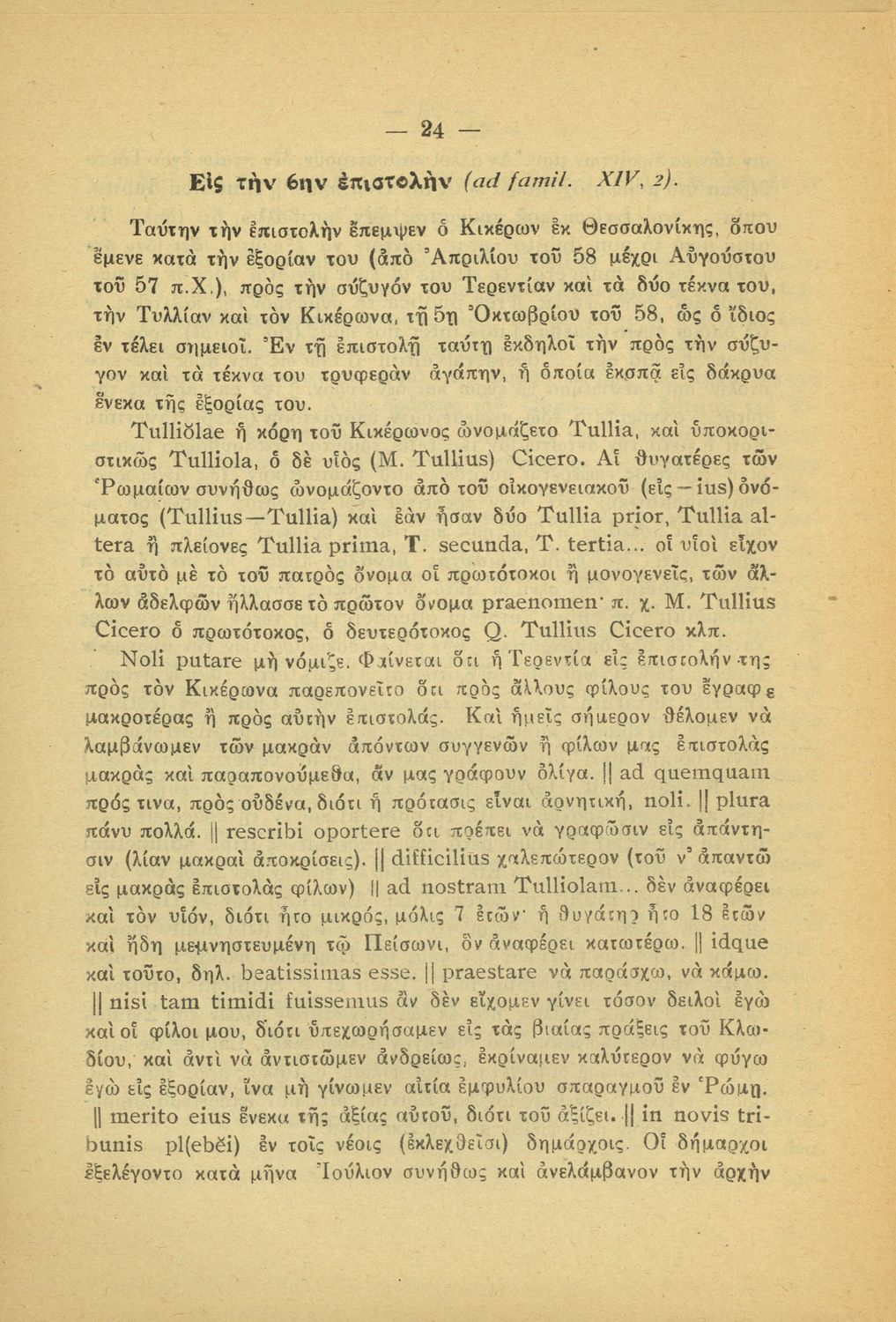 Σχολικό εγχειρίδιο Λατινικών για την Ε΄ Γυμνασίου που περιλαμβάνει επιστολές του Κικέρωνα προς τους οικείους του και προς τον Αττικό, και πραγματολογικά και ερμηνευτικά σχόλια. Ο επιμελητής ήταν τακτικός καθηγητής της Λατινικής Φιλολογίας.