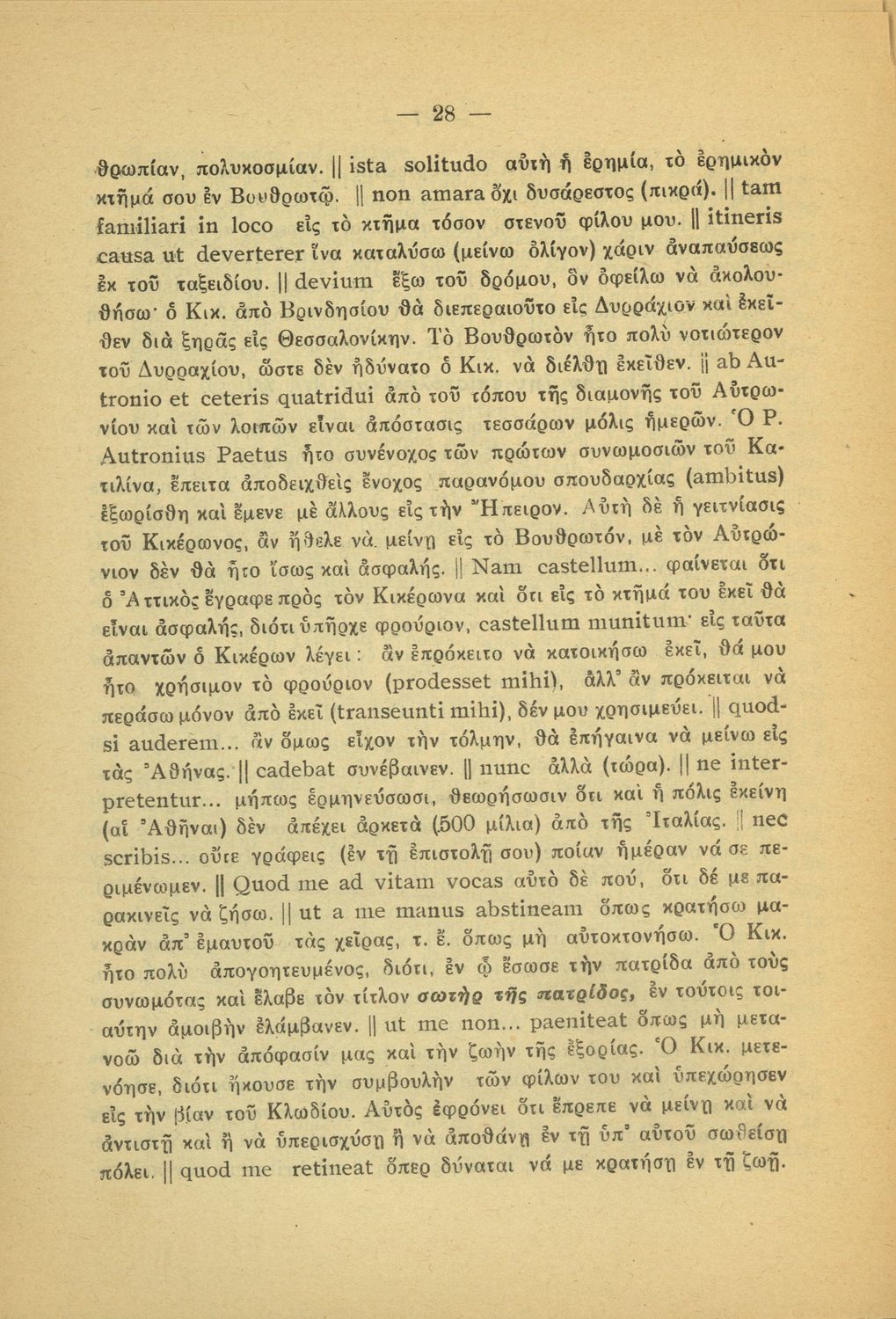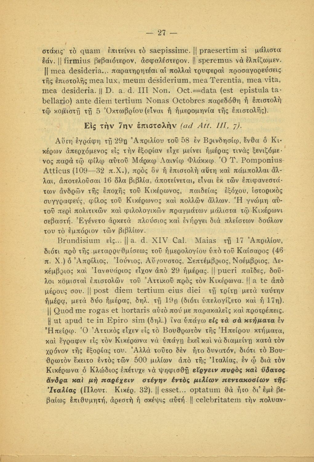 Παρουσίαση περιεχομένου: Σχολικό εγχειρίδιο Λατινικών για την Ε΄ Γυμνασίου που περιλαμβάνει επιστολές του Κικέρωνα προς τους οικείους του και προς τον Αττικό, και πραγματολογικά και ερμηνευτικά σχόλια. Ο επιμελητής ήταν τακτικός καθηγητής της Λατινικής Φιλολογίας.