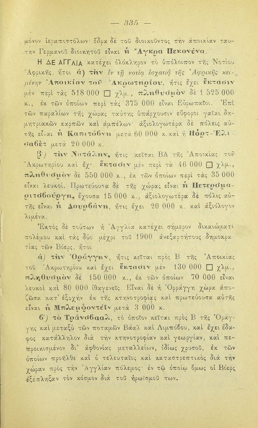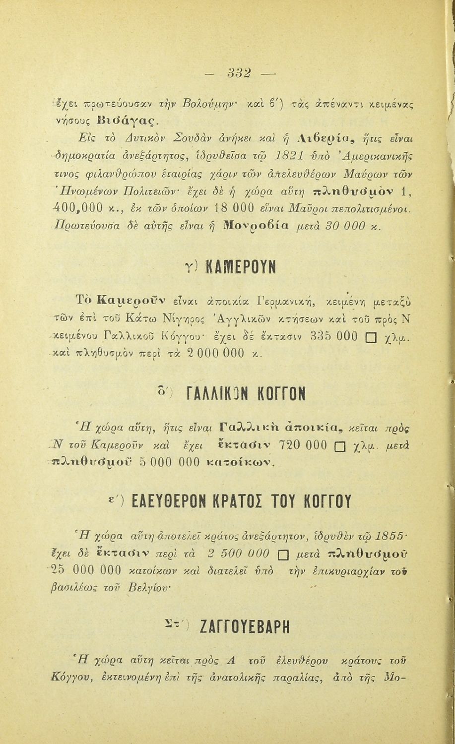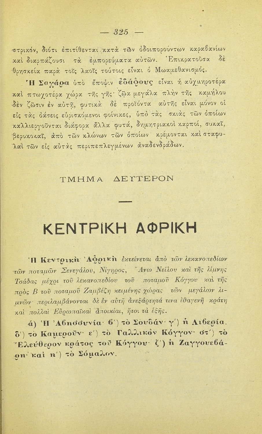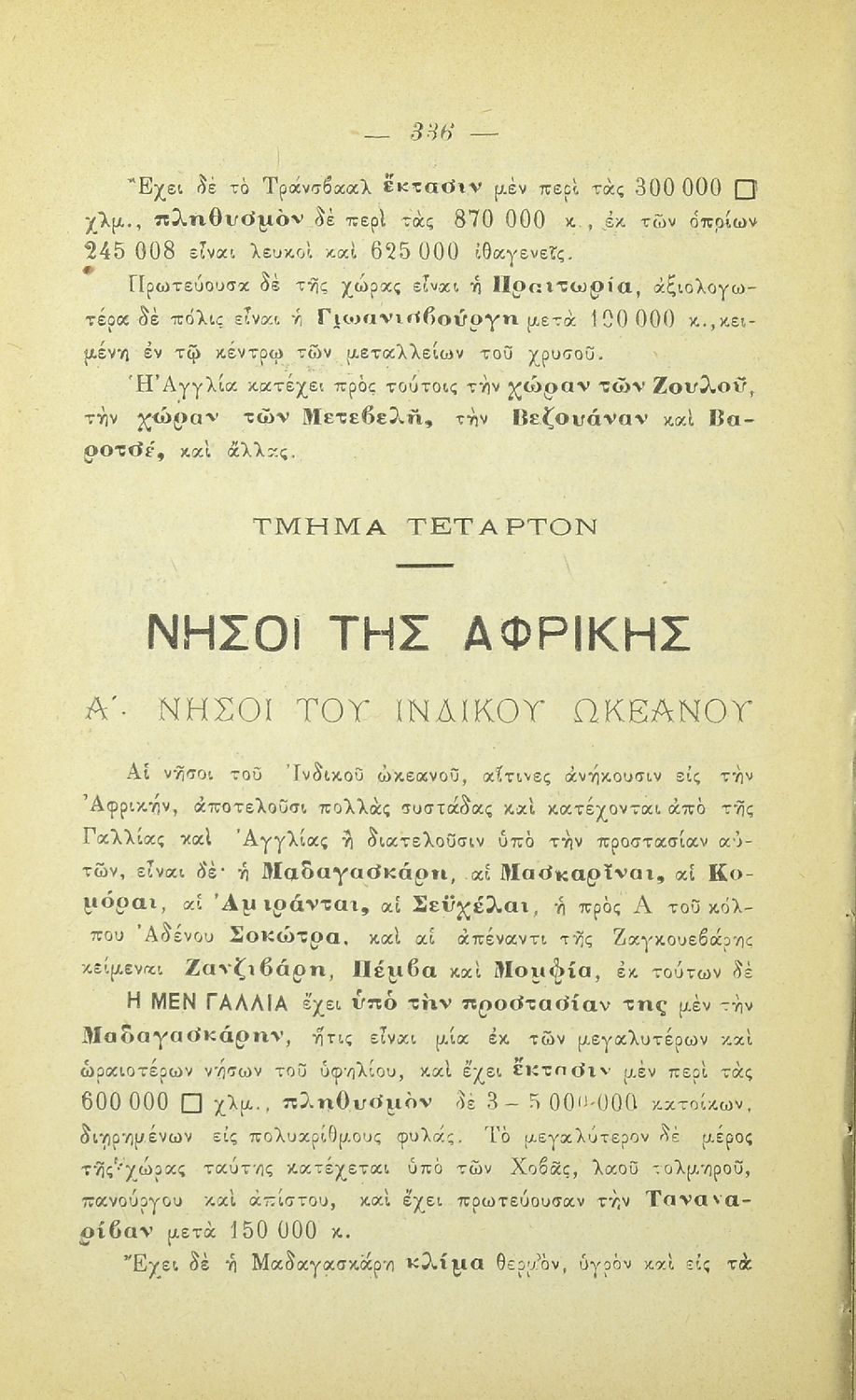 Σχολικό εγχειρίδιο Γεωγραφίας για Ελληνικά Σχολεία και Παρθεναγωγεία που περιλαμβάνει στοιχεία φυσικής, πολιτικής, πολιτισμικής και ιστορικής γεωγραφίας και εξετάζει ενδεικτικά κράτη και περιοχές από τις πέντε