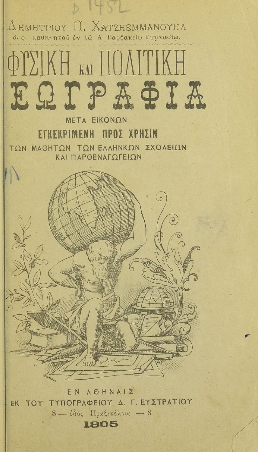 Σχολικό εγχειρίδιο Γεωγραφίας για τα Ελληνικά Σχολεία, τα Γυμνάσια, τα Διδασκαλεία, τα Παρθεναγωγεία και τις Εμπορικές-Στρατιωτικές-Ναυτικές Σχολές που περιέχει εισαγωγή στην κοσμογραφία, τη μαθηματική, ...
