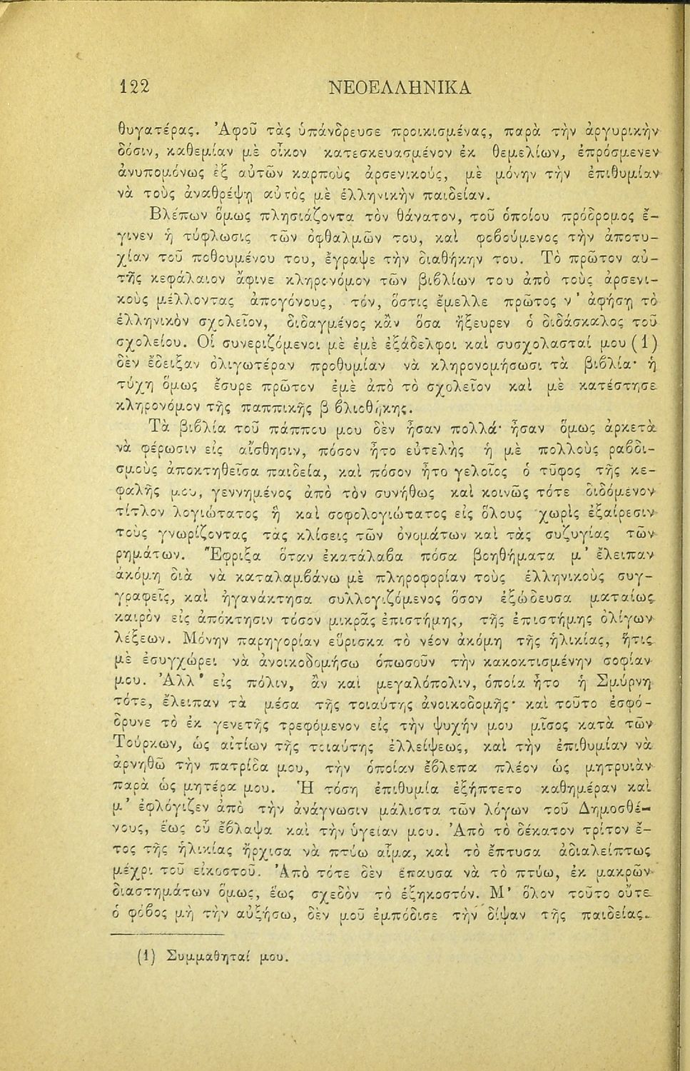 Βαθμίδα εκπαίδευσης: Δευτεροβάθμια Τάξη: Α' Ελληνικού Σχολείου Μάθημα: Νέα Ελληνικά Γλώσσα: Καθαρεύουσα Παρουσίαση περιεχομένου: Σχολικό εγχειρίδιο Νέων Ελληνικών για την Α' Ελληνικού Σχολείου που περιλαμβάνει ποιήματα και πεζά εμπνευσμένα από την αρχαία, βυζαντινή και νεώτερη ιστορία της Ελλάδας, τη θρησκευτική παράδοση και τα τοπικά ήθη και έθιμα. Περιέχει και σύντομα βιογραφικά σημειώματα των συγγραφέων. |