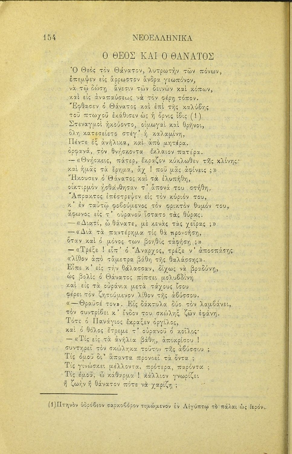 Βαθμίδα εκπαίδευσης: Δευτεροβάθμια Τάξη: Α' Ελληνικού Σχολείου Μάθημα: Νέα Ελληνικά Γλώσσα: Καθαρεύουσα Παρουσίαση περιεχομένου: Σχολικό εγχειρίδιο Νέων Ελληνικών για την Α' Ελληνικού Σχολείου που περιλαμβάνει ποιήματα και πεζά εμπνευσμένα από την αρχαία, βυζαντινή και νεώτερη ιστορία της Ελλάδας, τη θρησκευτική παράδοση και τα τοπικά ήθη και έθιμα. Περιέχει και σύντομα βιογραφικά σημειώματα των συγγραφέων. |