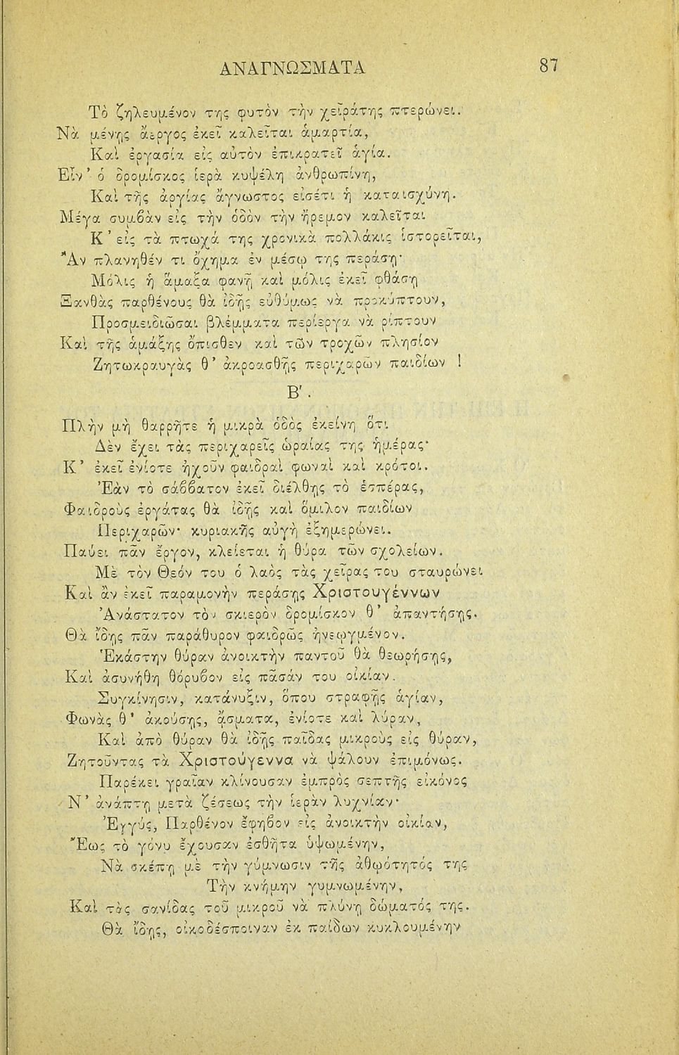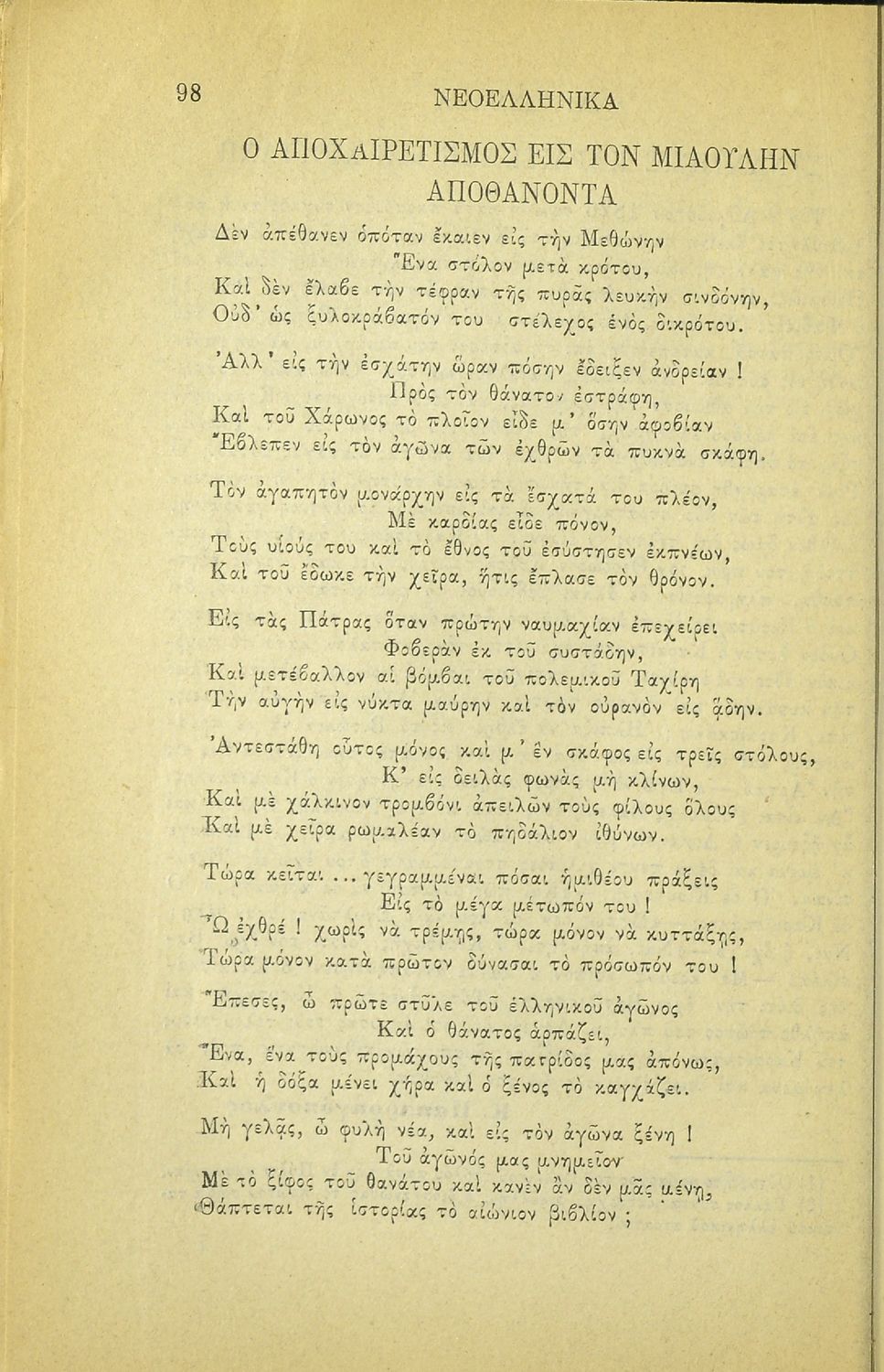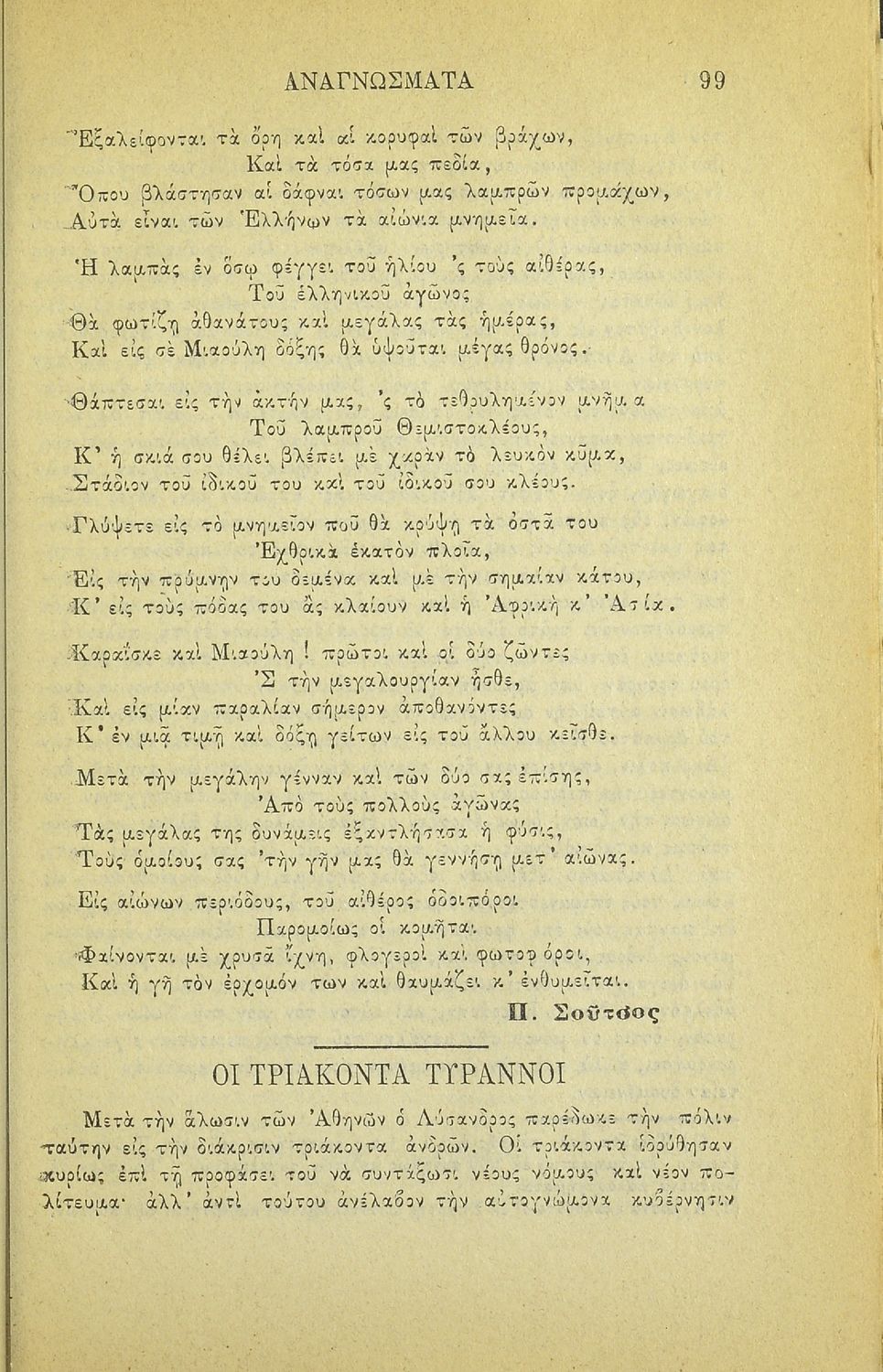 Σχολικό εγχειρίδιο Νέων Ελληνικών του 1889. Περιέχει πεζά και ποιήματα Ελλήνων λογοτεχνών εμπνευσμένα από την καθημερινή και ιστορική ζωή του τόπου. Έχει την έγκριση του Υπουργείου Δημόσιας Εκπαίδευσης.