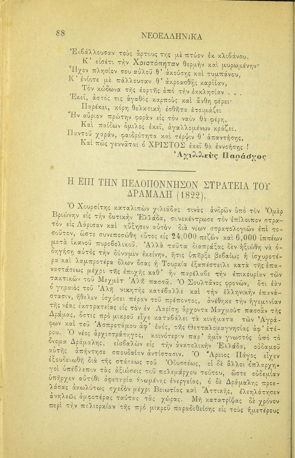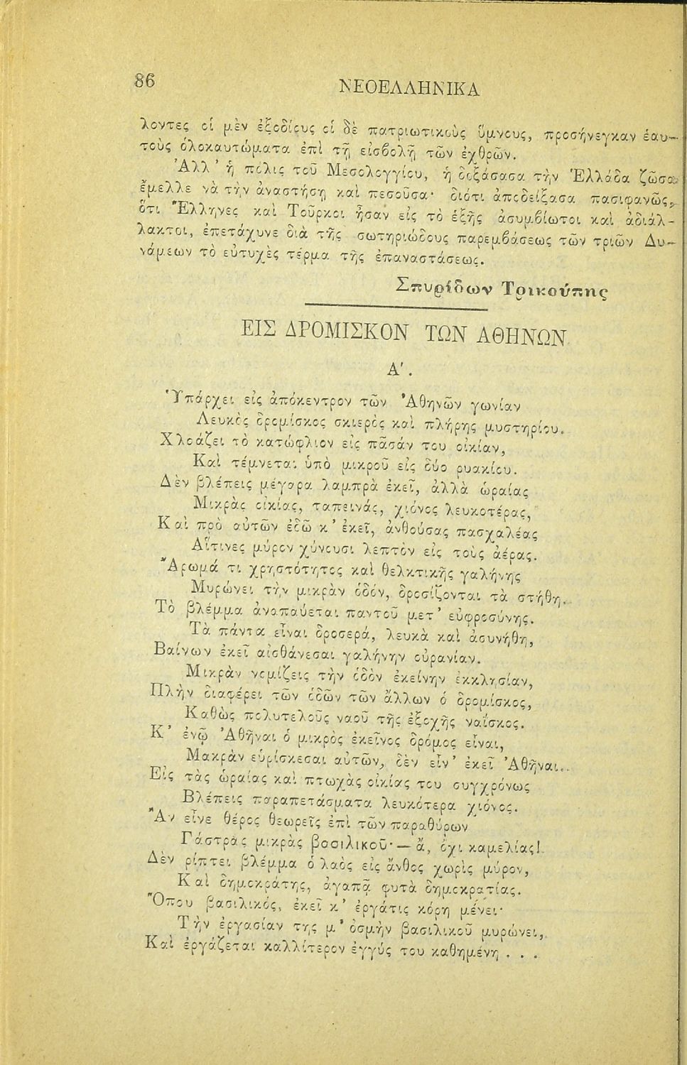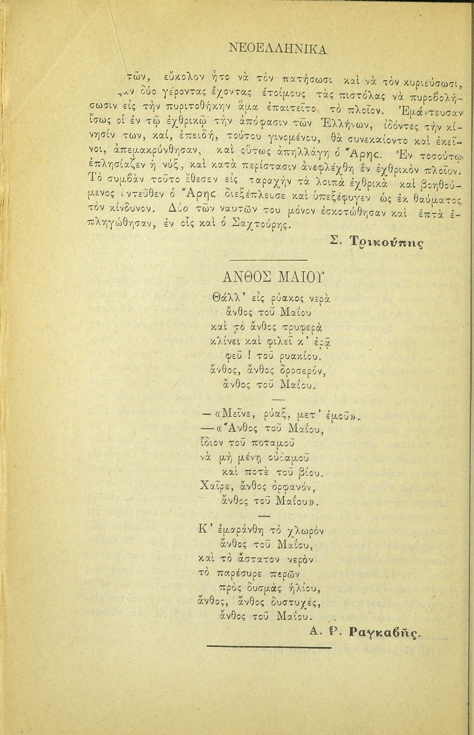 Σχολικό εγχειρίδιο Νέων Ελληνικών του 1889. Περιέχει πεζά και ποιήματα Ελλήνων λογοτεχνών εμπνευσμένα από την καθημερινή και ιστορική ζωή του τόπου. Έχει την έγκριση του Υπουργείου Δημόσιας Εκπαίδευσης.