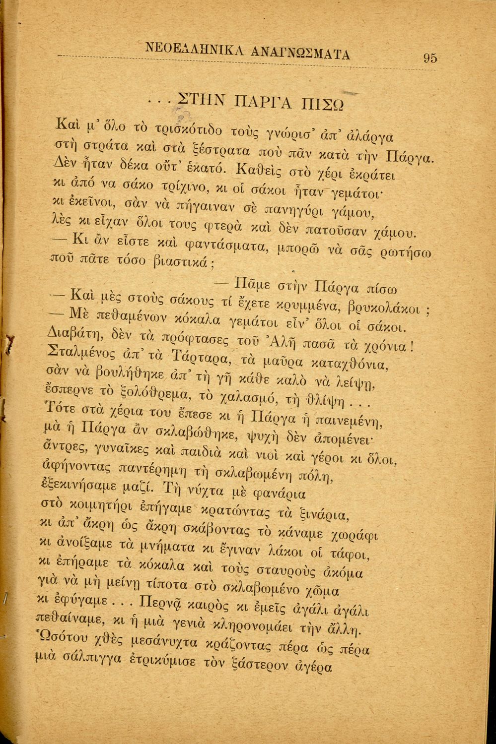Σχολικό εγχειρίδιο Νεοελληνικών αναγνωσμάτων που περιλαμβάνει πεζά και ποιήματα Ελλήνων συγγραφέων με θέματα από την εθνική ζωή. Περιέχει και παράρτημα με βιογραφίες των συγγραφέων και λεξιλόγιο.