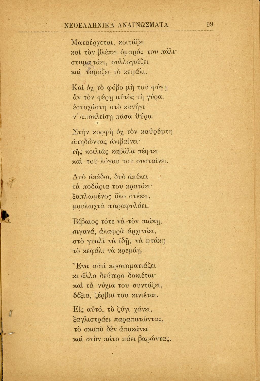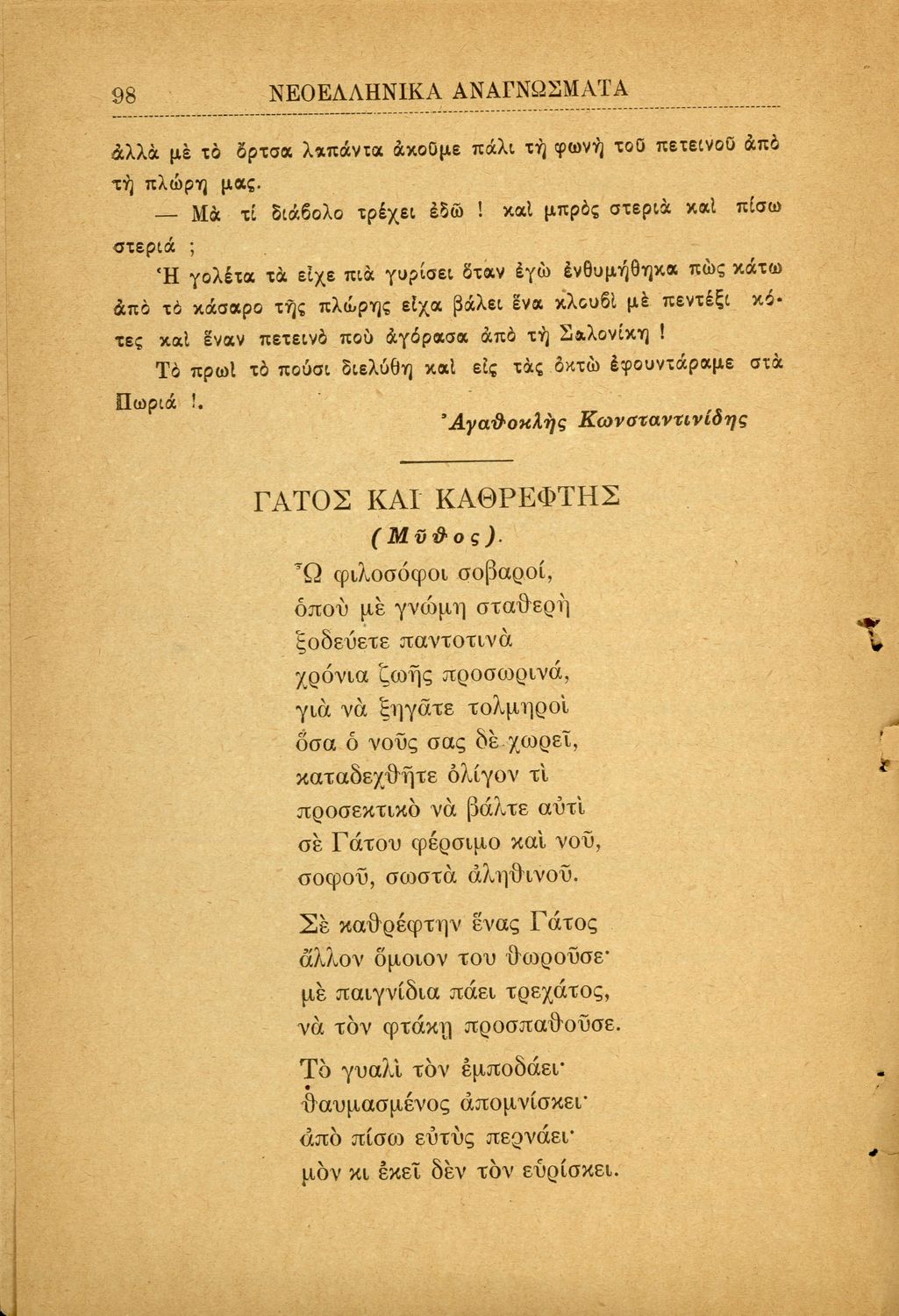 Σχολικό εγχειρίδιο Νέων Ελληνικών Γ' Ελληνικού Σχολείου και Α΄ Αστικού Σχολείου των Θηλέων που περιλαμβάνει ποιήματα και πεζά Ελλήνων συγγραφέων και δημοτικά τραγούδια εμπνευσμένα από την σύγχρονη ελληνική ...