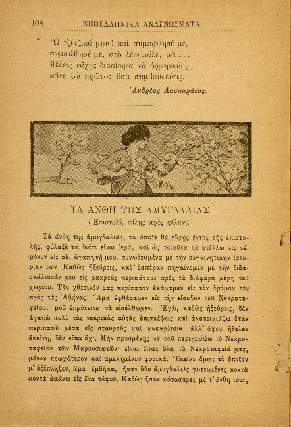 Σχολικό εγχειρίδιο για την Β΄ Γυμνασίου και την Γ΄ Αστικού Θηλέων για το μάθημα των Νέων Ελληνικών. Το εγχειρίδιο αποτελείται από κείμενα πεζού λόγου, επικολυρικά ποιήματα, ωδές, ηθογραφικά διηγήματα, ρητορικά