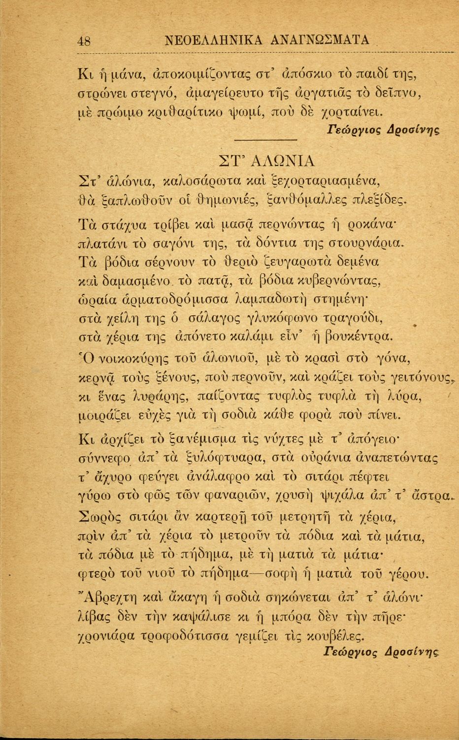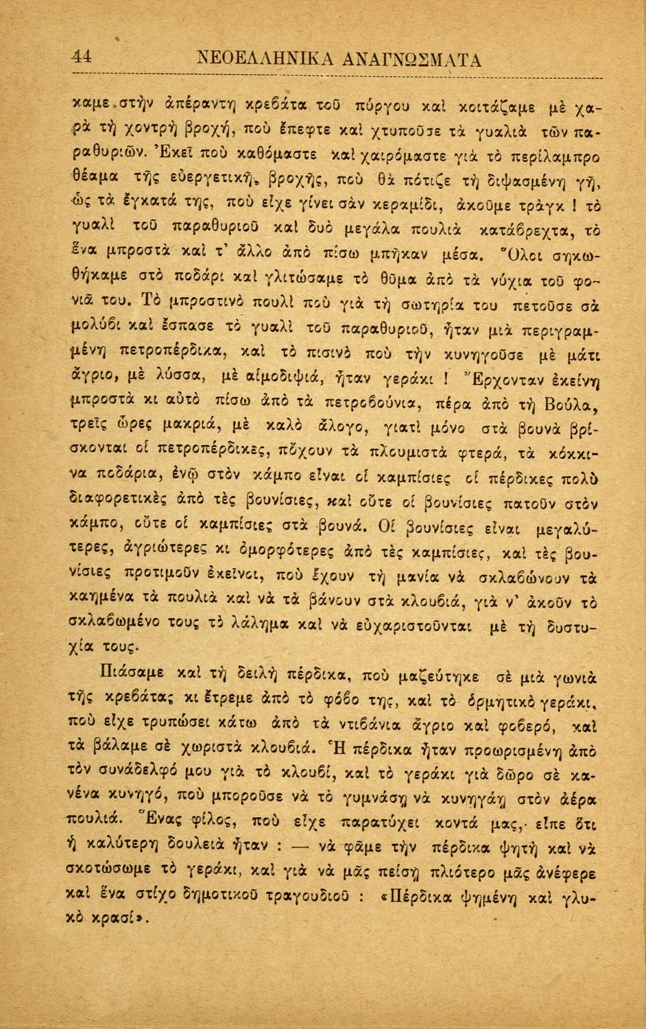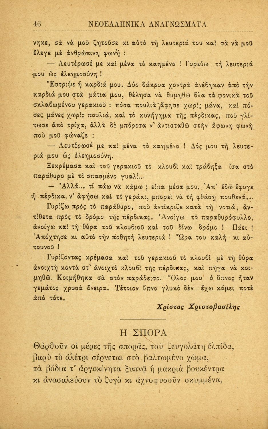 Σχολικό εγχειρίδιο Νέων Ελληνικών Α' Ελληνικού Σχολείου που περιλαμβάνει πεζά και ποιήματα Ελλήνων συγγραφέων και δημοτικά τραγούδια εμπνευσμένα από την ελληνική ιστορία, τη θρησκευτική και οικογενειακή παράδοση, την αγάπη για την ελληνική ύπαιθρο και τα ζώα, τις καθημερινές ασχολίες και τα επαγγέλματα των ανθρώπων. Περιέχει και παράρτημα με βιογραφίες των συγγραφέων και λεξιλόγιο.
