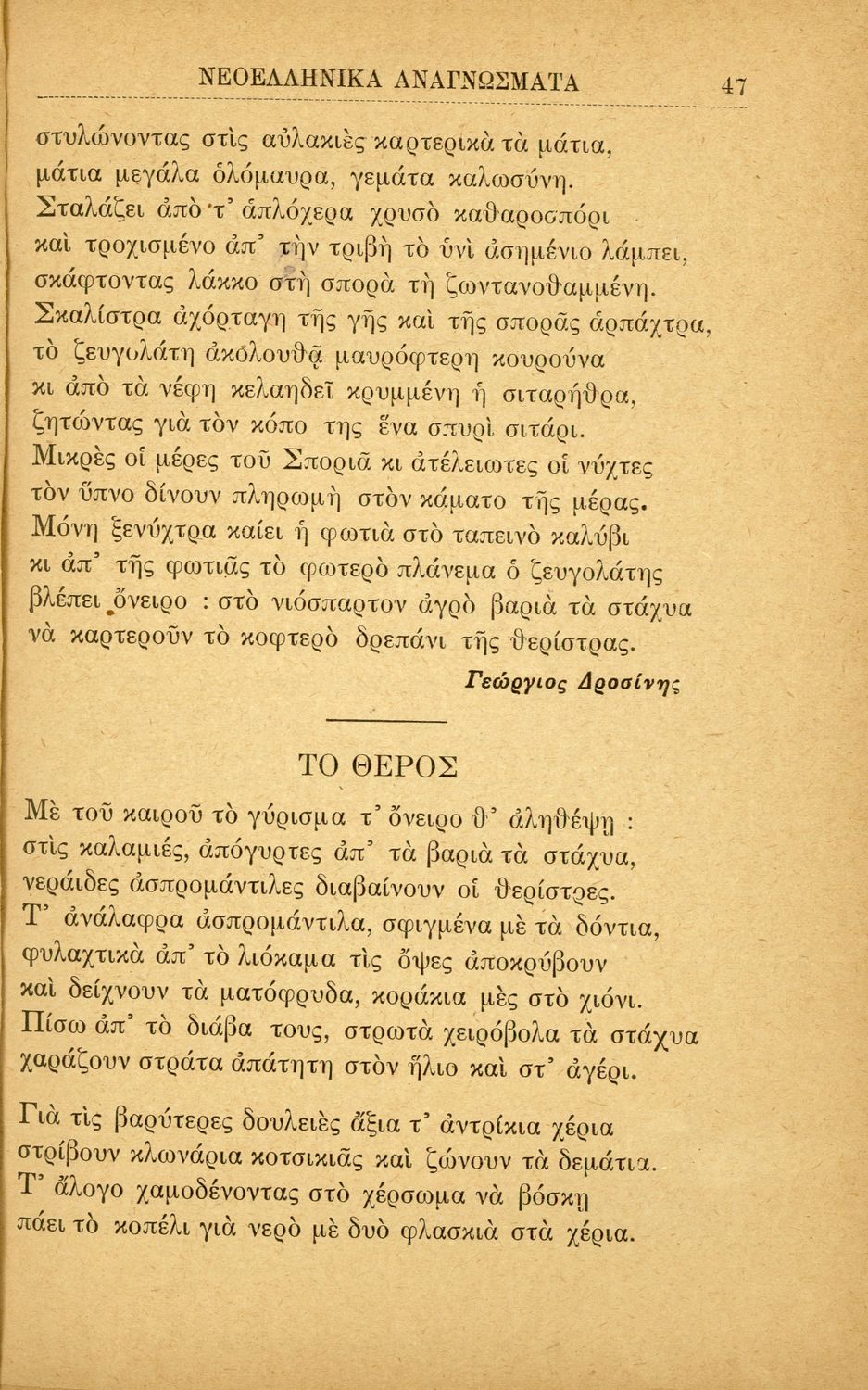 Σχολικό εγχειρίδιο Νέων Ελληνικών Γ' Ελληνικού και Α' Αστικού Σχολείου που περιλαμβάνει κείμενα Ελλήνων συγγραφέων εμπνευσμένα από την σύγχρονη ελληνική ιστορία, τη βυζαντινή ιστορία, την ελληνική φύση και τη ...