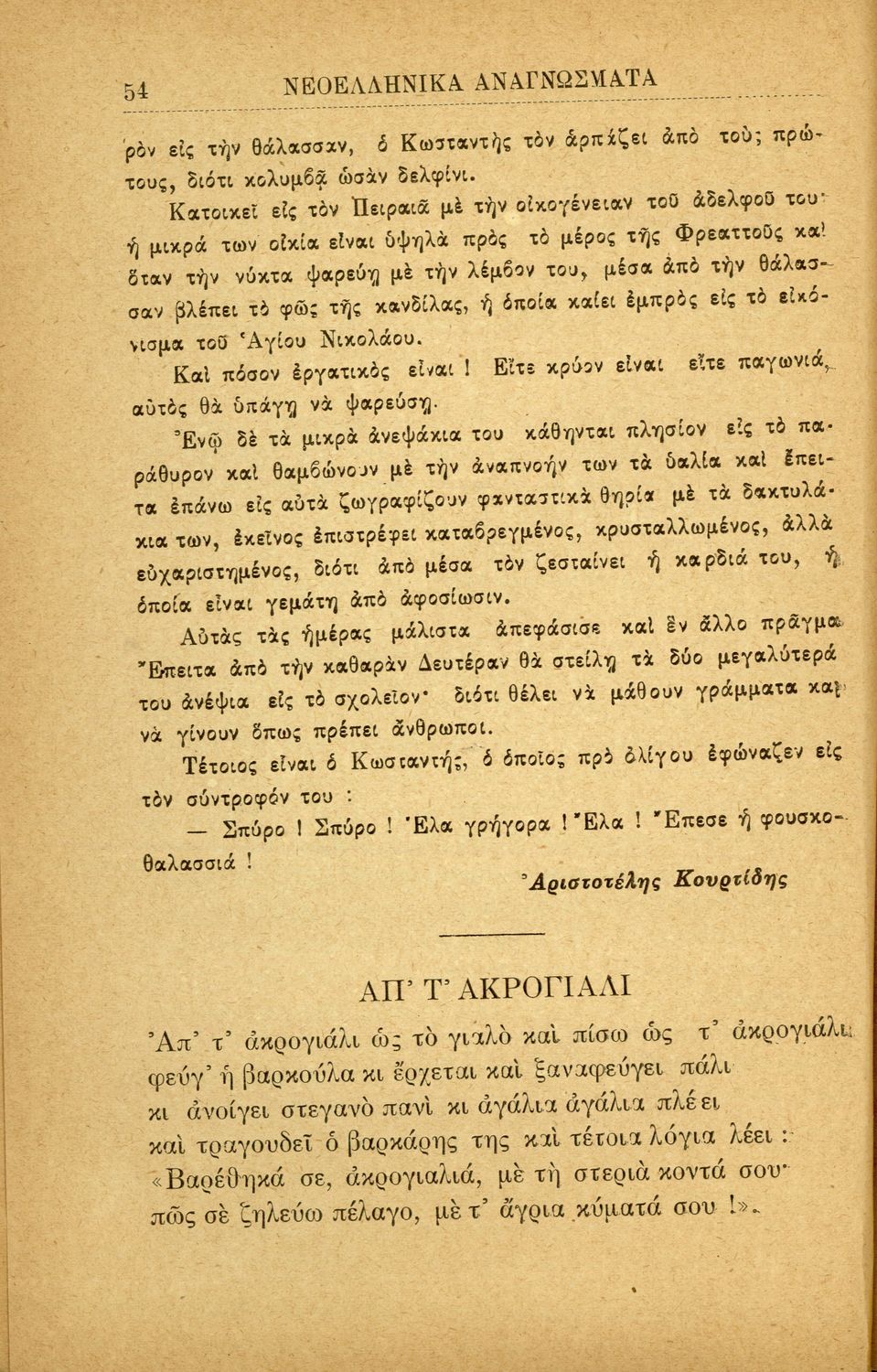 Σχολικό εγχειρίδιο για την Β΄ Γυμνασίου και την Γ΄ Αστικού Θηλέων για το μάθημα των Νέων Ελληνικών. Το εγχειρίδιο αποτελείται από κείμενα πεζού λόγου, επικολυρικά ποιήματα, ωδές, ηθογραφικά διηγήματα, ρητορικά