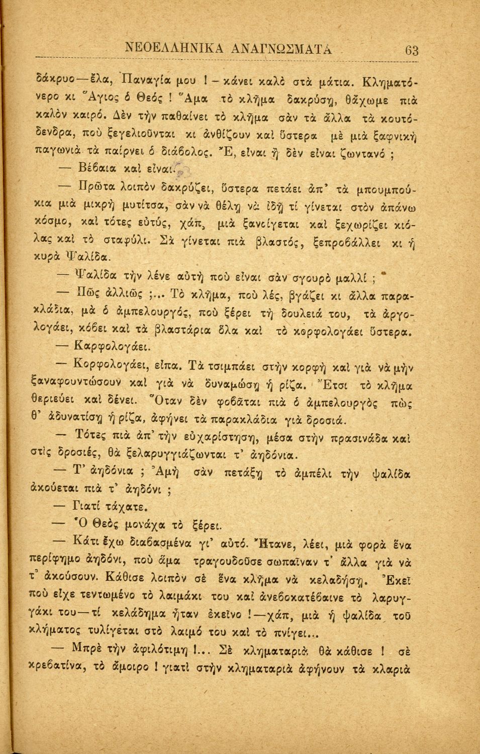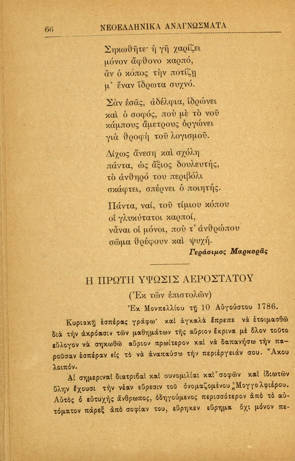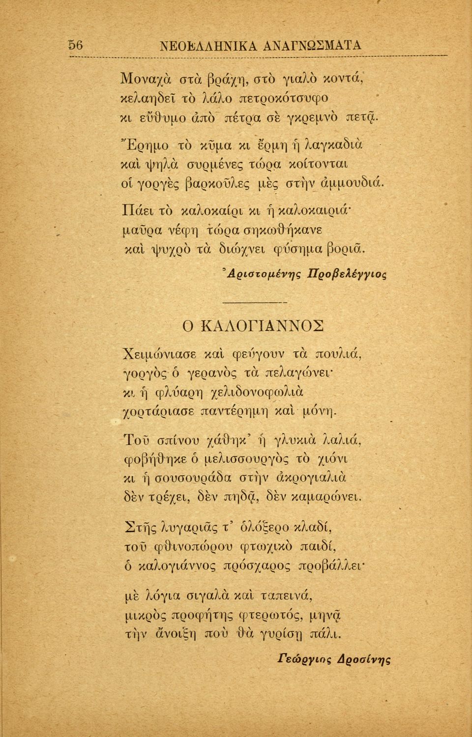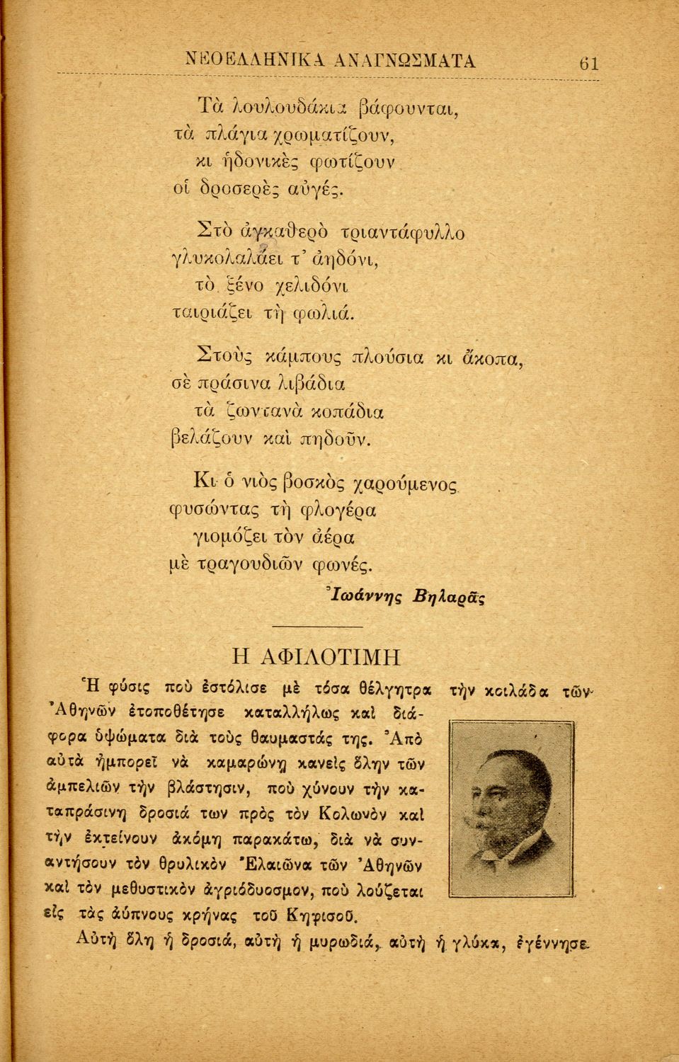 Σχολικό εγχειρίδιο Νέων Ελληνικών Α' Ελληνικού Σχολείου που περιλαμβάνει πεζά και ποιήματα Ελλήνων συγγραφέων και δημοτικά τραγούδια εμπνευσμένα από την ελληνική ιστορία, τη θρησκευτική και οικογενειακή παράδοση, την αγάπη για την ελληνική ύπαιθρο και τα ζώα, τις καθημερινές ασχολίες και τα επαγγέλματα των ανθρώπων. Περιέχει και παράρτημα με βιογραφίες των συγγραφέων και λεξιλόγιο.