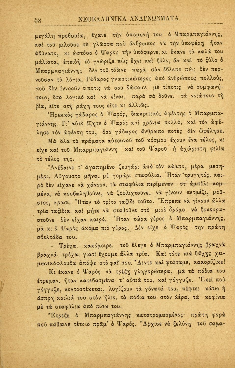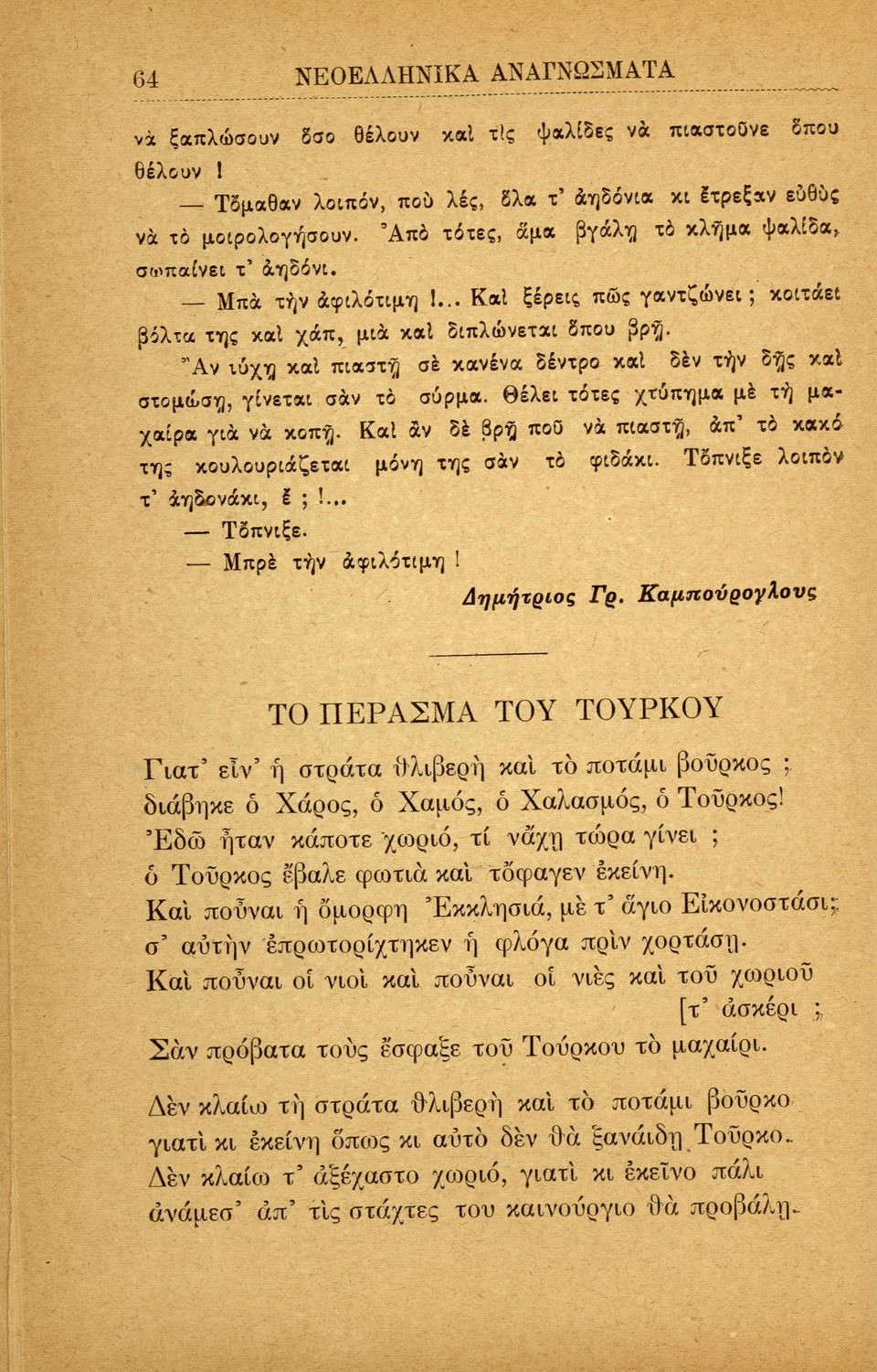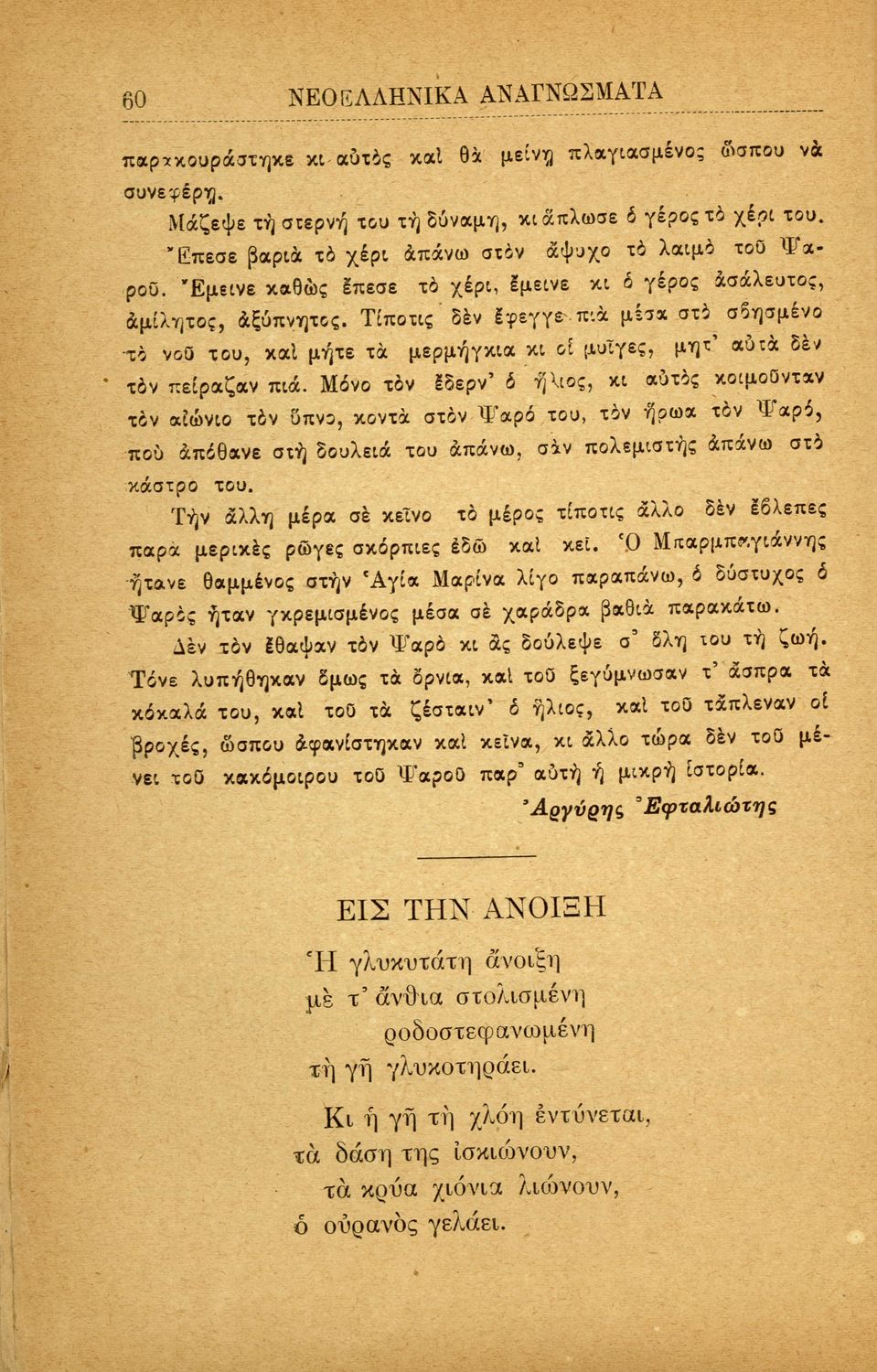 Σχολικό εγχειρίδιο Νεοελληνικών αναγνωσμάτων που περιλαμβάνει πεζά και ποιήματα Ελλήνων συγγραφέων με θέματα από την εθνική ζωή. Περιέχει και παράρτημα με βιογραφίες των συγγραφέων και λεξιλόγιο.