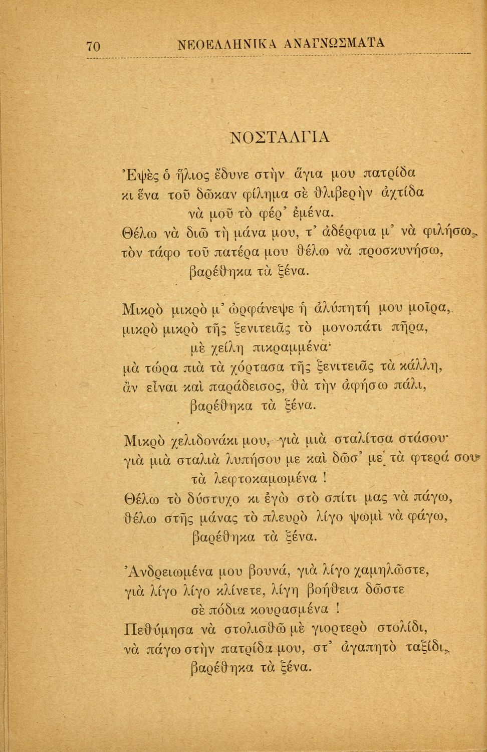 Σχολικό εγχειρίδιο για την Β΄ Γυμνασίου και την Γ΄ Αστικού Θηλέων για το μάθημα των Νέων Ελληνικών. Το εγχειρίδιο αποτελείται από κείμενα πεζού λόγου, επικολυρικά ποιήματα, ωδές, ηθογραφικά διηγήματα, ρητορικά