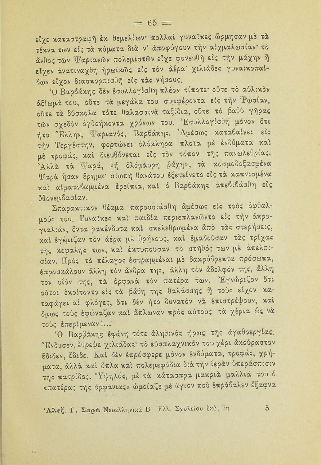 Κωδικός αναγνώρισης: 20-01778 Τίτλος: Νεοελληνικά αναγνώσματα διά τους μαθητάς της Β΄ τάξεως των Ελληνικών Σχολείων Συγγραφέας: Αλέξανδρος Γ. Σαρής Μέγεθος και υπόστρωμα: Σχολικό εγχειρίδιο, 21εκ., μαλακό εξώφυλλο, 178 σελίδες. Σκίτσα (ασπρόμαυρα). |