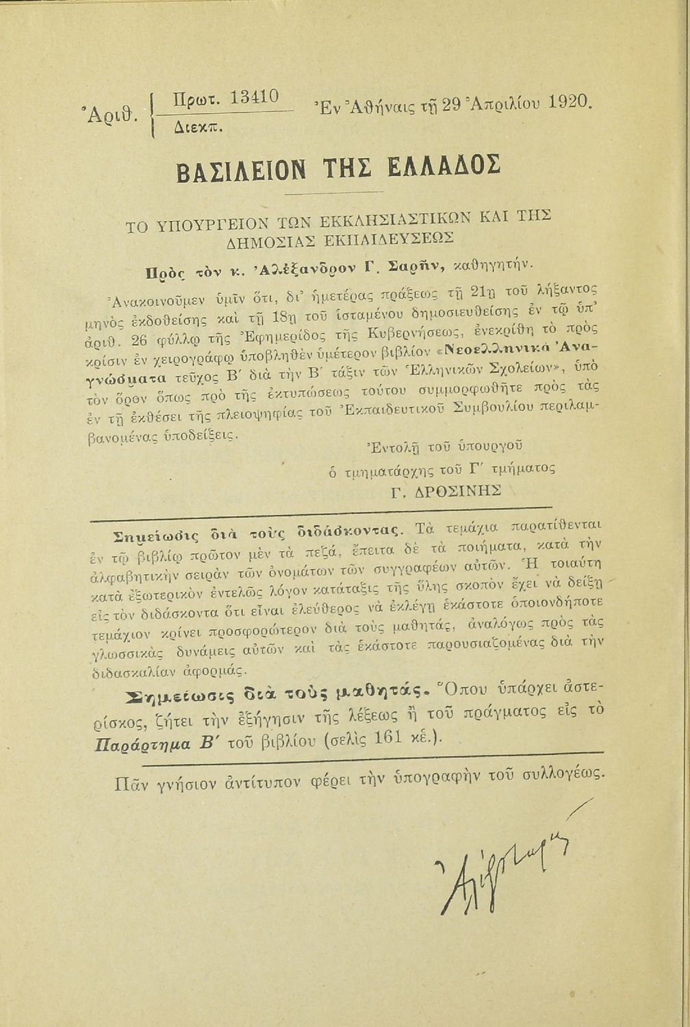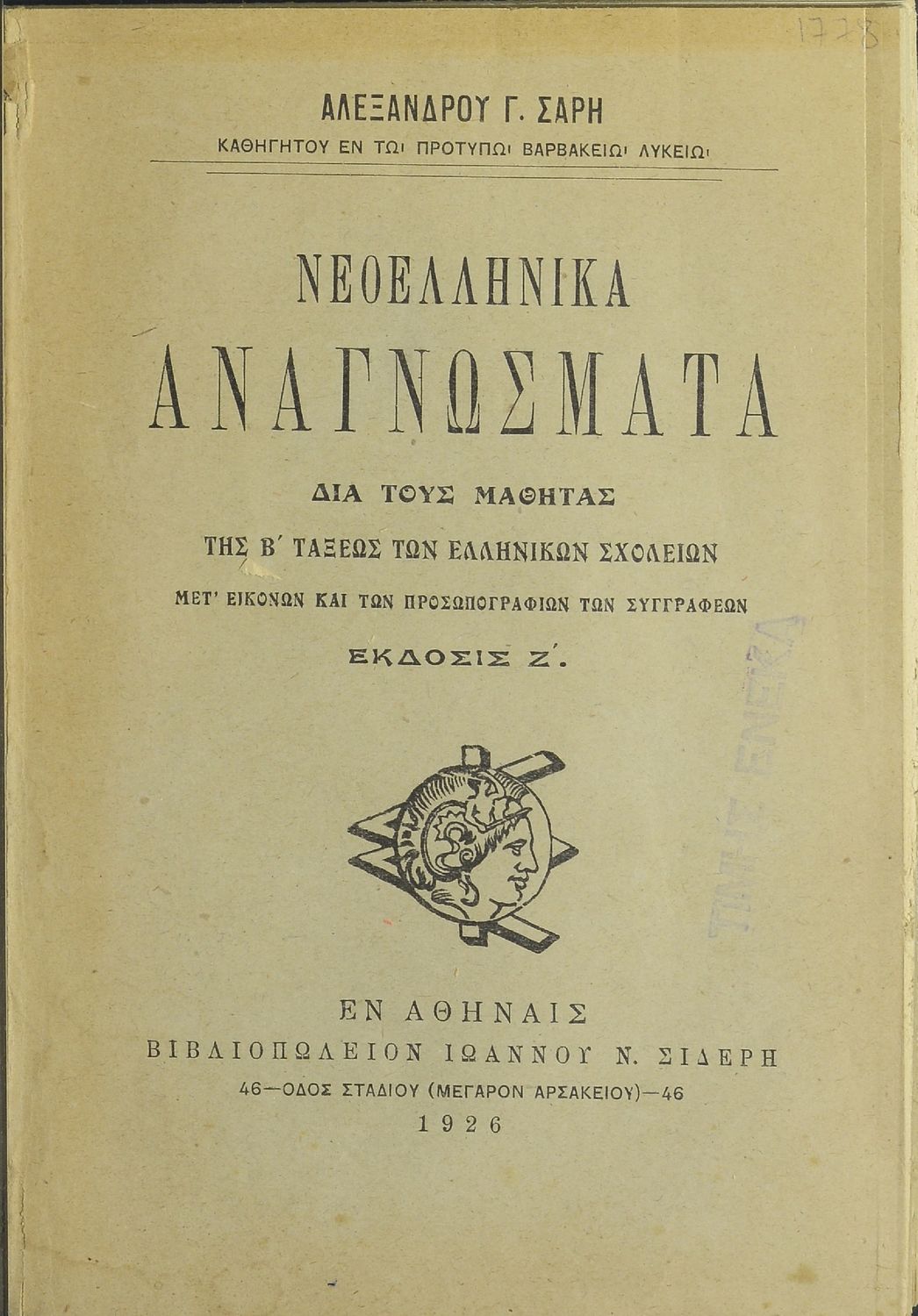 Τίτλος: Νεοελληνικά αναγνώσματα διά τους μαθητάς της Β΄ τάξεως των Ελληνικών Σχολείων