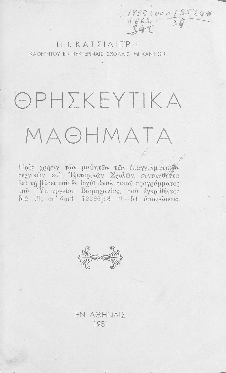Τίτλος: Θρησκευτικά μαθήματα προς χρήσιν των μαθητών των Επαγγελματικών Τεχνικών και Εμπορικών Σχολών, συνταχθέντα επί τη βάσει του εν τη ισχύι αναλυτικού προγράμματος του Υπουργείου Βιομηχανίας, του εγκριθέντος διά της υπ'αριθ. 72296/18-9-51