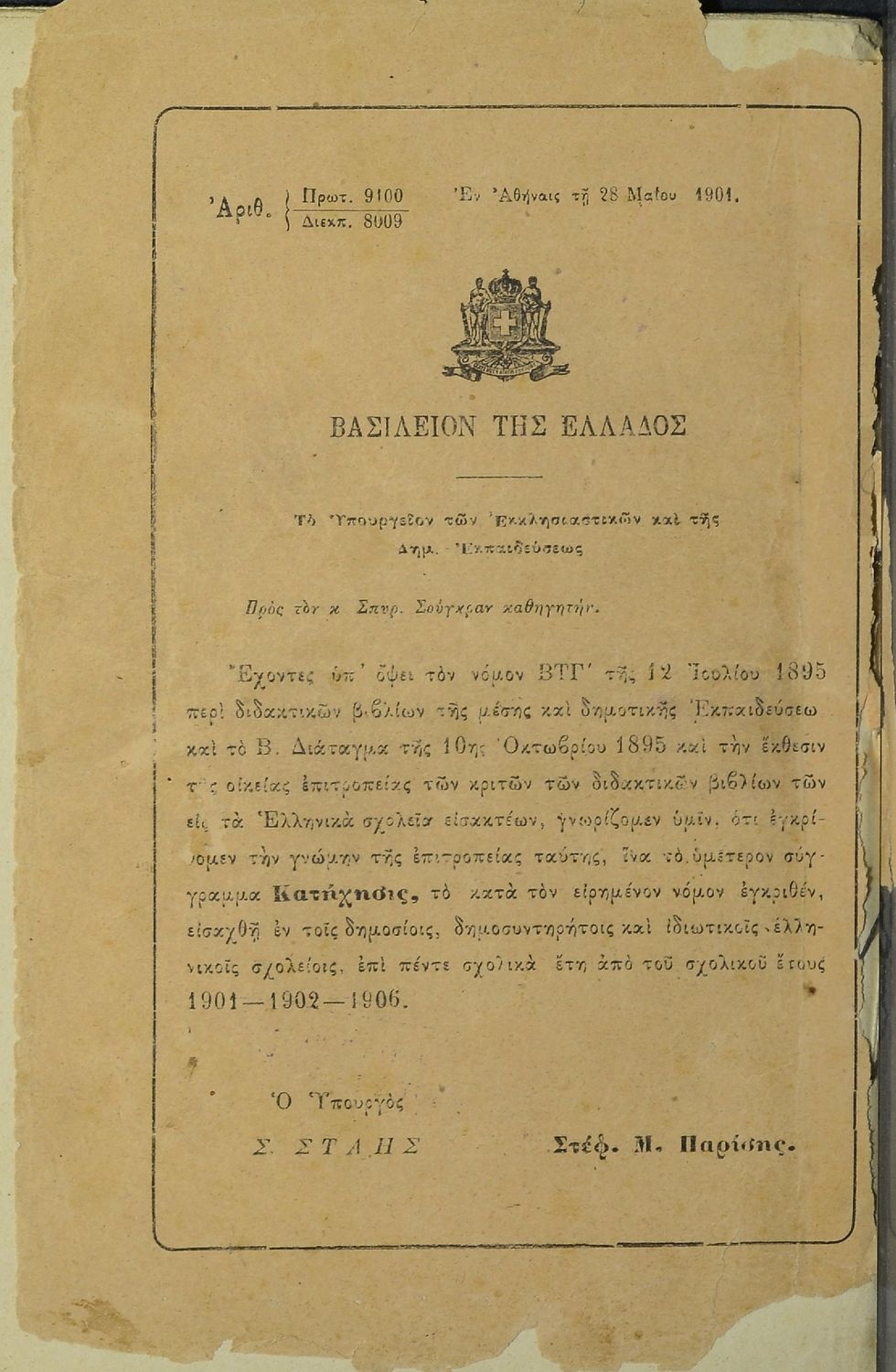 Εκδότης: Μιχαήλ Ι. Σαλίβερος Έτος έκδοσης: 1902 Τόπος έκδοσης: Αθήνα Έκδοση: 2η Υπουργική απόφαση / Σύμβαση: 9100/28-5-1901 Έτος έγκρισης: 1901 |