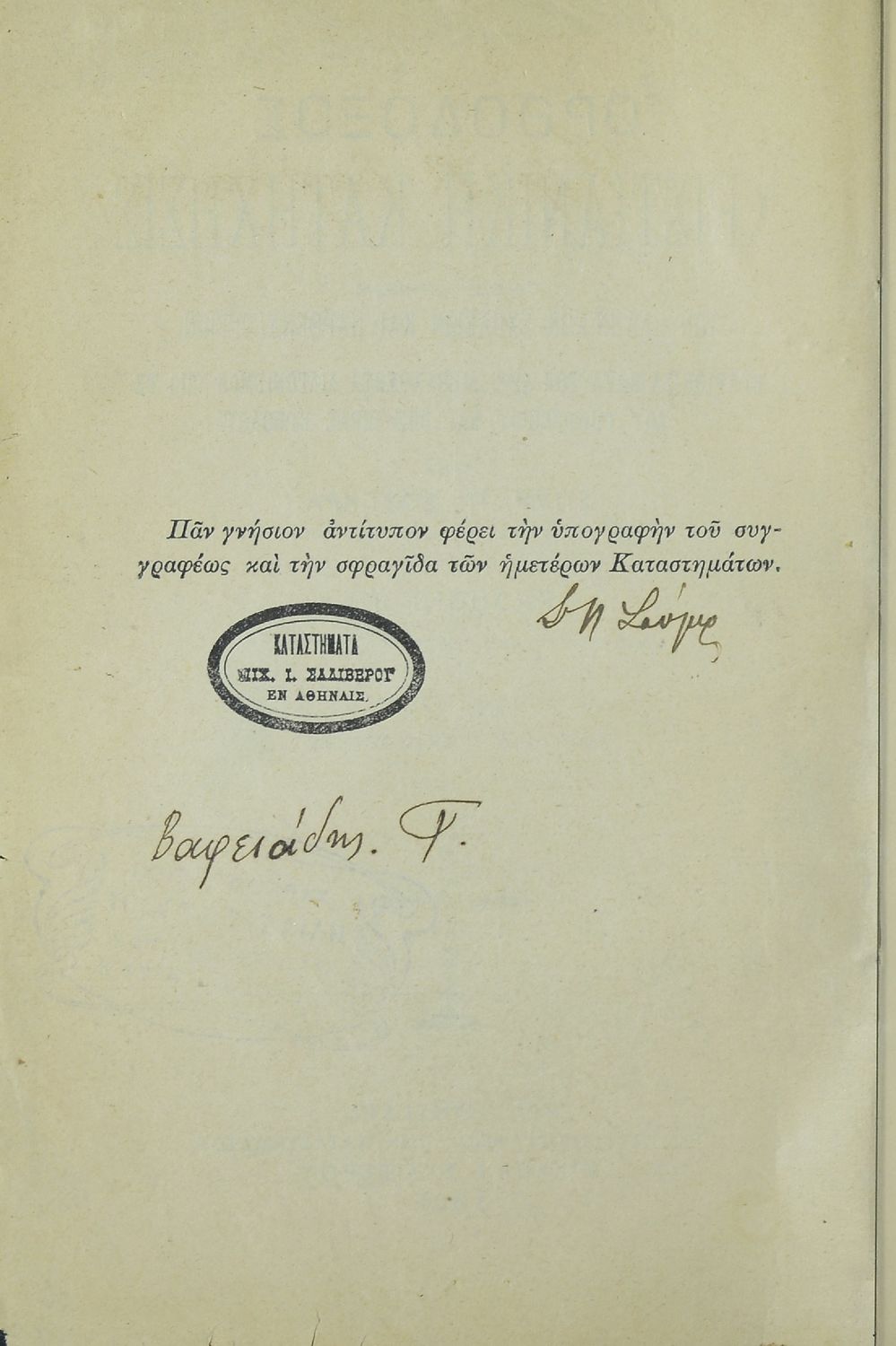 Εκδότης: Μιχαήλ Ι. Σαλίβερος Έτος έκδοσης: 1902 Τόπος έκδοσης: Αθήνα Έκδοση: 2η Υπουργική απόφαση / Σύμβαση: 9100/28-5-1901 Έτος έγκρισης: 1901 |