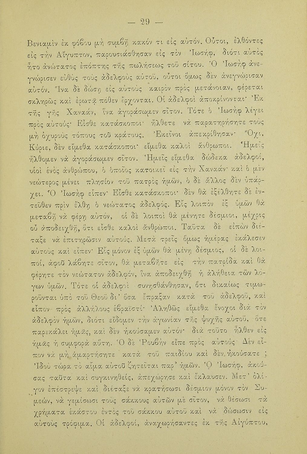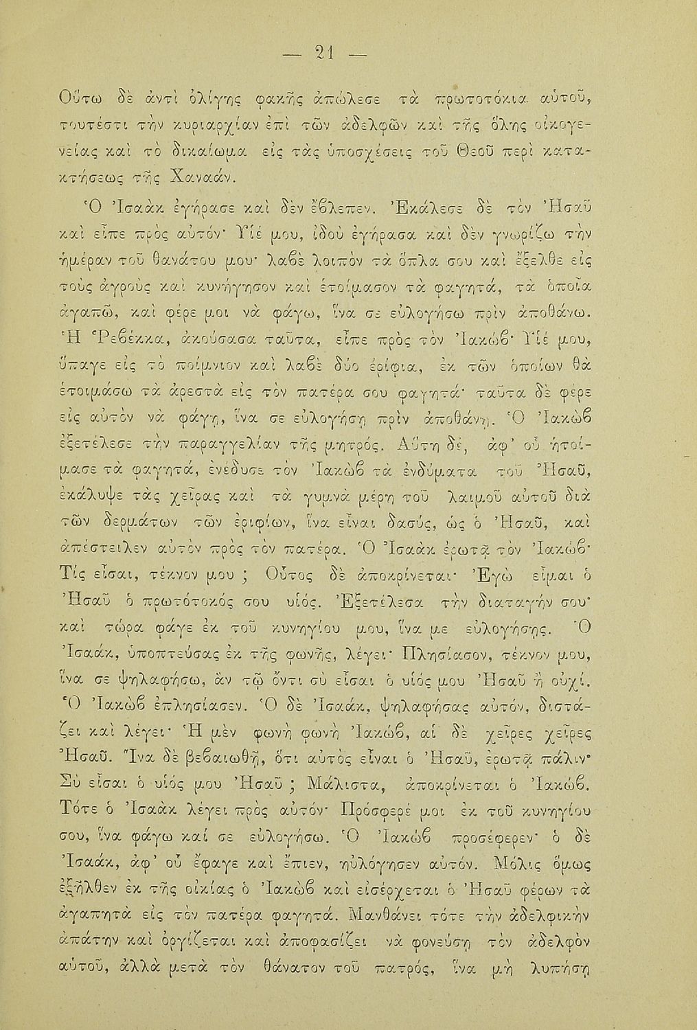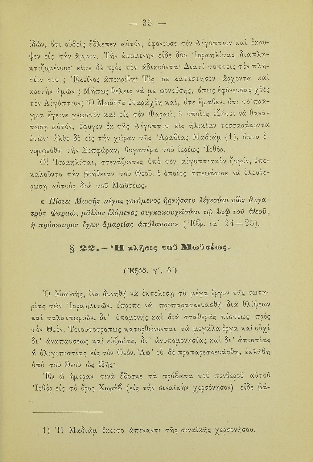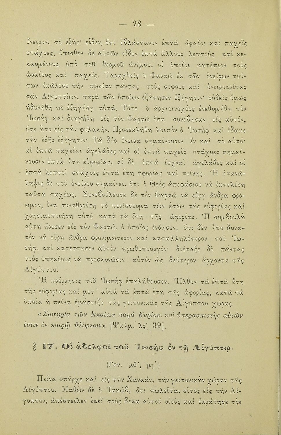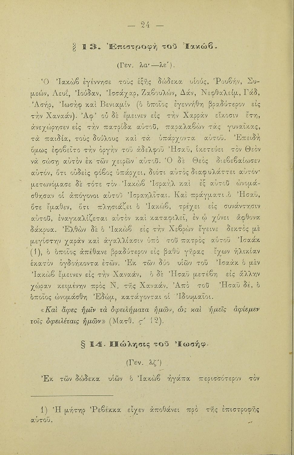 Σχολικό εγχειρίδιο Θρησκευτικών για τα Ελληνικά Σχολεία και Παρθεναγωγεία που περιλαμβάνει την ιστορία της Παλαιάς Διαθήκης από την δημιουργία του κόσμου μέχρι τους Μακκαβαίους και τον Ιωάννη τον Βαπτιστή.