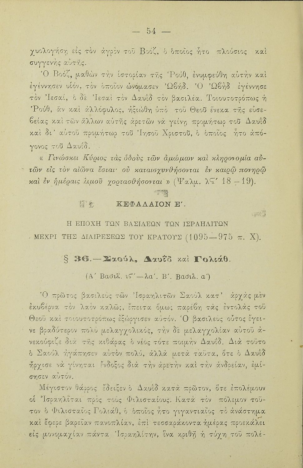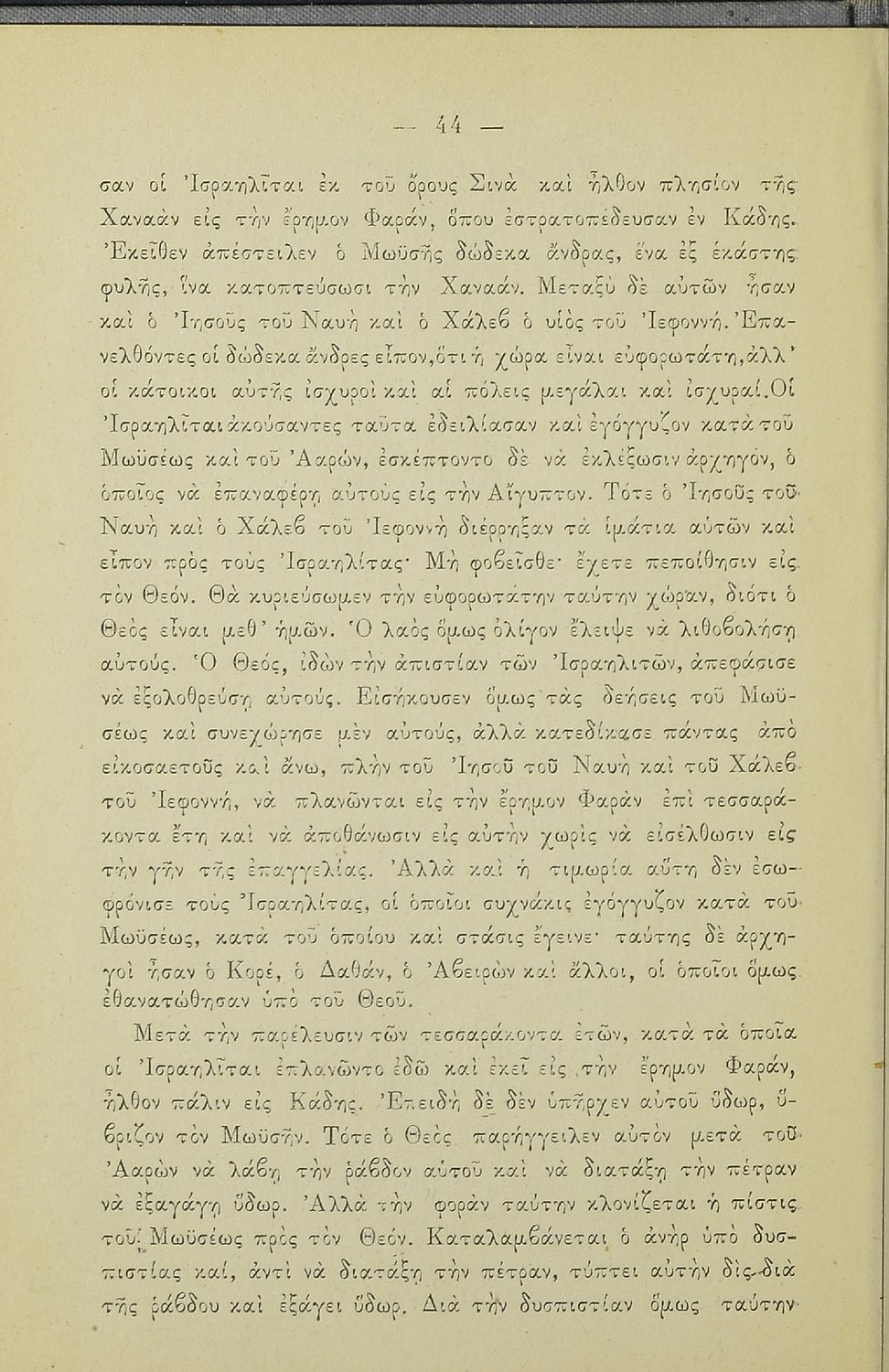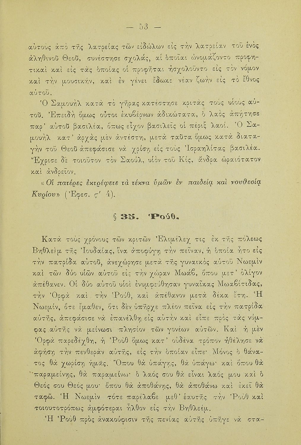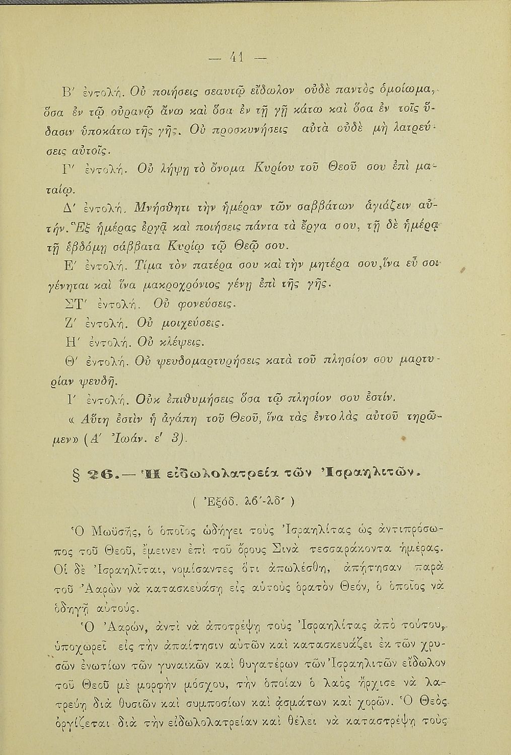 Σχολικό εγχειρίδιο Θρησκευτικών για τα Ελληνικά Σχολεία και Παρθεναγωγεία που περιλαμβάνει την ιστορία της Παλαιάς Διαθήκης από την δημιουργία του κόσμου μέχρι τους Μακκαβαίους και τον Ιωάννη τον Βαπτιστή.
