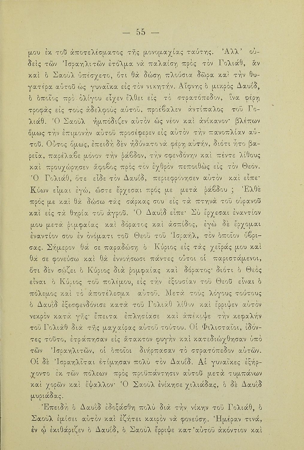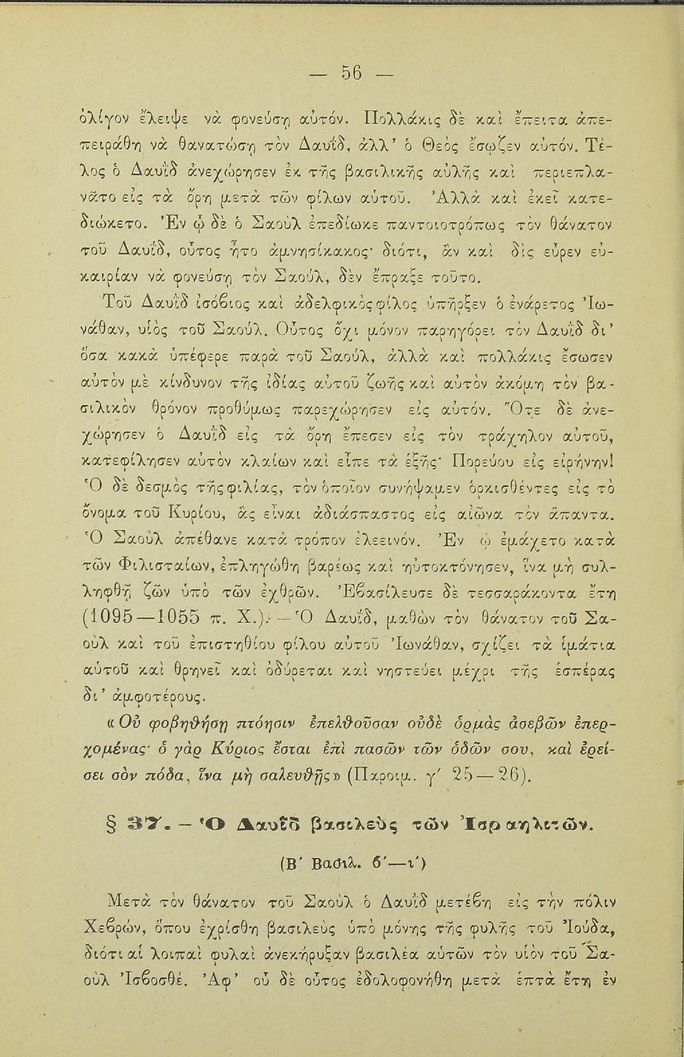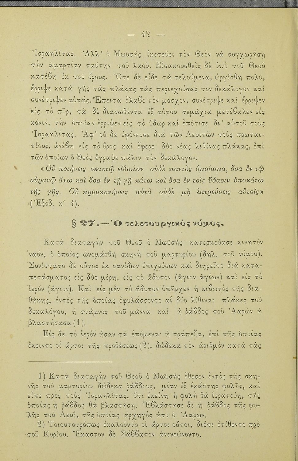 Σχολικό εγχειρίδιο Θρησκευτικών για τα Ελληνικά Σχολεία και Παρθεναγωγεία που περιλαμβάνει την ιστορία της Παλαιάς Διαθήκης από την δημιουργία του κόσμου μέχρι τους Μακκαβαίους και τον Ιωάννη τον Βαπτιστή.