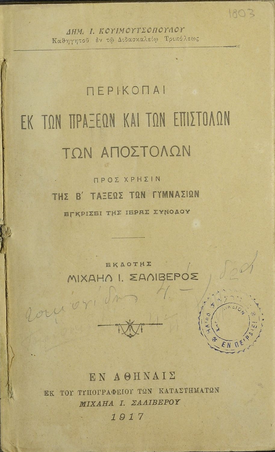 Εκδότης: Μιχαήλ Ι. Σαλίβερος Έτος έκδοσης: 1917 Τόπος έκδοσης: Αθήνα |