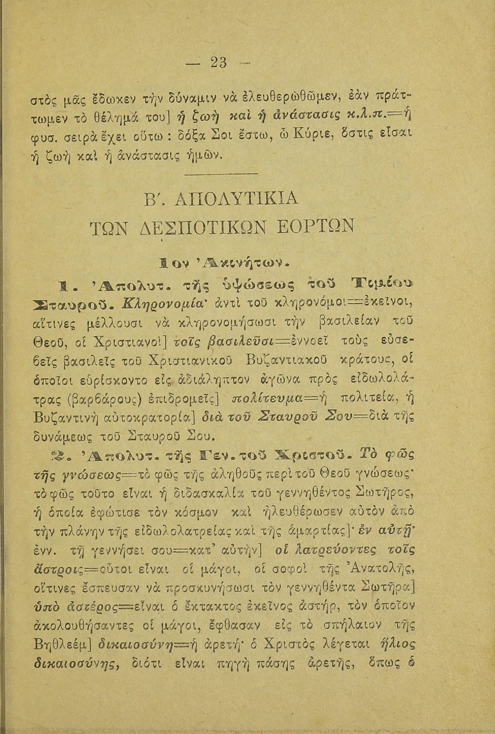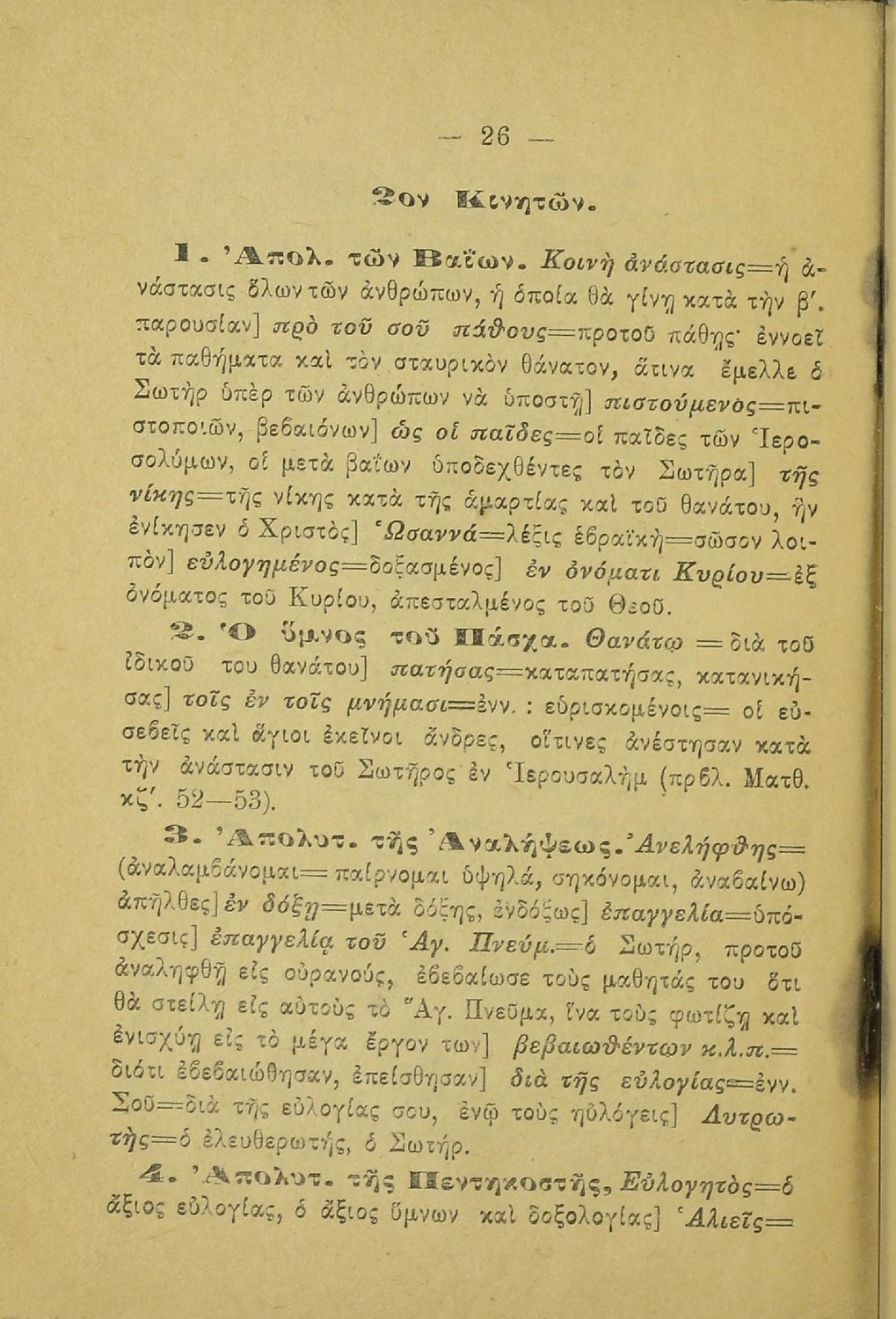 Κωδικός αναγνώρισης: 20-01804 Τίτλος: Απολυτίκια και αναστάσιμα εξαποστειλάρια δια την Β΄ τάξιν των Ελληνικών Σχολείων Συγγραφέας: Δημ. Ι. Κουϊμουτσόπουλος Μέγεθος και υπόστρωμα: Σχολικό εγχειρίδιο, 17εκ., μαλακό εξώφυλλο, 34 σελίδες. |