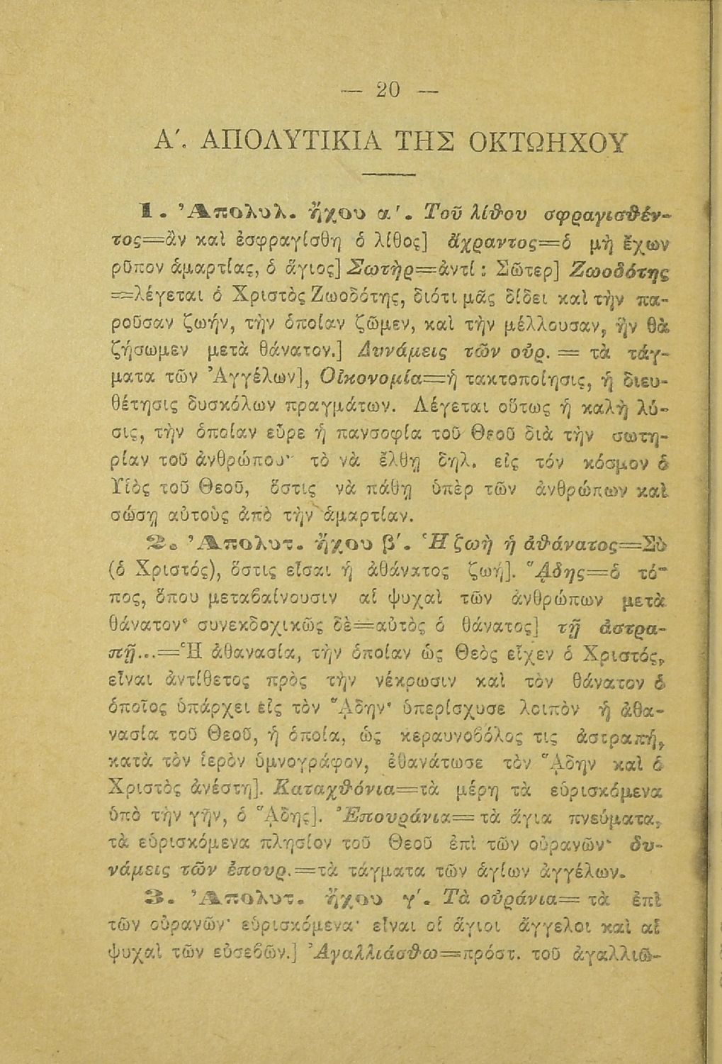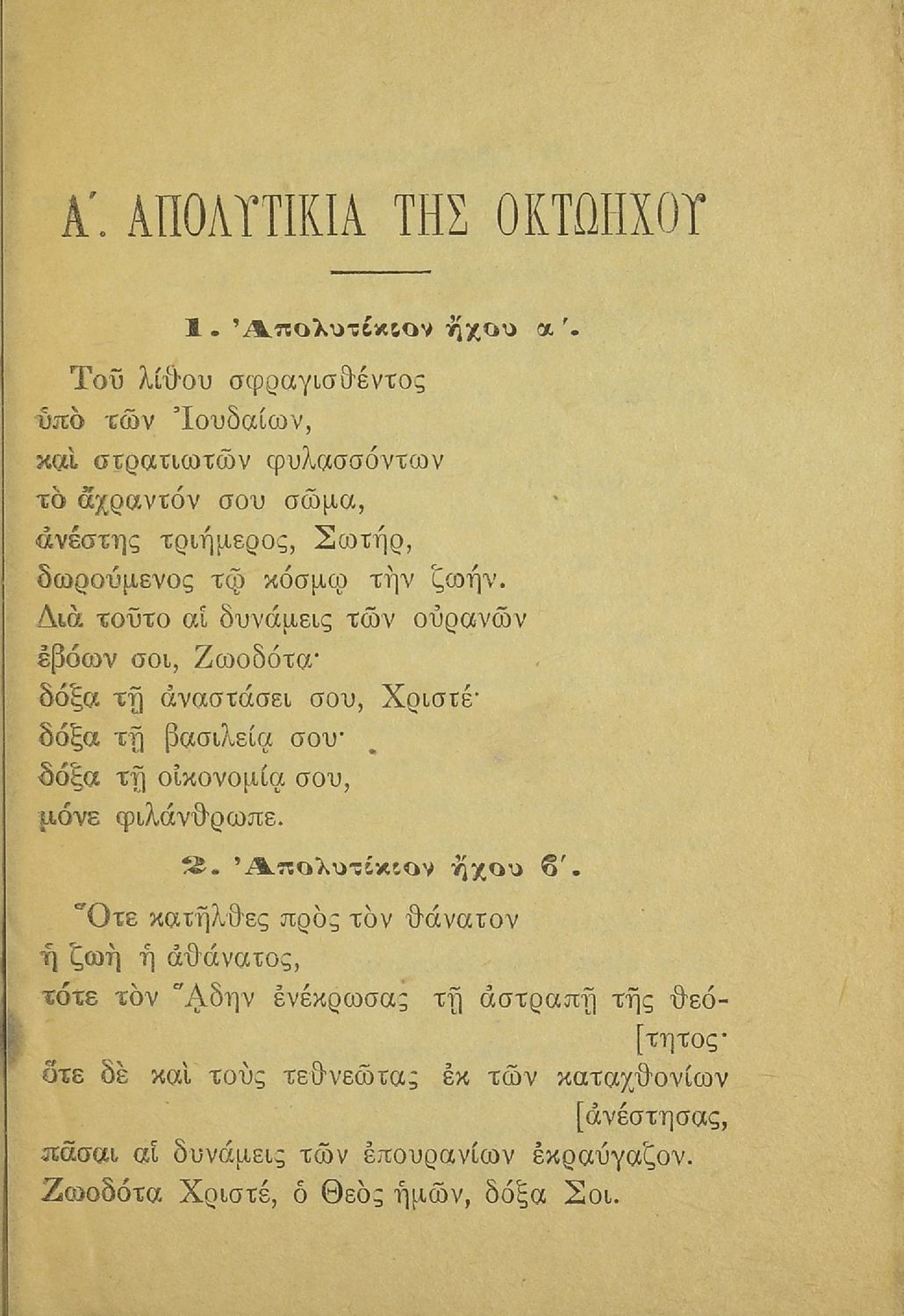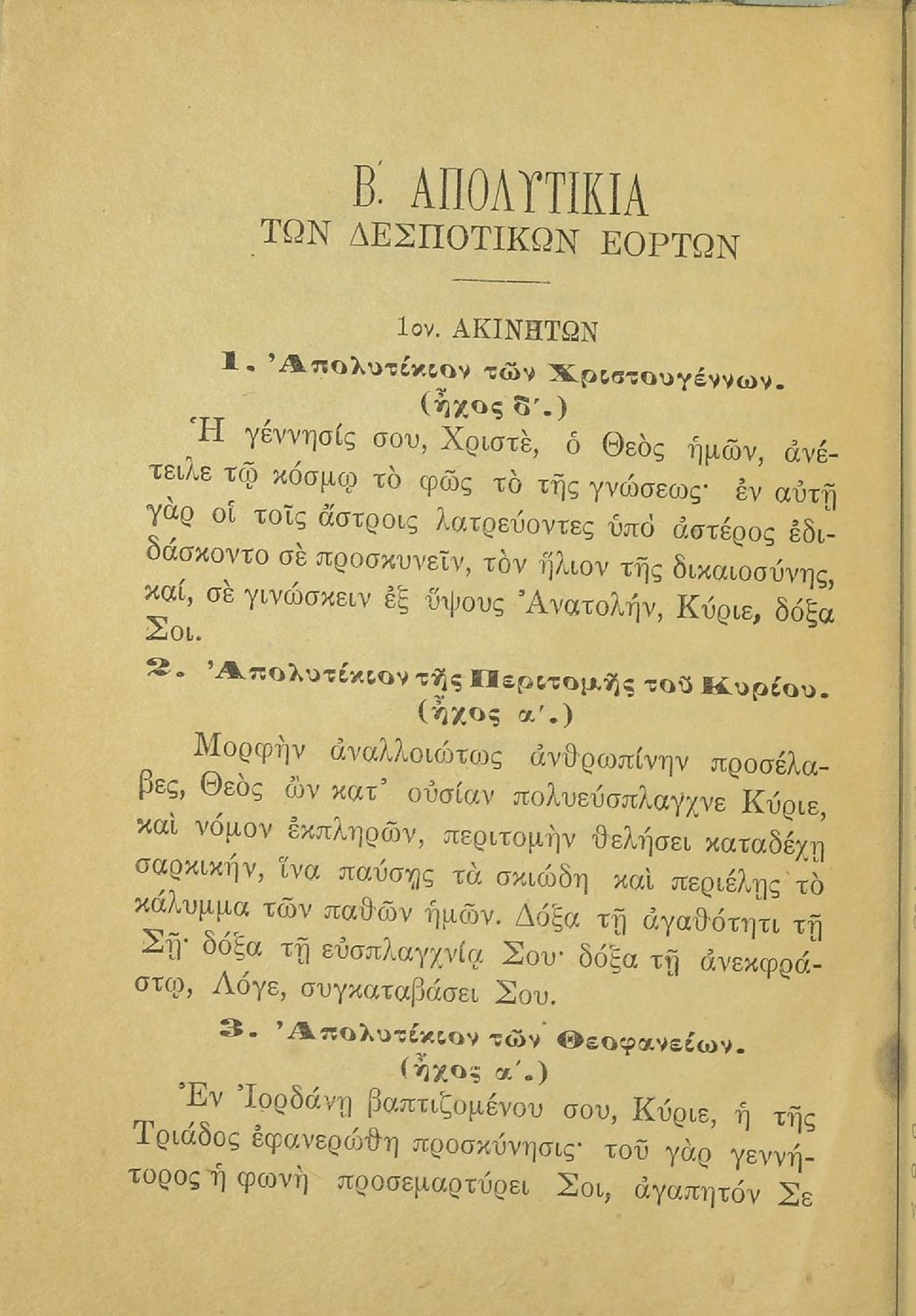 Σχολικό εγχειρίδιο Θρησκευτικών για τις Α΄, Β΄, Γ' Ελληνικού Σχολείου που περιλαμβάνει εισαγωγή στα απολυτίκια, απολυτίκια σε διάφορους ήχους και για διάφορες εορτές και ερμηνευτικές σημειώσεις