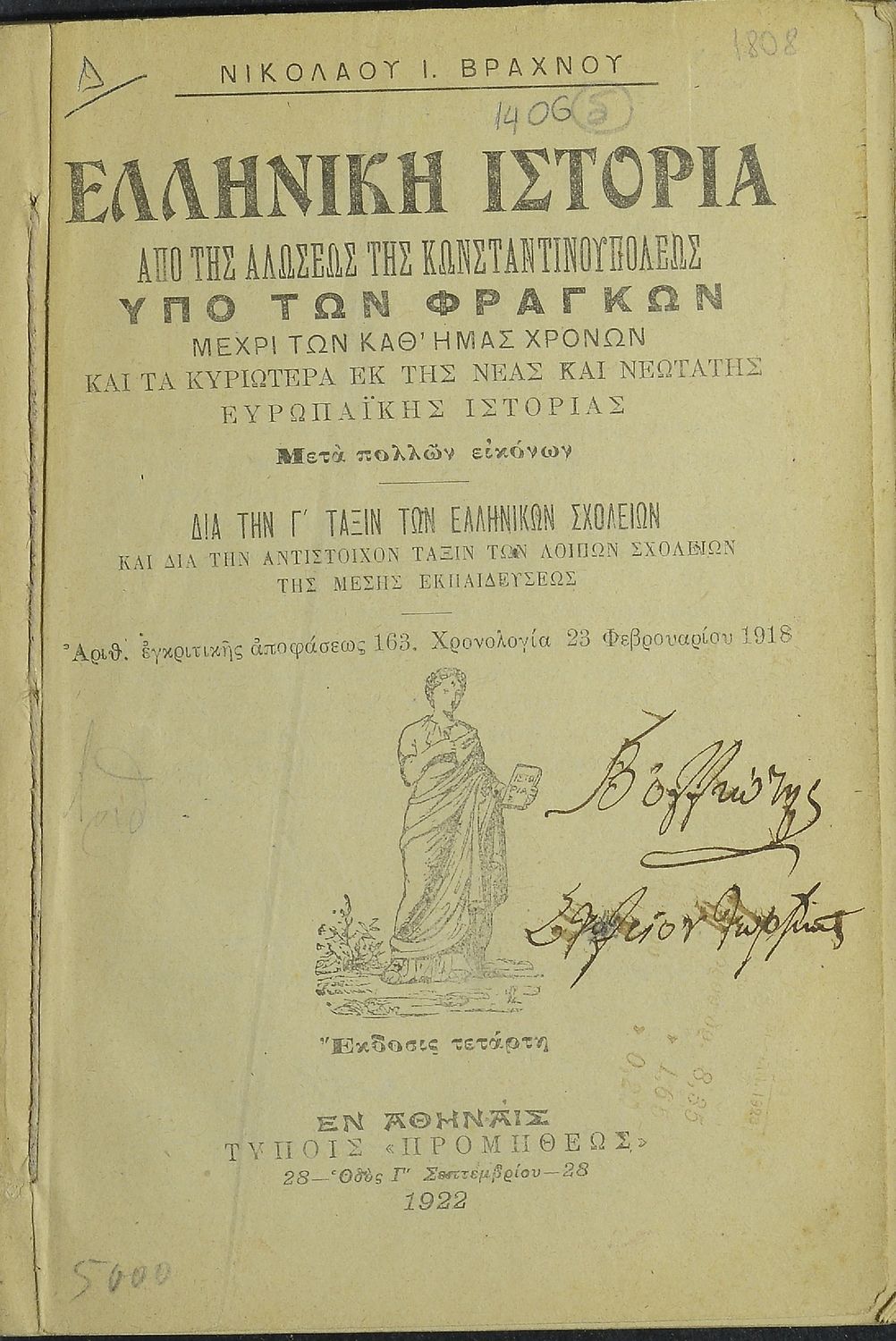 Κωδικός αναγνώρισης: 20-01808 Τίτλος: Ελληνική ιστορία από της Αλώσεως της Κωνσταντινουπόλεως υπό των Φράγκων μέχρι των καθ' ημάς χρόνων διά την τρίτην τάξιν των Ελληνικών Σχολείων και των αντιστοίχων των λοιπών σχολείων της Μέσης Εκπαιδεύσεως Συγγραφέας: Νικόλαος Ι. Βραχνός Μέγεθος και υπόστρωμα: Σχολικό εγχειρίδιο, 19εκ., μαλακό εξώφυλλο, 160 σελίδες. Σκίτσα (ασπρόμαυρα). |