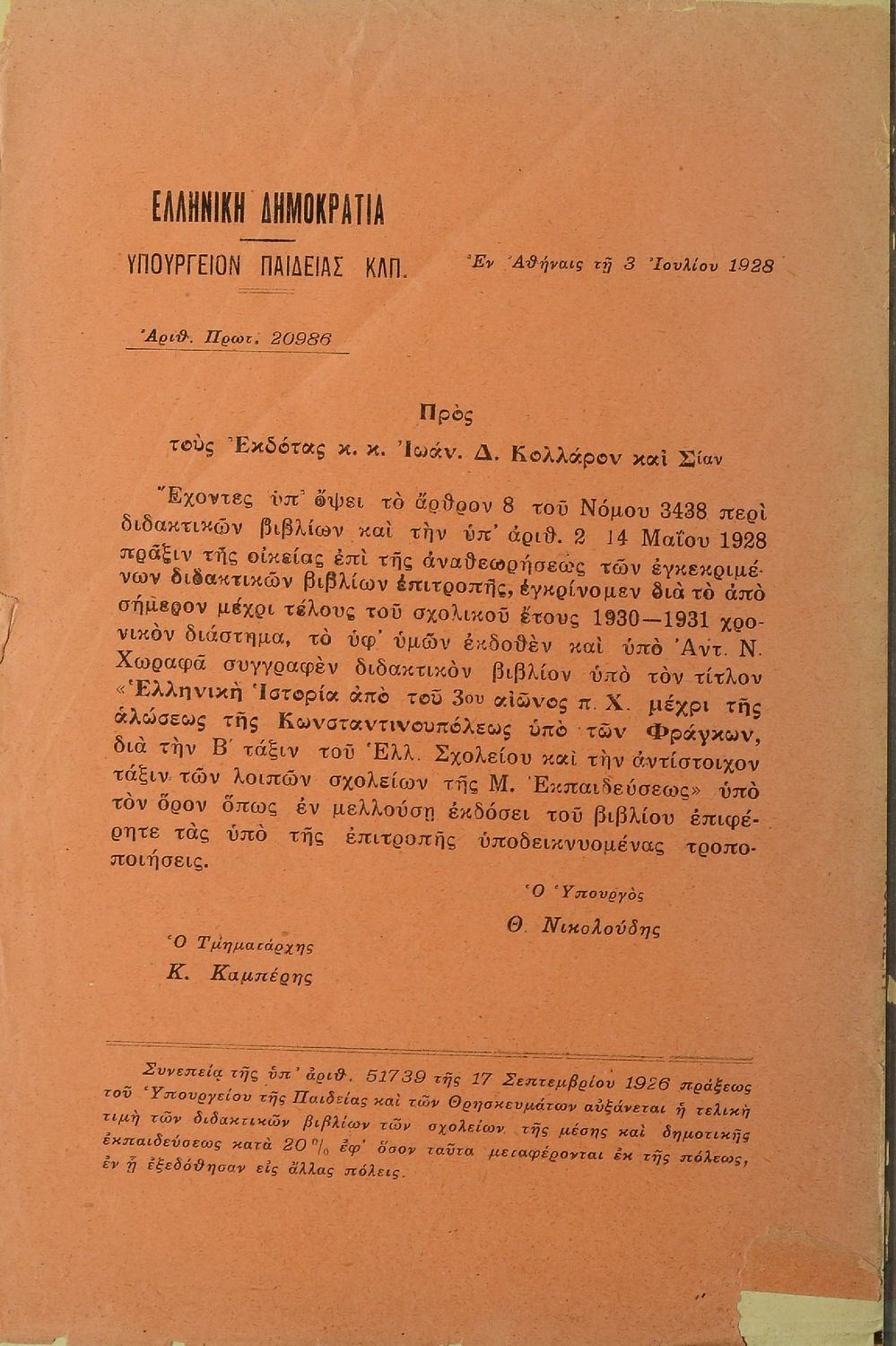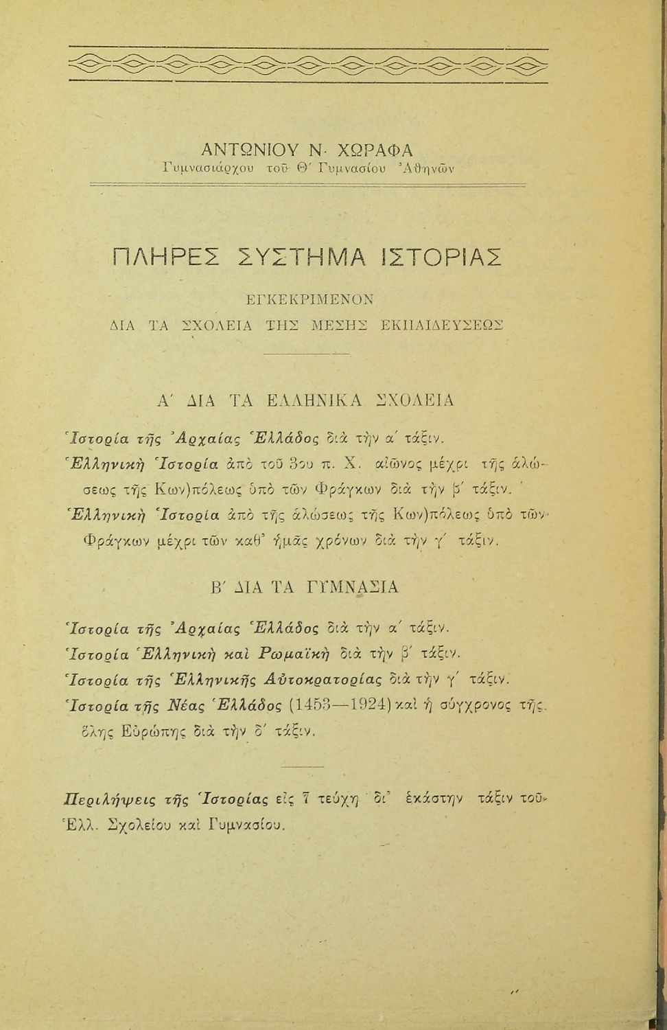 Τίτλος: Ελληνική ιστορία από του 3ου αιώνος π. Χ. μέχρι της Αλώσεως της Κωνσταντινουπόλεως υπό των Φράγκων διά την δευτέραν τάξιν των Ελληνικών Σχολείων και την αντίστοιχον των λοιπών σχολείων της Μέσης Εκπαιδεύσεως