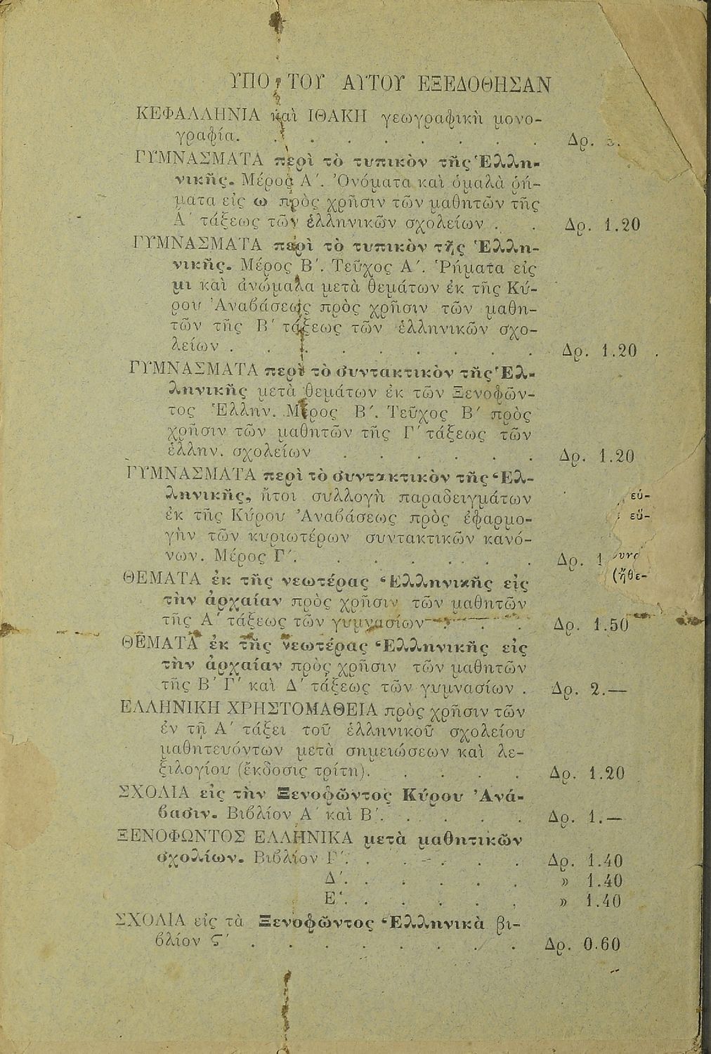 Κωδικός αναγνώρισης: 20-01815 Τίτλος: Θέματα εκ της νεωτέρας ελληνικής εις την αρχαίαν προς χρήσιν των μαθητών της Β΄, Γ΄, Δ΄ τάξεως των Γυμνασίων Συγγραφέας: Λ. Γ. Παπανδρέου Μέγεθος και υπόστρωμα: Σχολικό εγχειρίδιο, 20εκ., μαλακό εξώφυλλο, 171 σελίδες. |