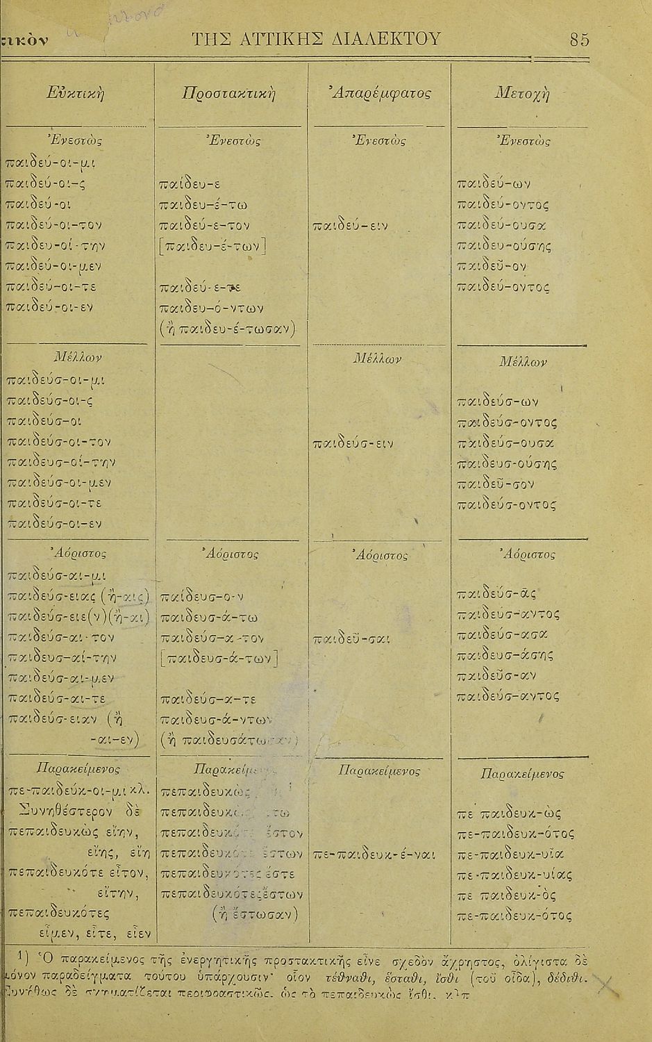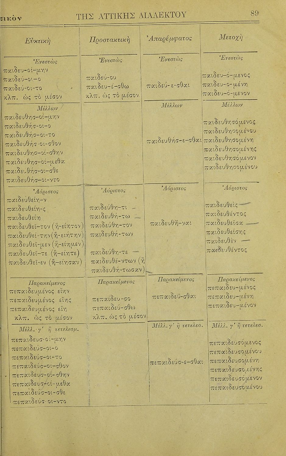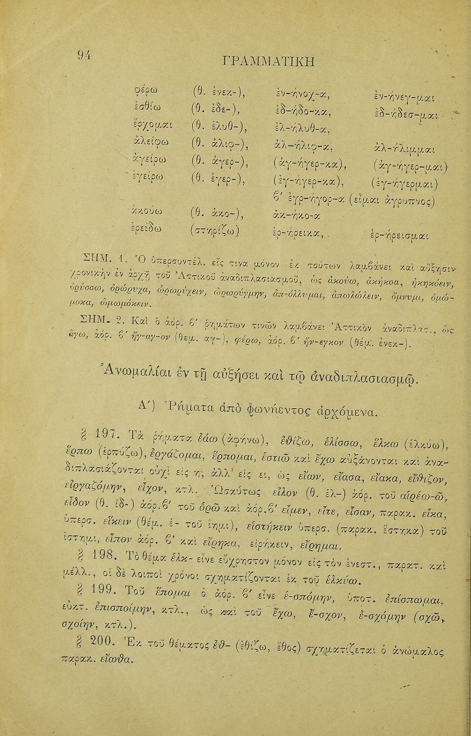 Μαθητικό βοήθημα Αρχαίων Ελληνικών για τα Γυμνάσια, Παρθεναγωγεία και Ελληνικά σχολεία το οποίο περιέχει κατάλογο ανωμάλων ρημάτων της Αττικής διαλέκτου.
