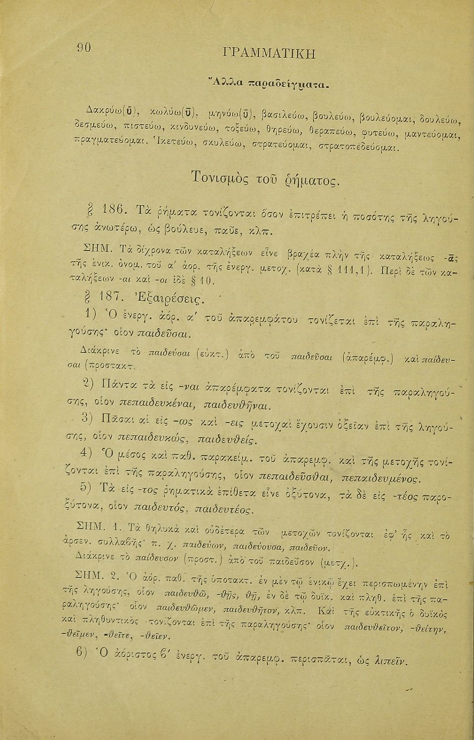 Σχολικό εγχειρίδιο Αρχαίων Ελληνικών για τα Ελληνικά Σχολεία και Παρθεναγωγεία που περιλαμβάνει κανόνες της γραμματικής της αρχαίας ελληνικής και είναι χωρισμένη στο φθογγολογικό και στο τυπολογικό μέρος.