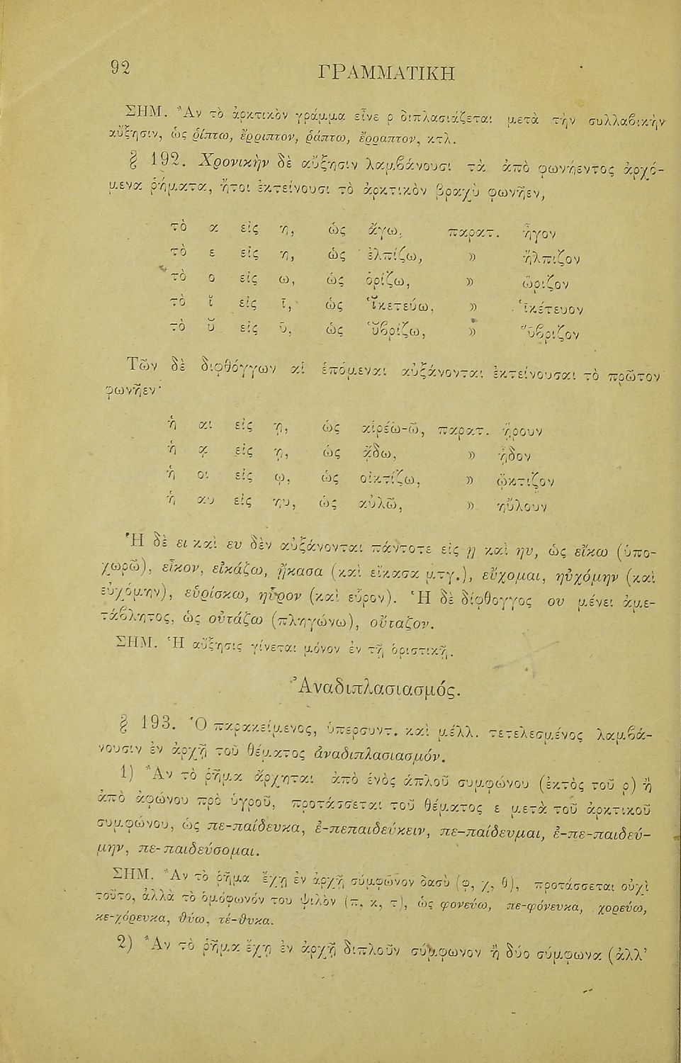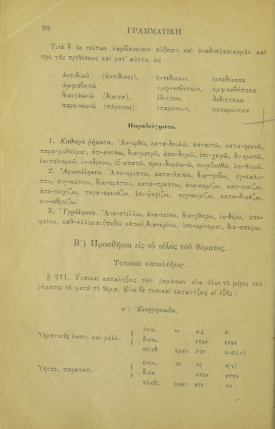 Σχολικό εγχειρίδιο Αρχαίων Ελληνικών για τα Ελληνικά Σχολεία και Παρθεναγωγεία που περιέχει τους κανόνες γραμματικής και είναι χωρισμένο σε φθογγολογικό, τυπολογικό και ετυμολογικό μέρος.