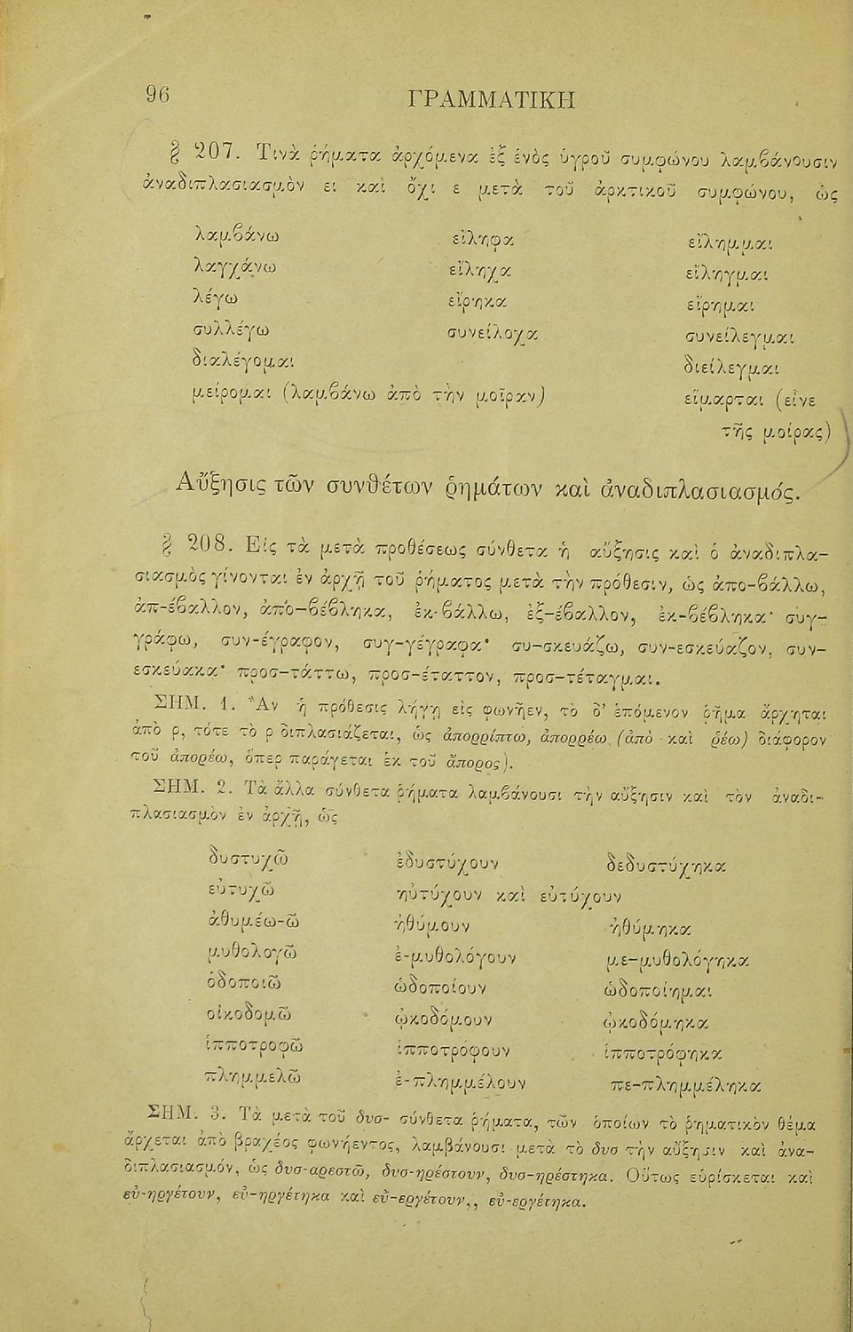 Μαθητικό βοήθημα Αρχαίων Ελληνικών για τα Ελληνικά Σχολεία, Παρθεναγωγεία και Γυμνάσια που περιλαμβάνει γραμματική της αρχαίας ελληνικής και κατάλογο ανωμάλων ρημάτων.