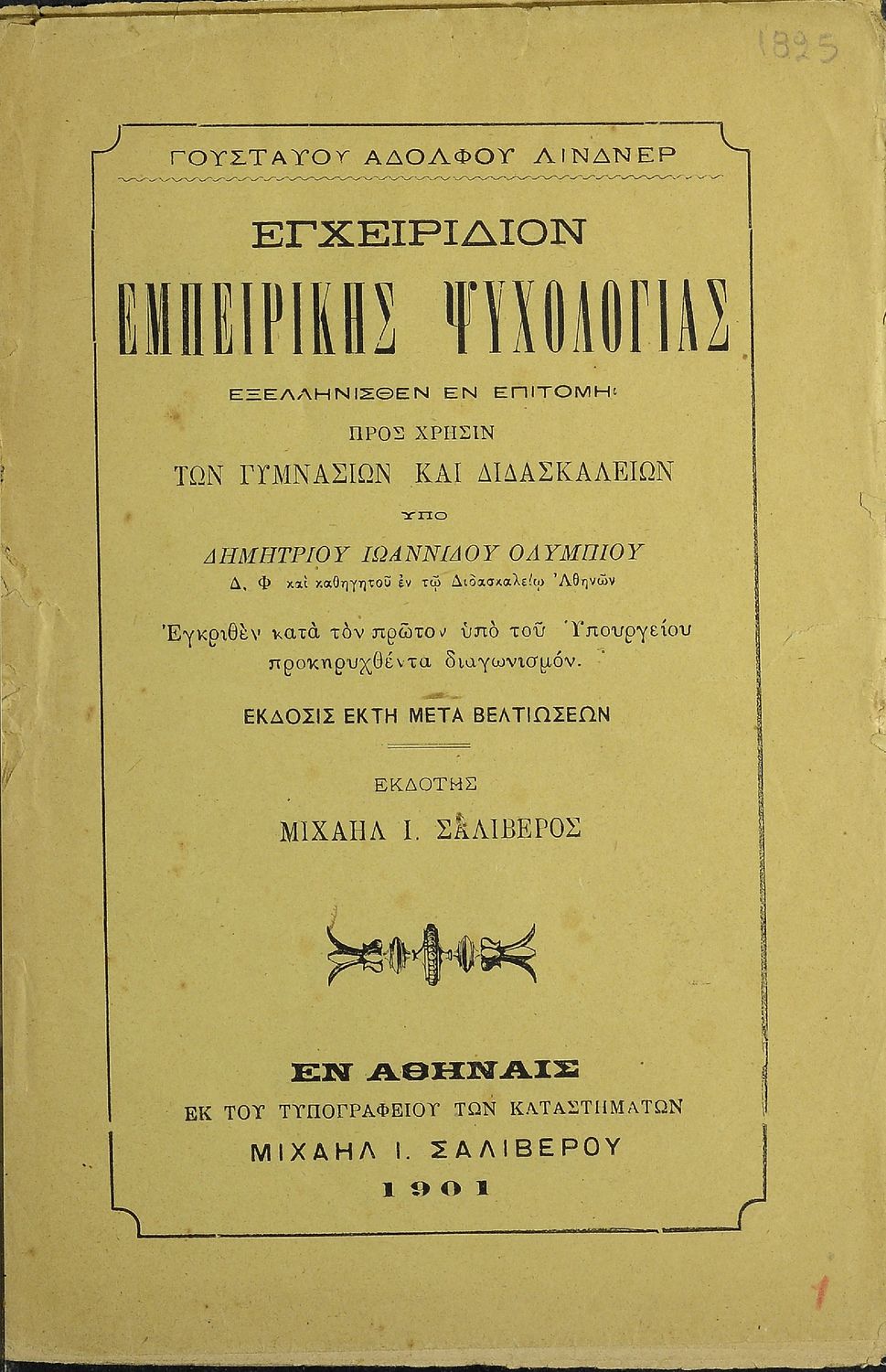 LDR 01208 2200205 4500 035 ## _a20-01825 040 ## _aΚΕΝΕΚ - Εταιρεία Σπουδών Νεοελληνικού Πολιτισμού και Παιδείας 041 ## _ael 100 ## _aΓουσταύος Αδόλφος Λίνδνερ (Gustav Adolf Lindner) _aΔημήτριος Ιωαννίδης Ολύμπιος (μετάφραση) 110 ## _a1825 245 0# _aΕγχειρίδιον εμπειρικής ψυχολογίας προς χρήσιν των Γυμνασίων και διδασκαλείων 250 ## _a6η Έκδοση 260 ## _aΑθήνα _bΜιχαήλ Ι. Σαλίβερος _c1901 300 ## _a96 _c21 520 ## _aΣχολικό εγχειρίδιο Ψυχολογίας για τα Γυμνάσια και Διδασκαλεία χωρισμένο σε τρία τμήματα: το γνωστικό, το συναισθηματικό και το βουλητικό. 521 ## _aΓυμνάσιο / Διδασκαλείο 522 ## _aΕλλάδα 546 ## _aΚαθαρεύουσα 563 ## _aΜαλακό Εξώφυλλο 650 #4 _aΑυτοσυνειδησία _aΔιάνοια _aΠαραστάσεις