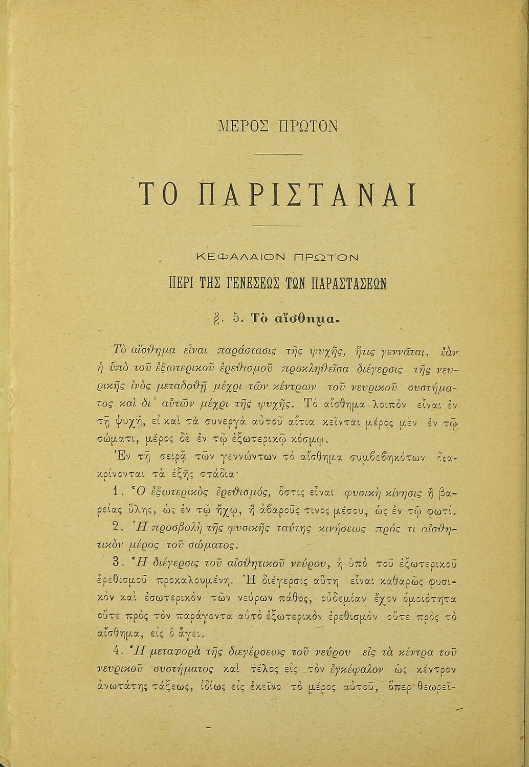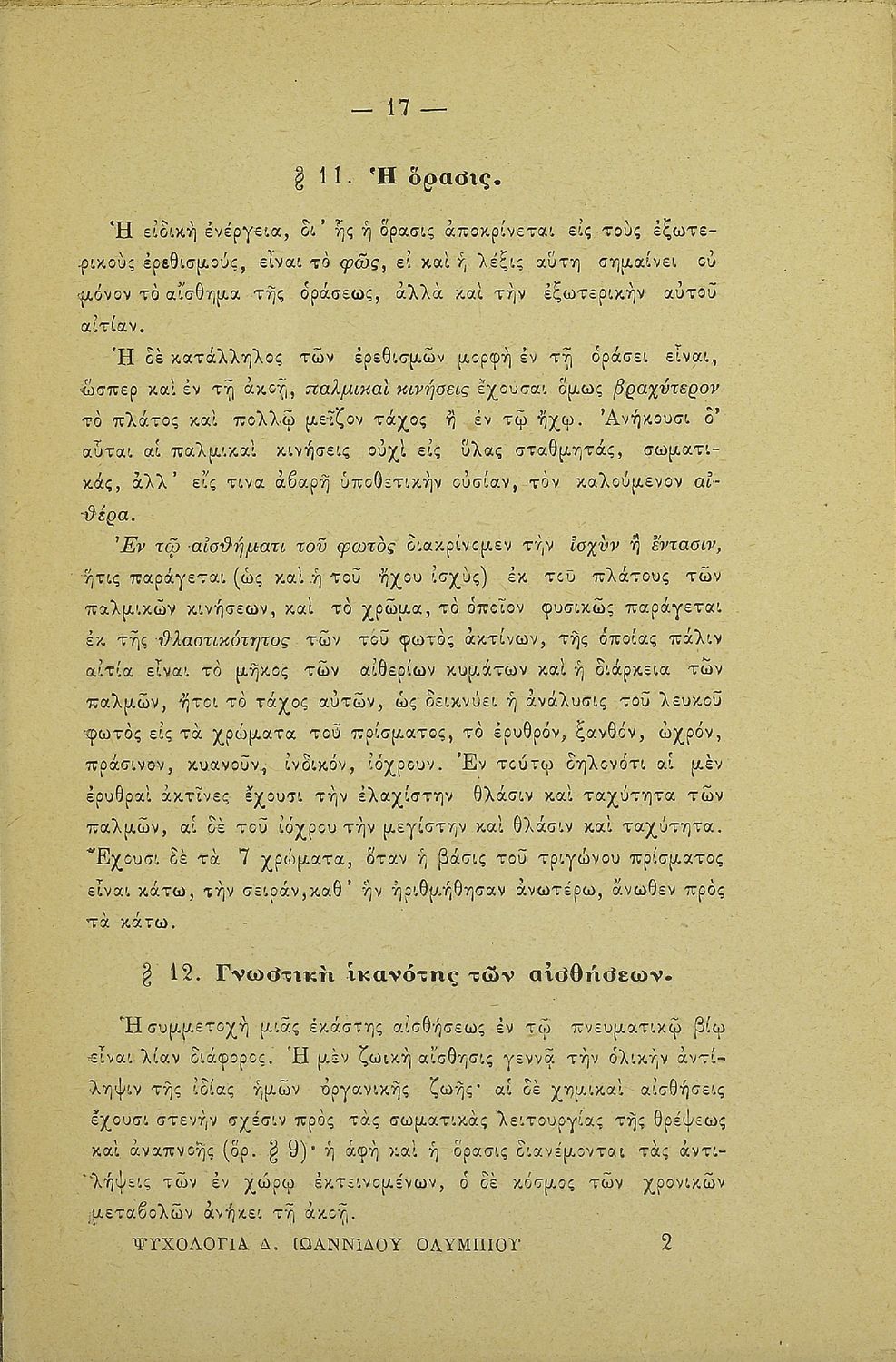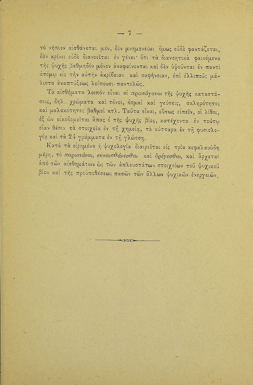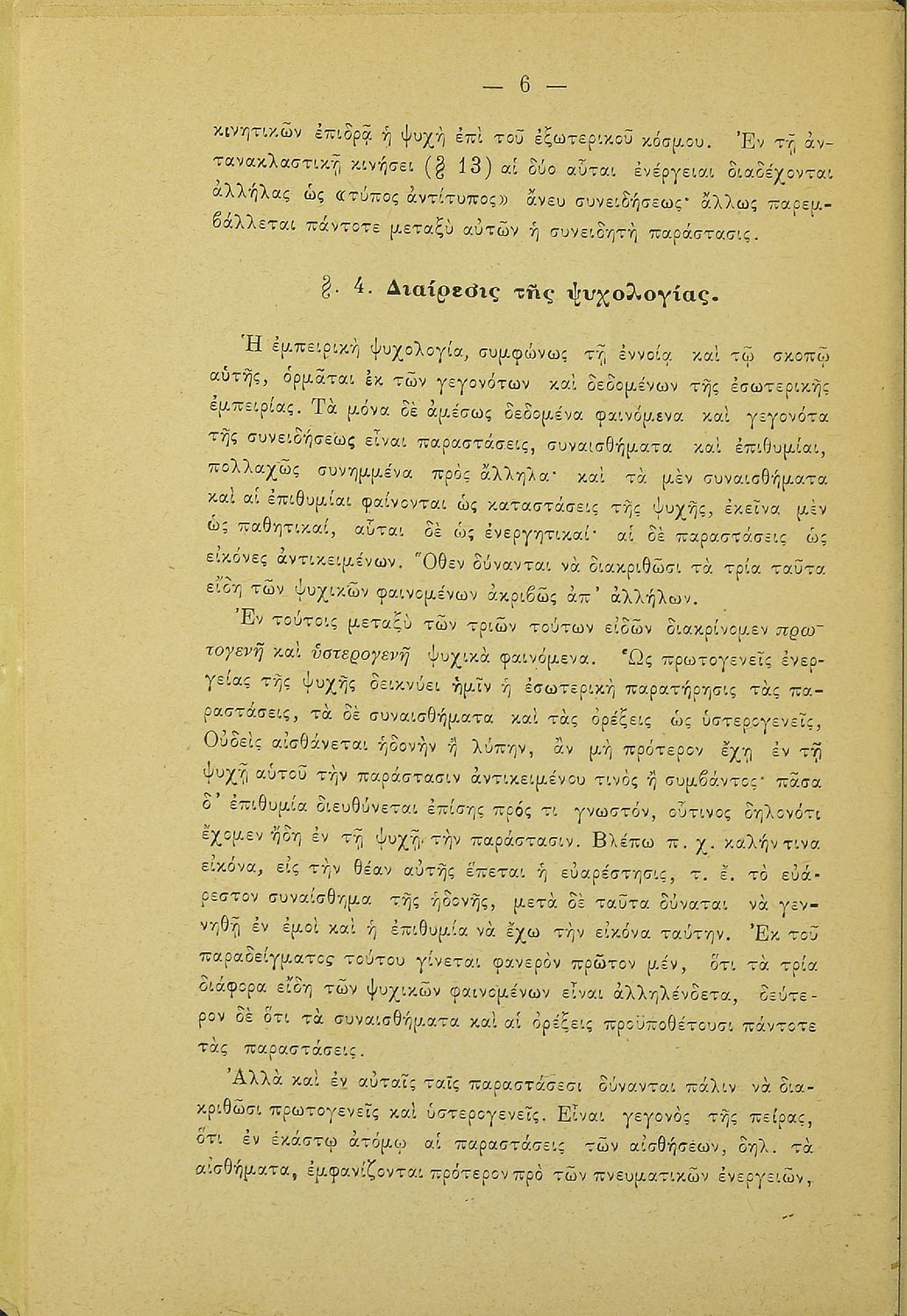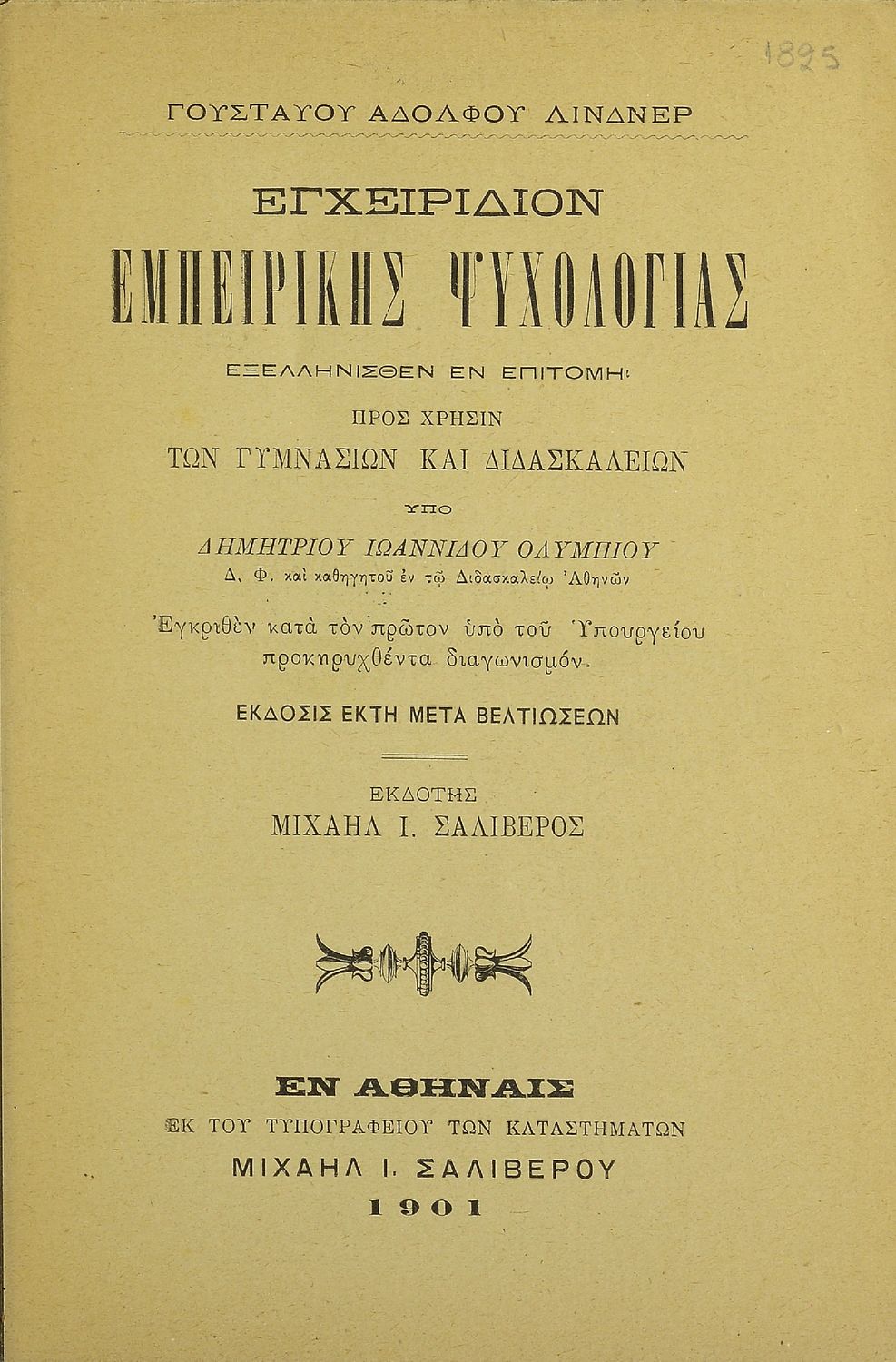 Βαθμίδα εκπαίδευσης: Δευτεροβάθμια Τάξη: Γυμνάσιο / Διδασκαλείο Μάθημα: Ψυχολογία Γλώσσα: Καθαρεύουσα Παρουσίαση περιεχομένου: Σχολικό εγχειρίδιο Ψυχολογίας για τα Γυμνάσια και Διδασκαλεία χωρισμένο σε τρία τμήματα: το γνωστικό, το συναισθηματικό και το βουλητικό. |