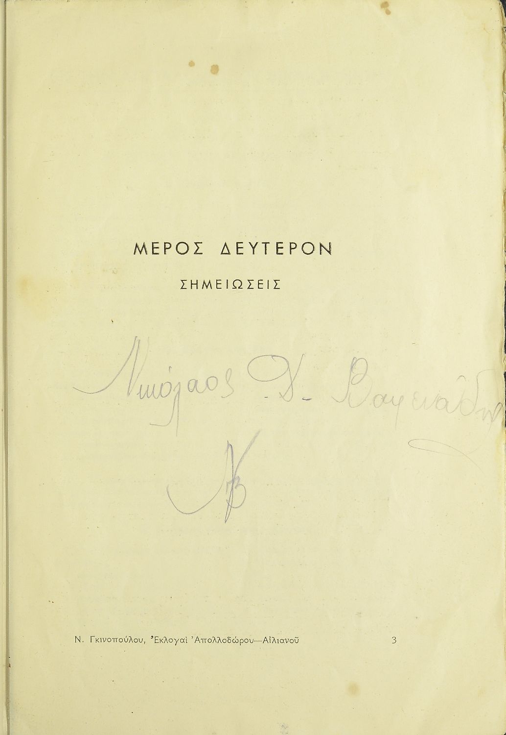 Τίτλος: Εκλογαί εκ της Απολλοδώρου Βιβλιοθήκης και της Αιλιανού Ποικίλης Ιστορίας διά τους μαθητάς της πρώτης τάξεως των Γυμνασίων και Ημιγυμνασίων μετά σημειώσεων λεξικολογικών, γραμματικών, πραγματικών κλπ.