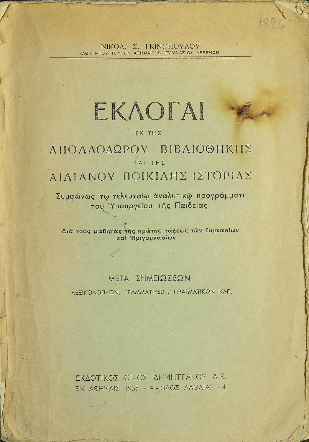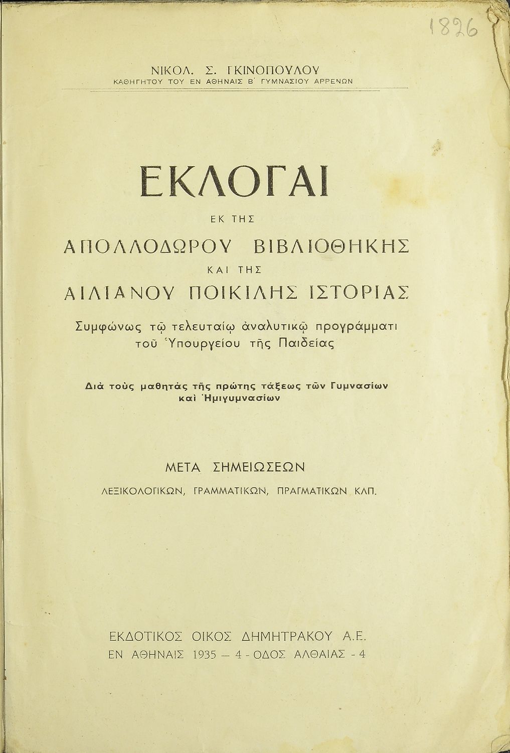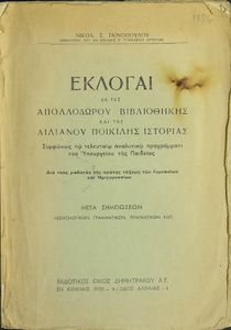 Βαθμίδα εκπαίδευσης: Δευτεροβάθμια Τάξη: Α' Γυμνασίου Μάθημα: Αρχαία Ελληνικά Γλώσσα: Καθαρεύουσα Παρουσίαση περιεχομένου: Σχολικό εγχειρίδιο Αρχαίων Ελληνικών Α΄ Γυμνασίου που περιλαμβάνει εισαγωγή στη ζωή και το έργο των Απολλόδωρου και Αιλιανού, αποσπάσματα από τη Βιβλιοθήκη του Απολλόδωρου και την Ποικίλη Ιστορία του Αιλιανού και ερμηνευτικές παρατηρήσεις και σχόλια. |