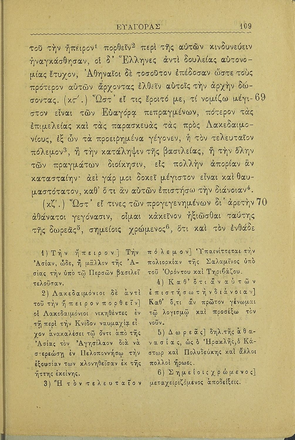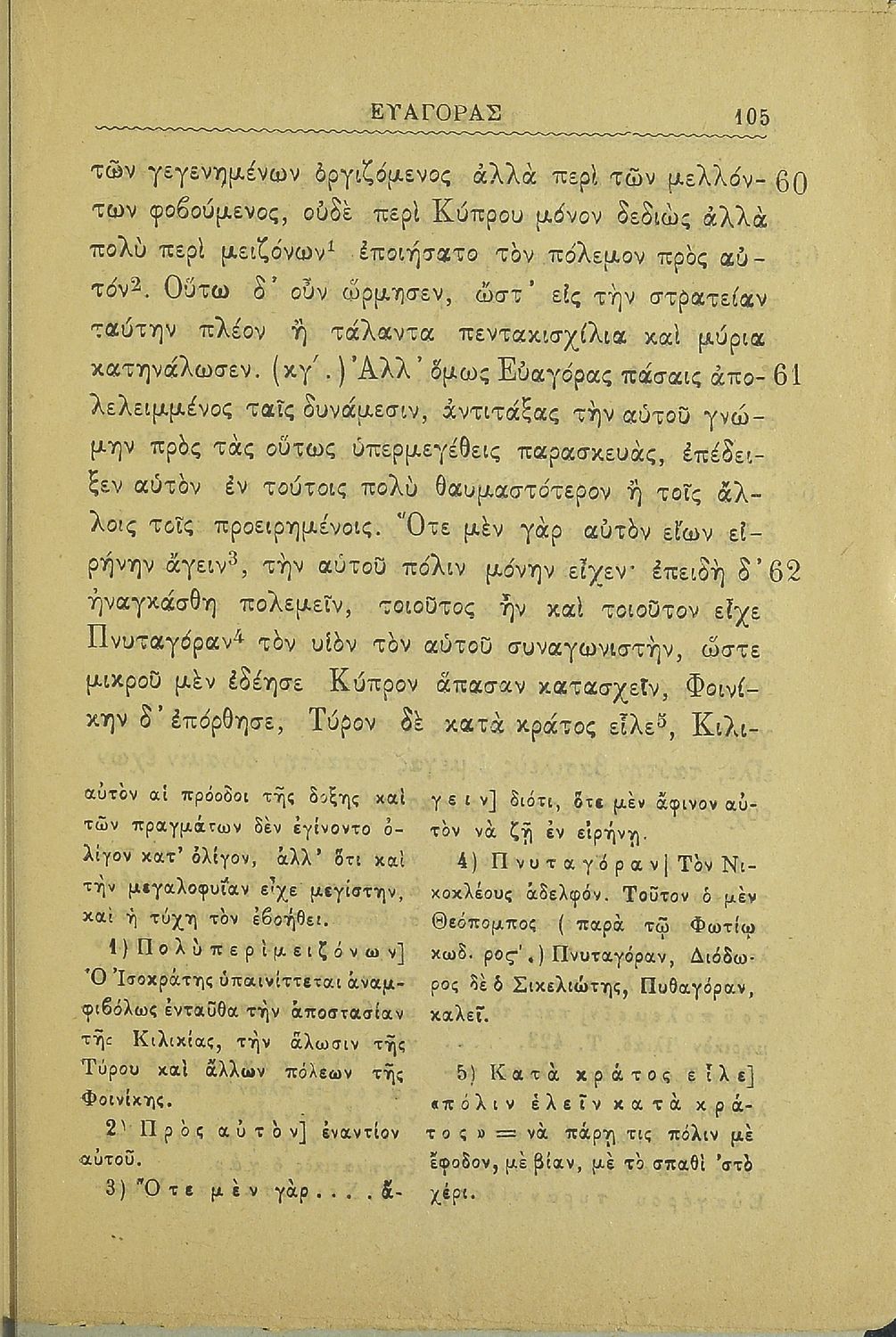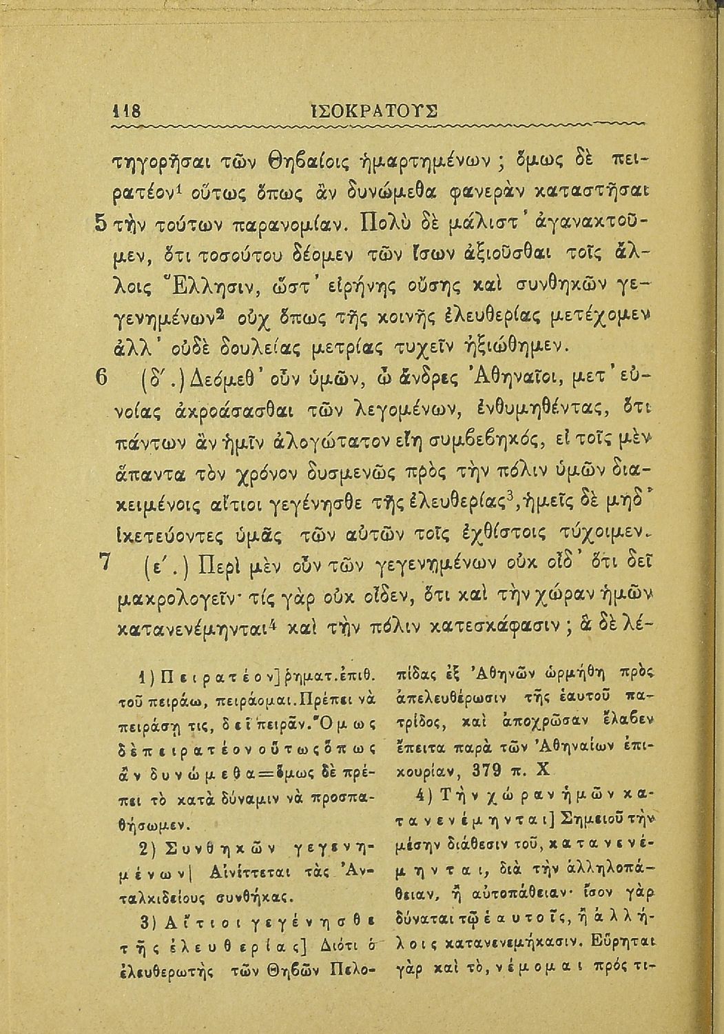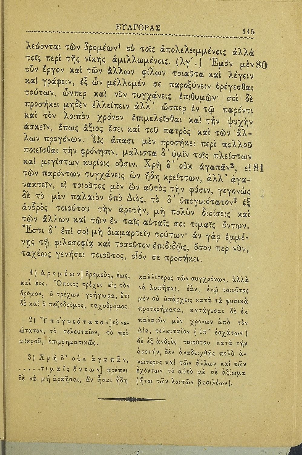 Σχολικό εγχειρίδιο Αρχαίων Ελληνικών Α΄ Γυμνασίου που περιλαμβάνει τους λόγους του Ισοκράτη Περί ειρήνης, Ευαγόρας και Πλαταϊκός και ερμηνευτικά και πραγματολογικά σχόλια.