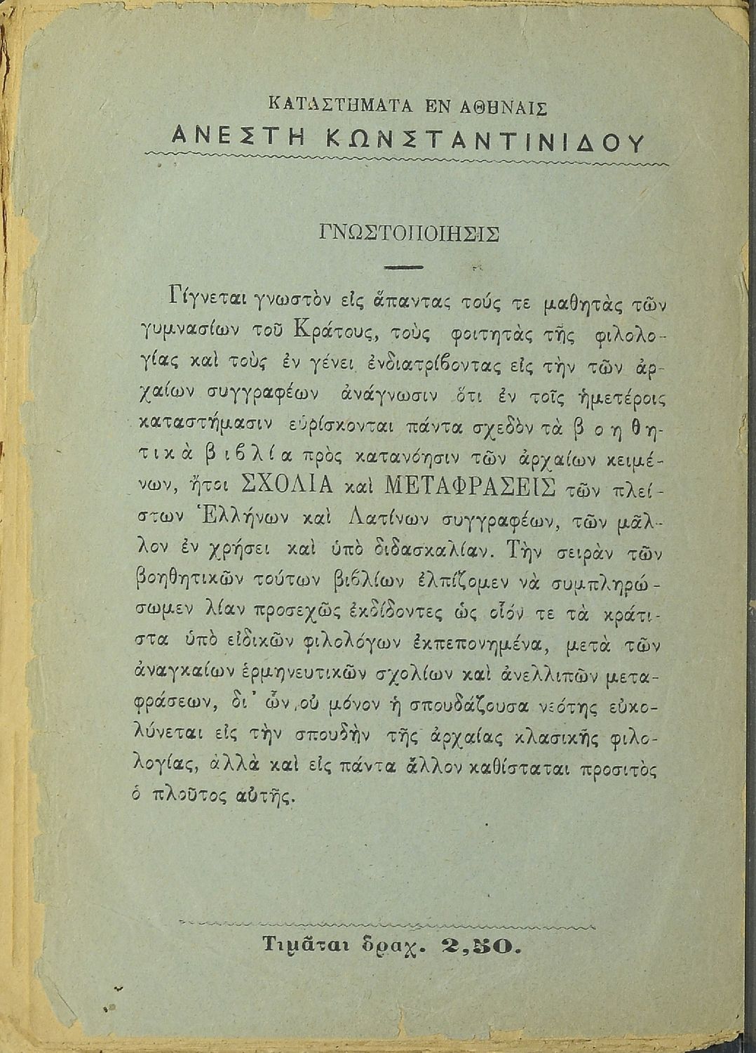 Σχολικό εγχειρίδιο Αρχαίων Ελληνικών για τα Ελληνικά Σχολεία και Παρθεναγωγεία που περιέχει αποσπάσματα από τα έργα του Ξενοφώντα Ελληνικά (βιβλία Α΄ και Β΄ ) και Κύρου Παιδεία, σημειώσεις και ερμηνευτικά ...
